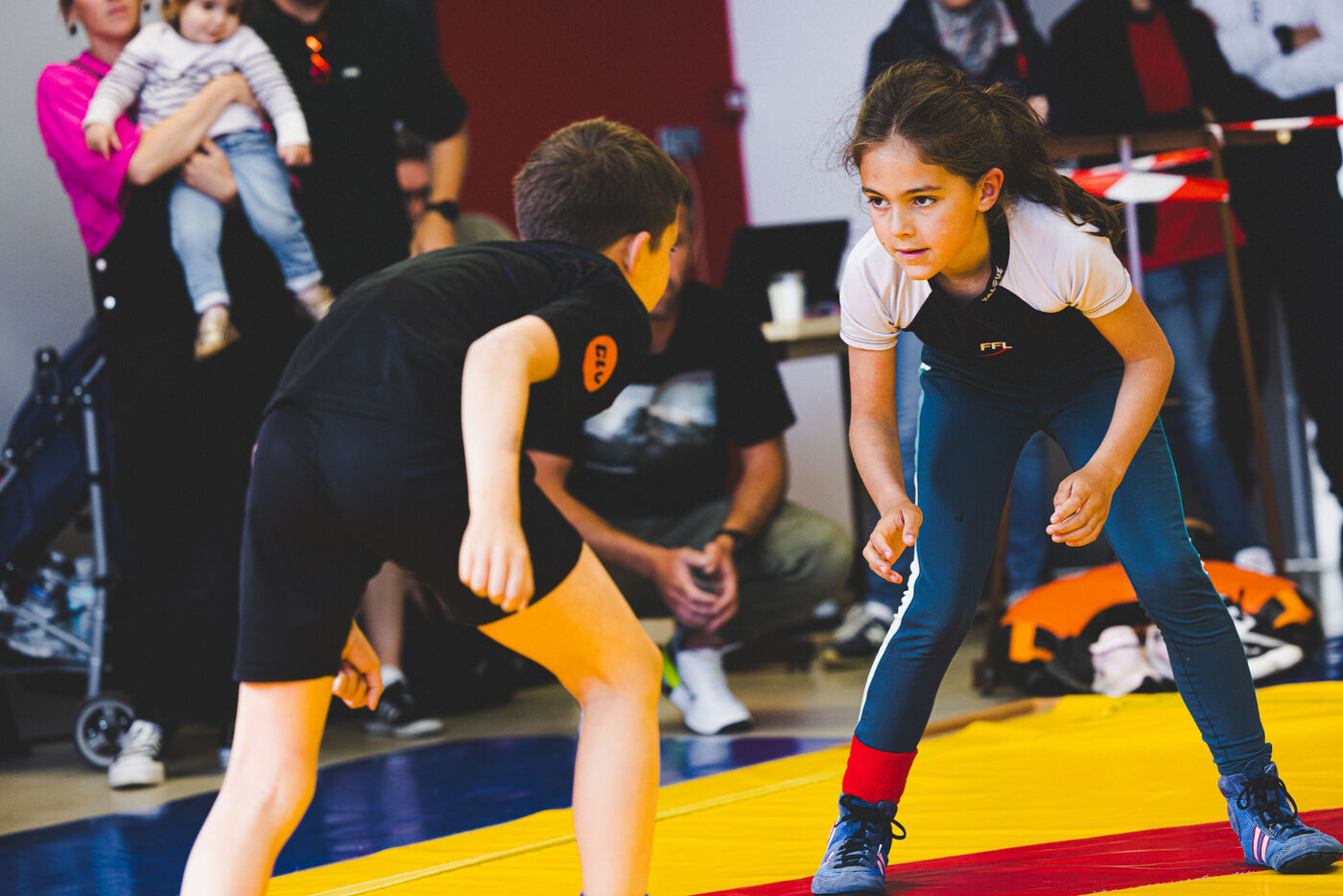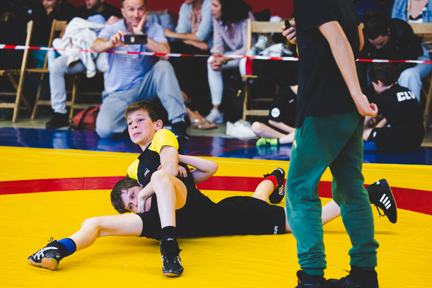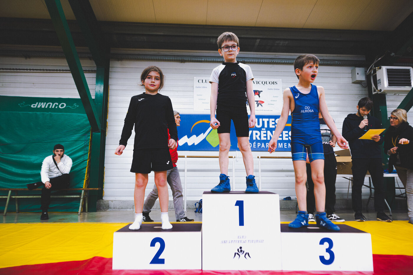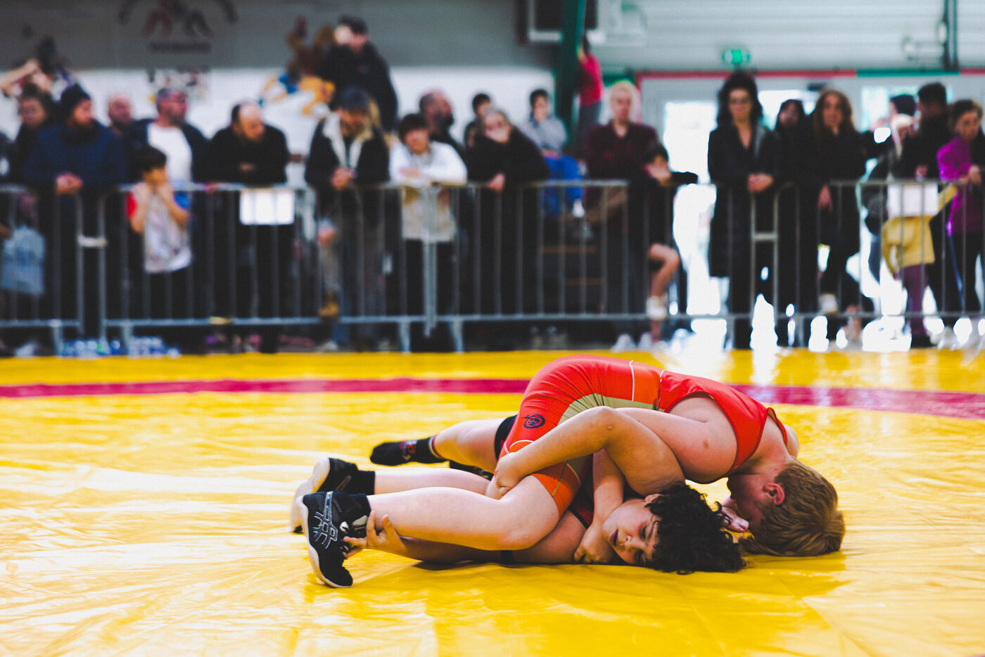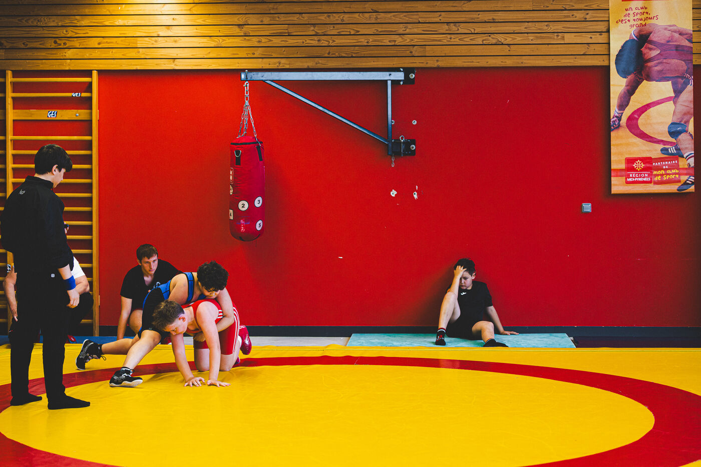 This series shows various wrestling competitions in Bigorre, South-West of France. Maubourguet and Vic-en-Bigorre Wrestling Club hosted competitions bringing together around one hundred junior wrestlers from clubs in Occitanie, including Montauban, Toulouse, Tarbes, Maubourguet, and Vic-en-Bigorre. Girls and boys competed in often spectacular mixed matches in front of their families. This sport, which attracts a diverse audience in Occitanie, benefits from the experience and wrestling culture of coaches of Chechen origin. The development of the Bigourdane school of wrestling is greatly indebted to the late Charly Cancel, a national referee and regional and departmental wrestling administrator, whose sons have continued his work in the Bigorre region.