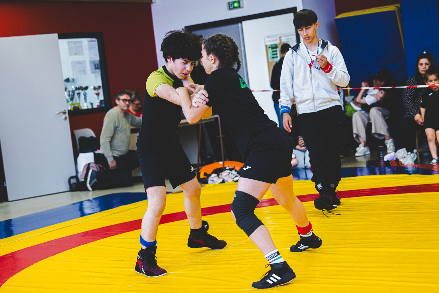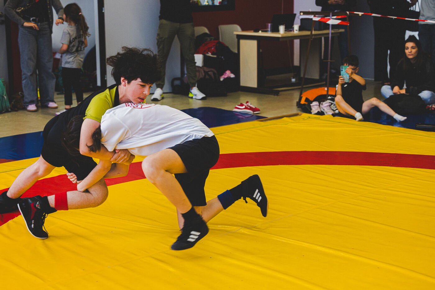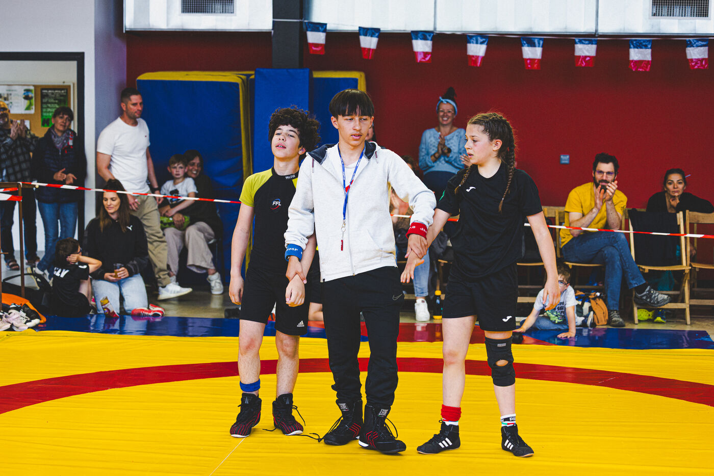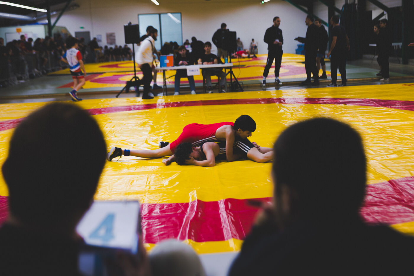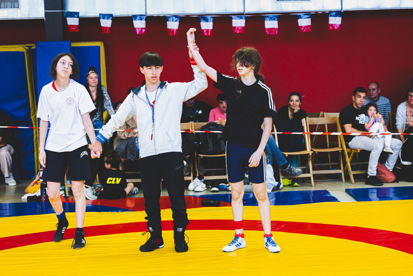 This series shows various wrestling competitions in Bigorre, South-West of France. Maubourguet and Vic-en-Bigorre Wrestling Club hosted competitions bringing together around one hundred junior wrestlers from clubs in Occitanie, including Montauban, Toulouse, Tarbes, Maubourguet, and Vic-en-Bigorre. Girls and boys competed in often spectacular mixed matches in front of their families. This sport, which attracts a diverse audience in Occitanie, benefits from the experience and wrestling culture of coaches of Chechen origin. The development of the Bigourdane school of wrestling is greatly indebted to the late Charly Cancel, a national referee and regional and departmental wrestling administrator, whose sons have continued his work in the Bigorre region.