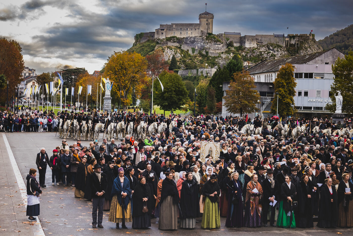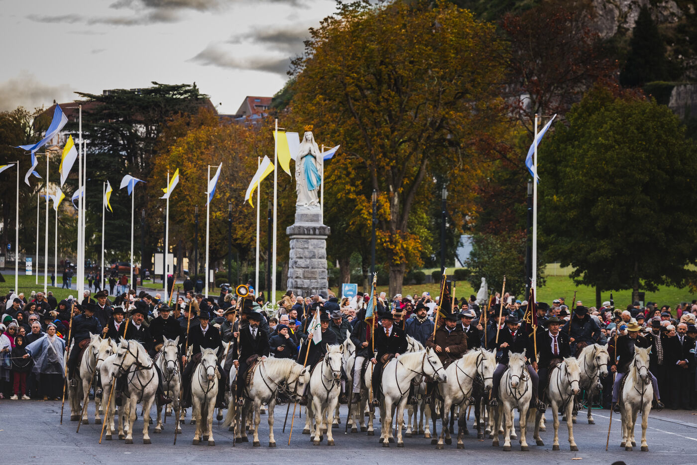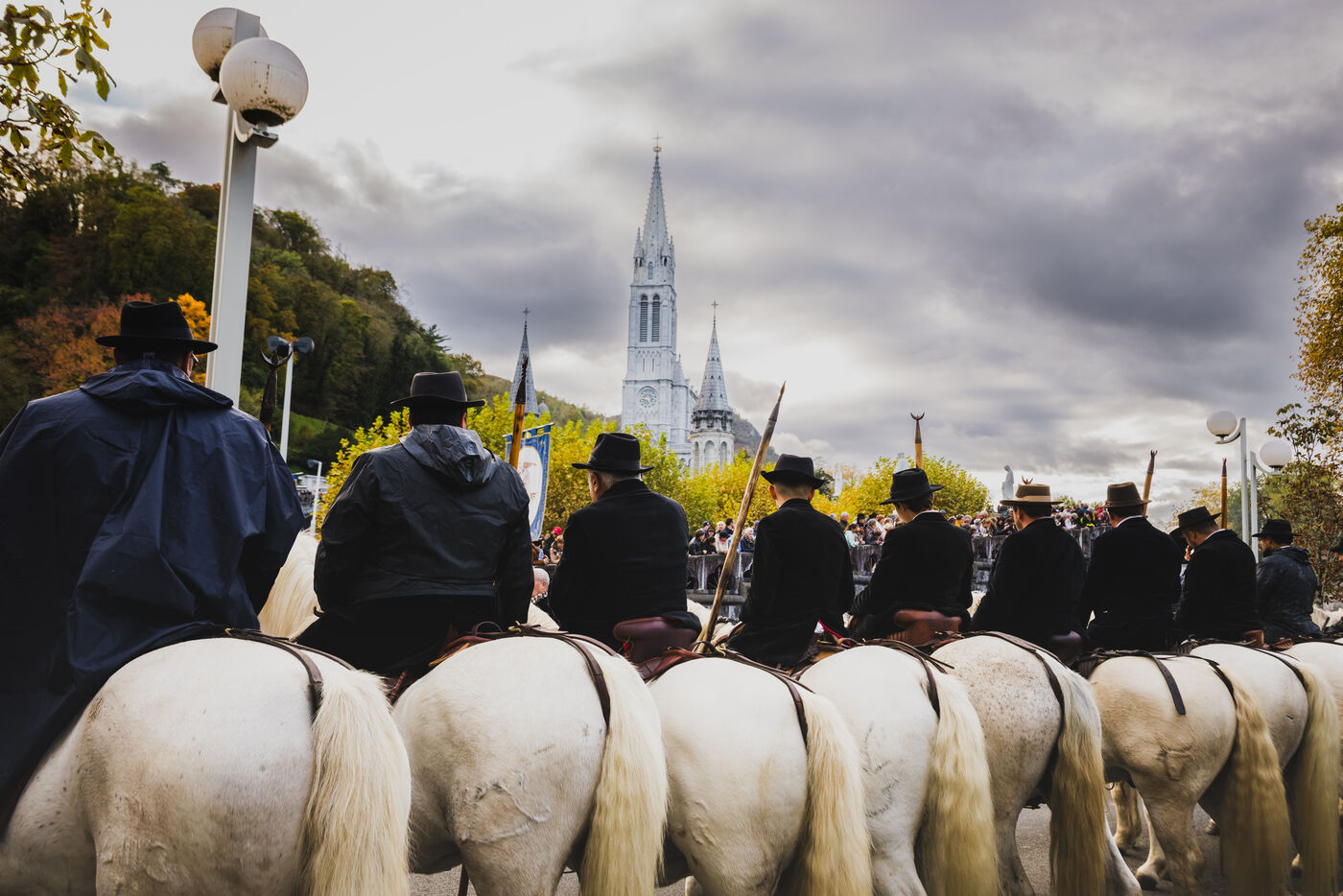 Organisé tous les deux ans, le pèlerinage des Gardians à Lourdes réunit chaque automne plusieurs milliers de participants, dont soixante cavaliers et de nombreuses Arlésiennes en costumes traditionnels. Venus de Camargue et des régions d’oc, ils portent l’héritage d’une tradition vieille de cinq siècles. Fondée en 1904 par le poète et félibre Folco de Baroncelli-Javon, la Nacioun Gardiano œuvre à la préservation de la langue d’oc, des coutumes taurines et du costume d’Arles. Ce rassemblement vise à célébrer l’union entre spiritualité et culture camarguaise. Lourdes étant reconnue comme lieu de pèlerinage inclusif, privilégiant l’accueil des malades et des personnes en situation de fragilité, de nombreuses personnes en fauteuil roulant ont assisté à la procession souvent aidées par les Gardians eux-mêmes.