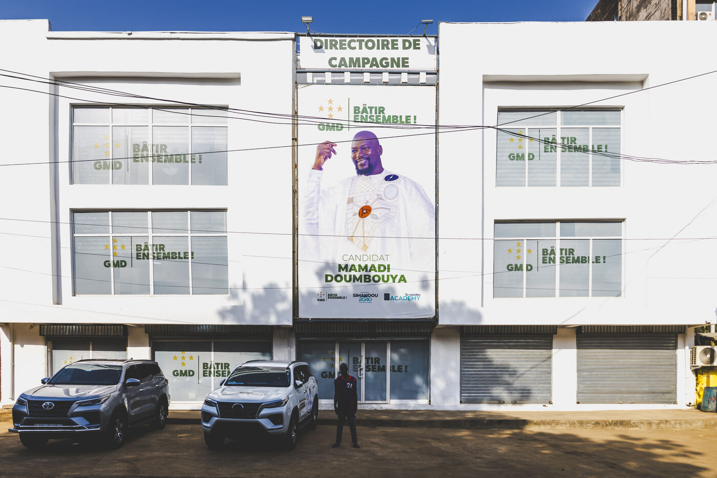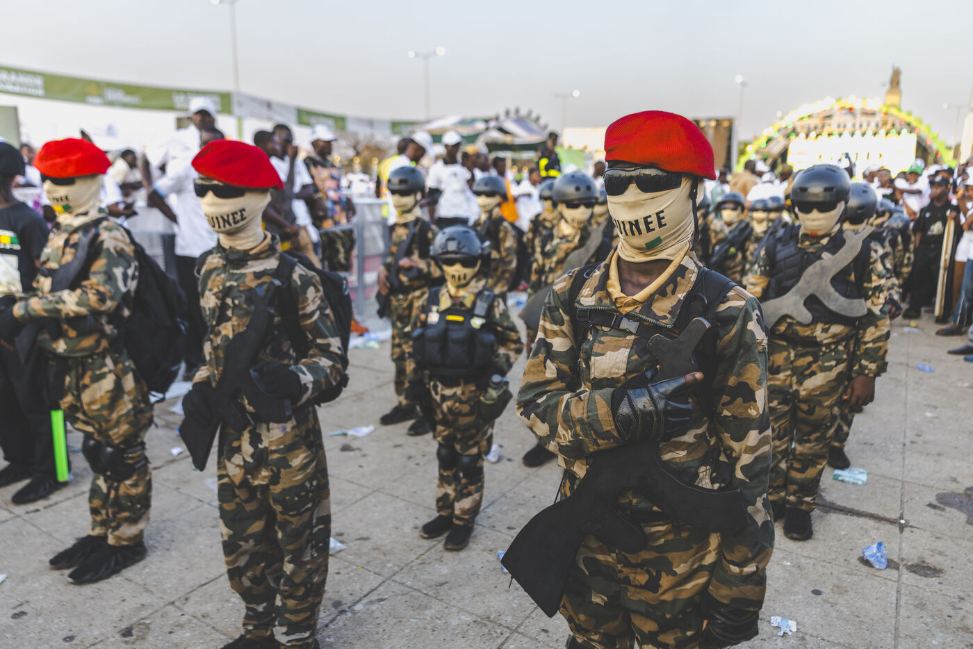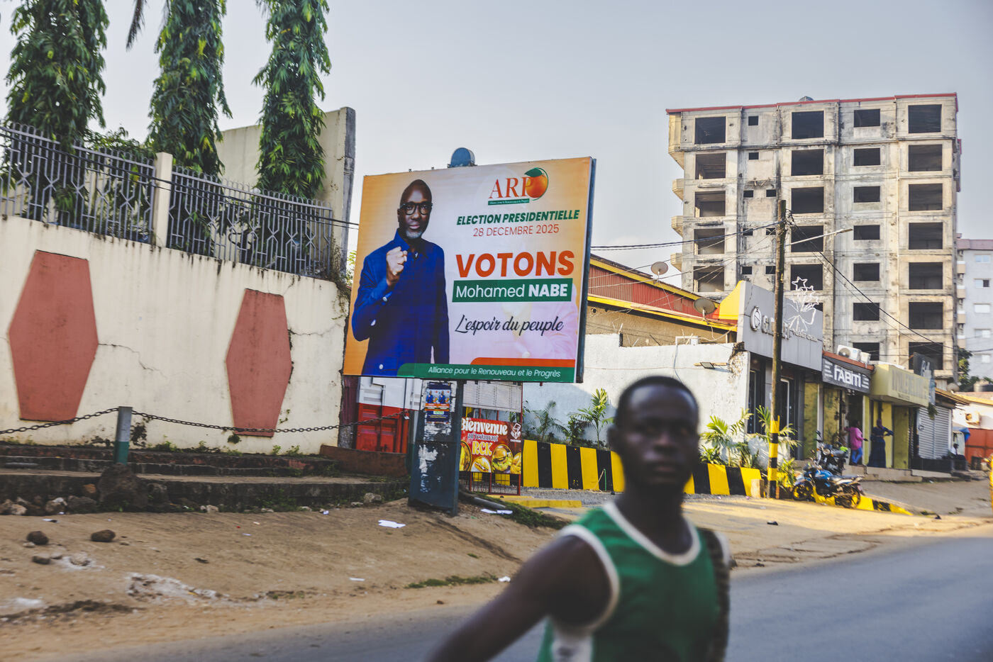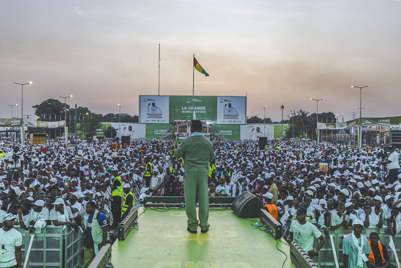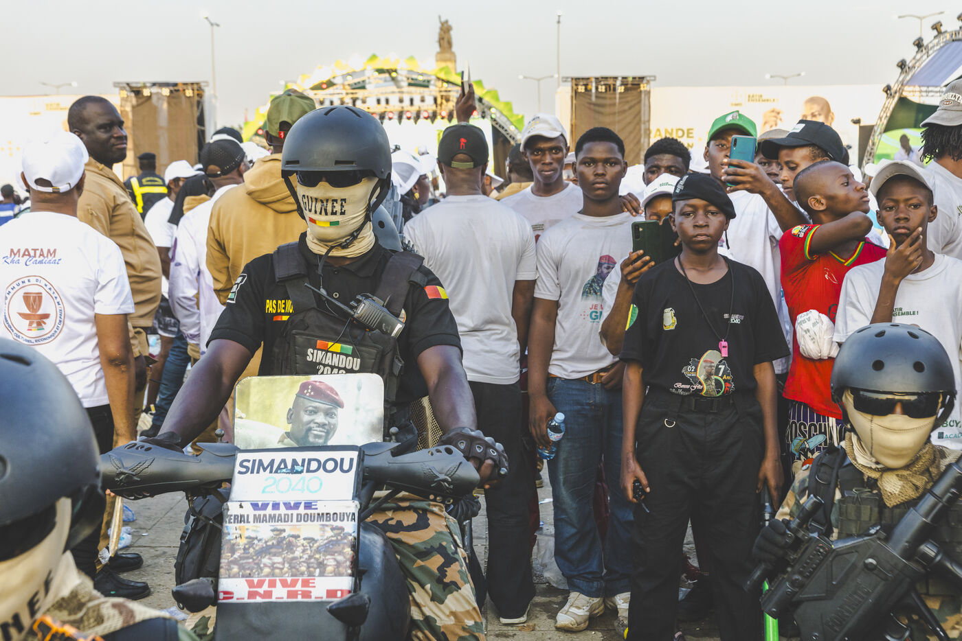 À la veille du scrutin présidentiel guinéen du 28 décembre 2025, avec neuf candidats en lice, la figure du général Mamadi Doumbouya (GMD, pour Génération Pour La Modernité et le Développement) est omniprésente à Conakry : affiches, bâtiments peints et sigles sur toutes les artères principales. Sa présence silencieuse au meeting de la Grande Mobilisation sur l'esplanade du Palais du Peuple, sous la protection d'un cordon de forces spéciales l'abritant du regard direct du public, a visiblement contenté les milliers de sympathisants venus le soutenir, chauffés par une succession d'artistes et les membres du gouvernement sur scène. Quatre ans après son coup d'État du 5 septembre 2021 qui renversa Alpha Condé, son accession au pouvoir fut perçue d'abord comme un espoir après les dérives du président déchu. Beaucoup lui reconnaissent des avancées spectaculaires dans la construction de routes et d'ouvrages, décongestionnant Conakry, le BTP ou la création d'emploi à travers le chantier Simandou d'exploitation et de transport par rail du fer. D'autres ont progressivement déchanté, à l'instar de l'opposant Dr Ousmane Kaba, président du PADES, fondateur de l'université privée Kofi Annan, évincé pour un motif administratif qu'il conteste. Les opposants historiques ont aussi été évincés de la course. Tous tentent de contenir leurs frustrations, en prônant la poursuite de leur combat par des voies démocratiques et non violentes et attendent déjà les élections législatives. Une cérémonie interreligieuse pour la paix, en présence d'anciens Premiers ministres et du père et de la sœur du président, rappelait aux Guinéens la nécessité de faire front collectivement pour un scrutin appaisé.