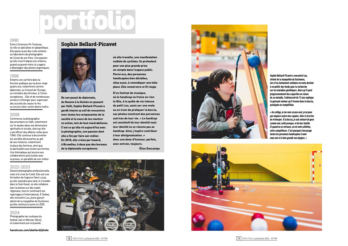 Sophie Bellard-Picavet Publications Séries / Archive Afrique — Asie — Culture — Grand Ouest — Guerre et conflits — Méditerranée — Nouvelle Aquitaine — Occitanie — Paris — Politique — Société — Spiritualité — Sport Sélection de séries Le Nouvel Obs - n° 3193 du 27/11/2025 (illustration article sur la menace Russe - photo du CEMA Fabien Mandon FAIRE-FACE n°800 (Nov-Dec 2025) - UN DUO MÈRE-FILS UNI FACE À LA MALADIE Les guerriers du bitume - Reportage de 5 pages dans Moto-Légende , N°382, Nov 2025 Faire-Face, Mieux vivre le Handicap -Juillet/août 2025 - N°798 - Portfolio de 6 pages Moto-Légende, Juin 2025, n 378 - Reportage de 6 pages sur un restaurateur de motos anciennes aux Etats-Unis ACCROCHES N° 57 - LE MAGAZINE DU CLUB DE LA PRESSE OCCITANIE - LE RÊVE BRISÉ DES DÉMOCRATES AMÉRICAINS Moto-Légende, Mars 2025, n 375 - Reportage de 8 pages sur le musée Harley-Davidson aux Etats-Unis New-York rend hommage aux vétérans bikers (Moto Légende de Décembre 2024 n° 373) Préparation Yamaha 350 RD - Hors Série Deux Temps Oct-Nov 2024 MOTO LÉGENDE N° 370 Oct 2024 - LE PÈLERINAGE DES MOTARDS LE NOUVEL OBS N° 3128 DU 05-09-2024 - Special foire aux vins - vin naturel - salon Les Trinqueuses LE FIGARO MAGAZINE DU 9 AOÛT 2024 - Illustration extraite du reportage sur le Pèlerinage des motards à Lourdes SportMag n° 173 (mars 2024) - Avec la Bonne échappée, les adolescents se bougent LA VIE DE LA MOTO - N° 1219 DU 23/11/2023 LA VIE DE LA MOTO N° 1219 du 23/11/2023 MOTO LÉGENDE - OCTOBRE 2023 (numéro 360) L'HUMANITÉ - 5 OCTOBRE 2023 JEUNE AFRIQUE - Septembre 2023 PYRÉNÉES MAGAZINE (HS Histoire 2023) ALPINE MAG - Octobre 2023