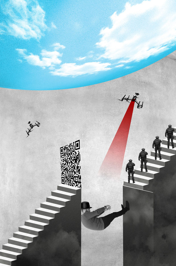 Series of collages on the insistent controls between health pass linked to the pandemic and the State of Emergency linked to the terrorist threat