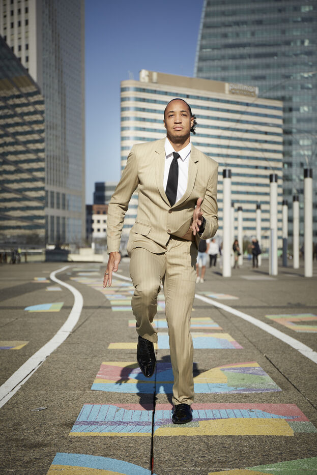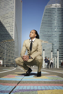 Pascal Martinot Lagarde, athlète français, spécialiste du 110 mètres haies et détenteur du record de France du 110 mètres haies en 12 s 95, pose pour une série de portrait dans le quartier de la Défense.
