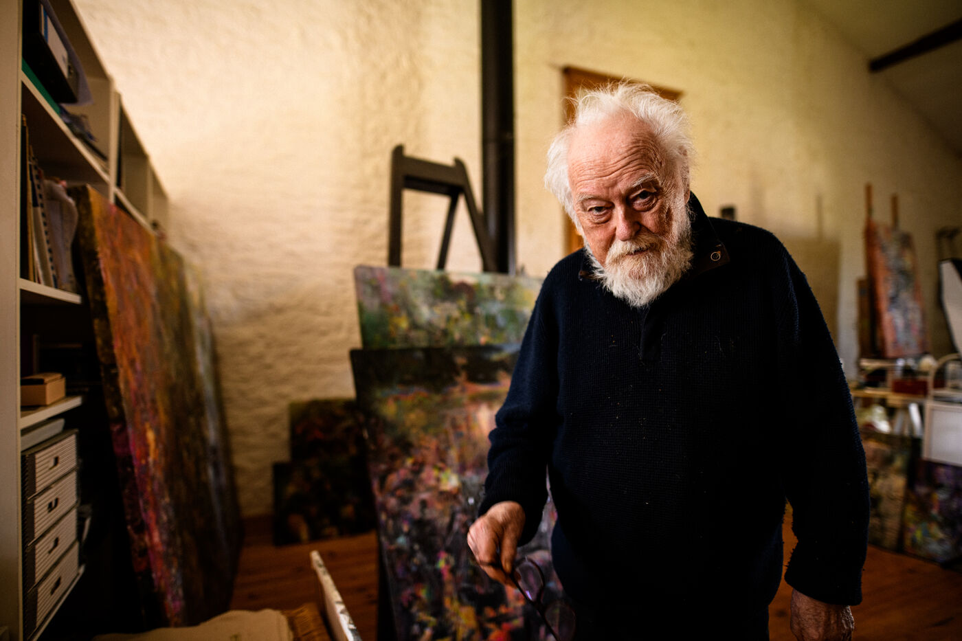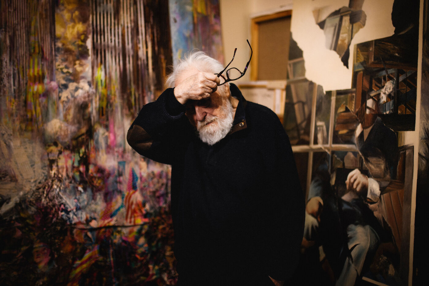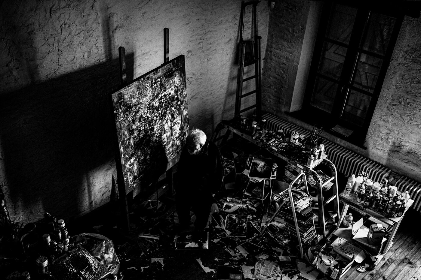 He has not painted in three years. The work demands too much attention to detail, exhausting precision. Yet he has preserved his studio intact, like a living installation, a testimony to a practice shaped by time and its traces.