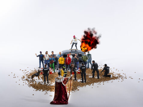 Illustration Emmanuel Macron as Napoleon Bonaparte and riots between young people and the police, staged with small characters