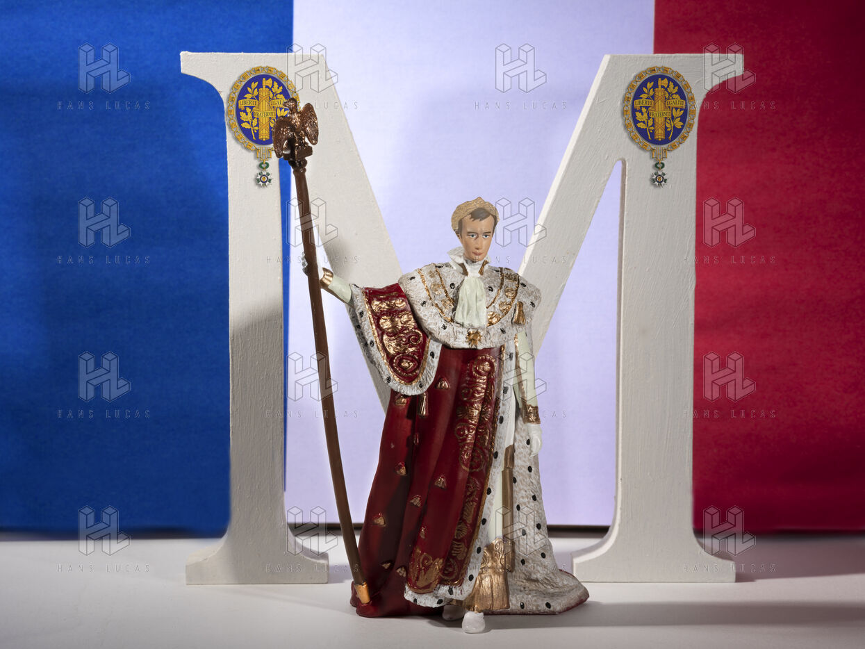 Illustration Emmanuel Macron en Napoléon Bonaparte et émeutes entre jeunes et police, mise en scène avec petits personnages