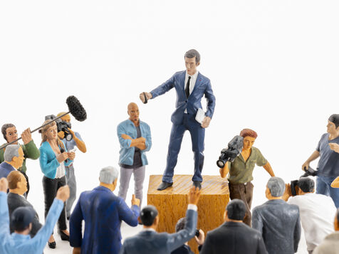Emmanuel Macron and his wife in figurine, representation of the Macron couple in figurine, staged in front of a crowd of people and journalists.