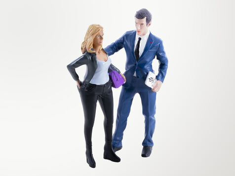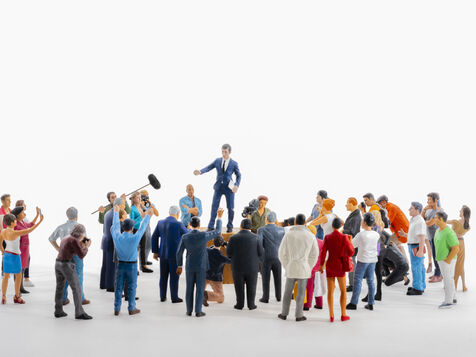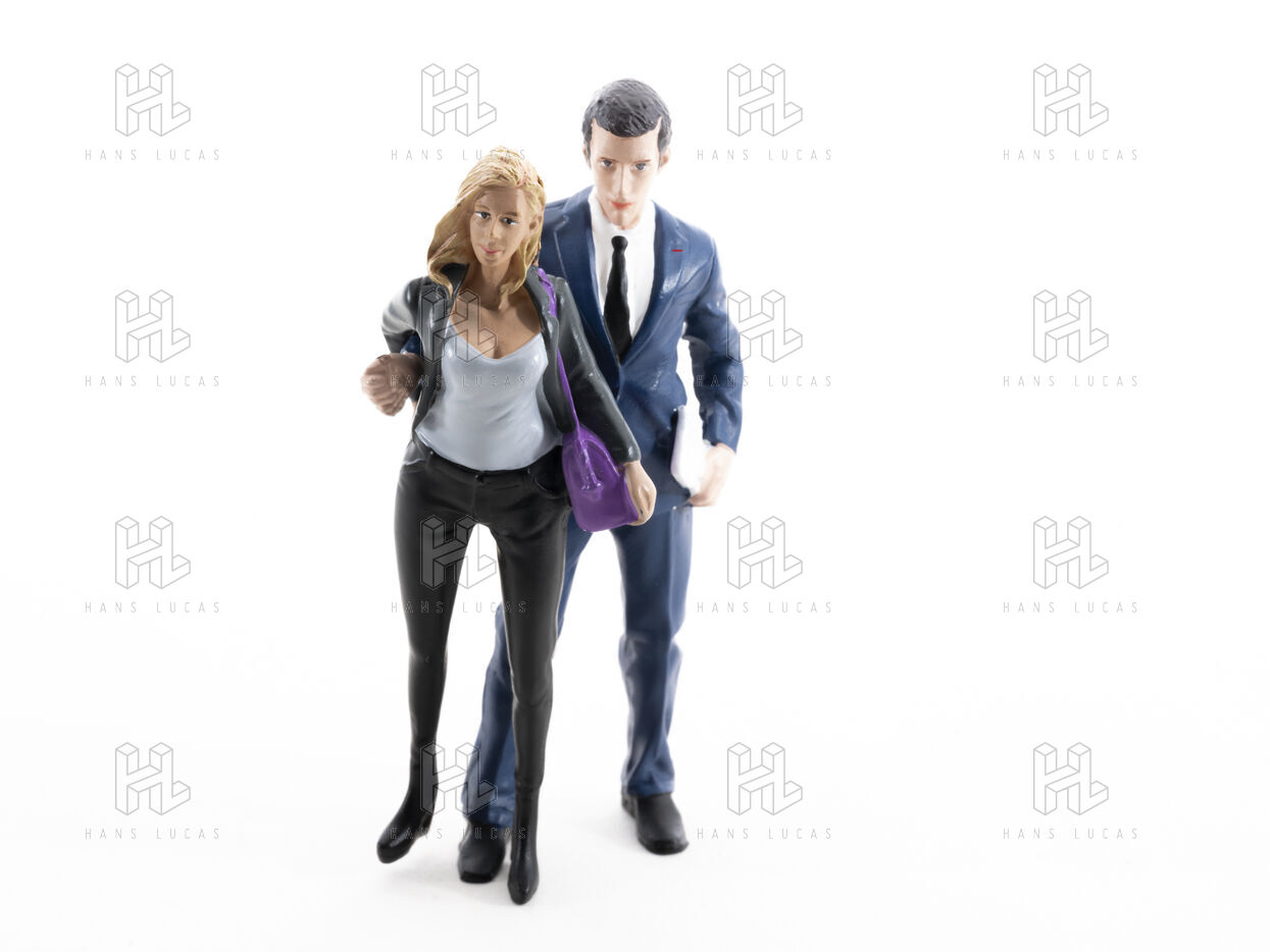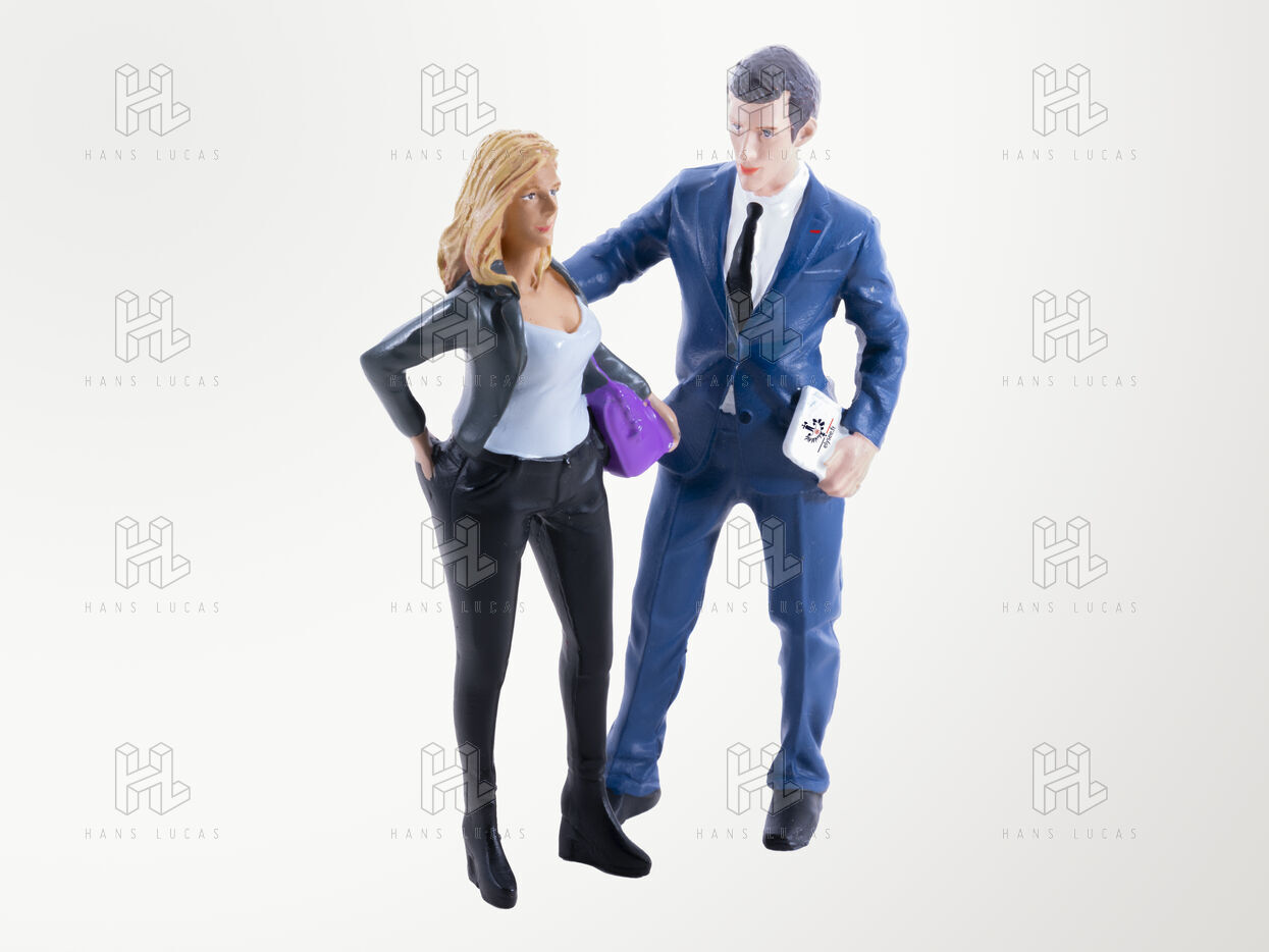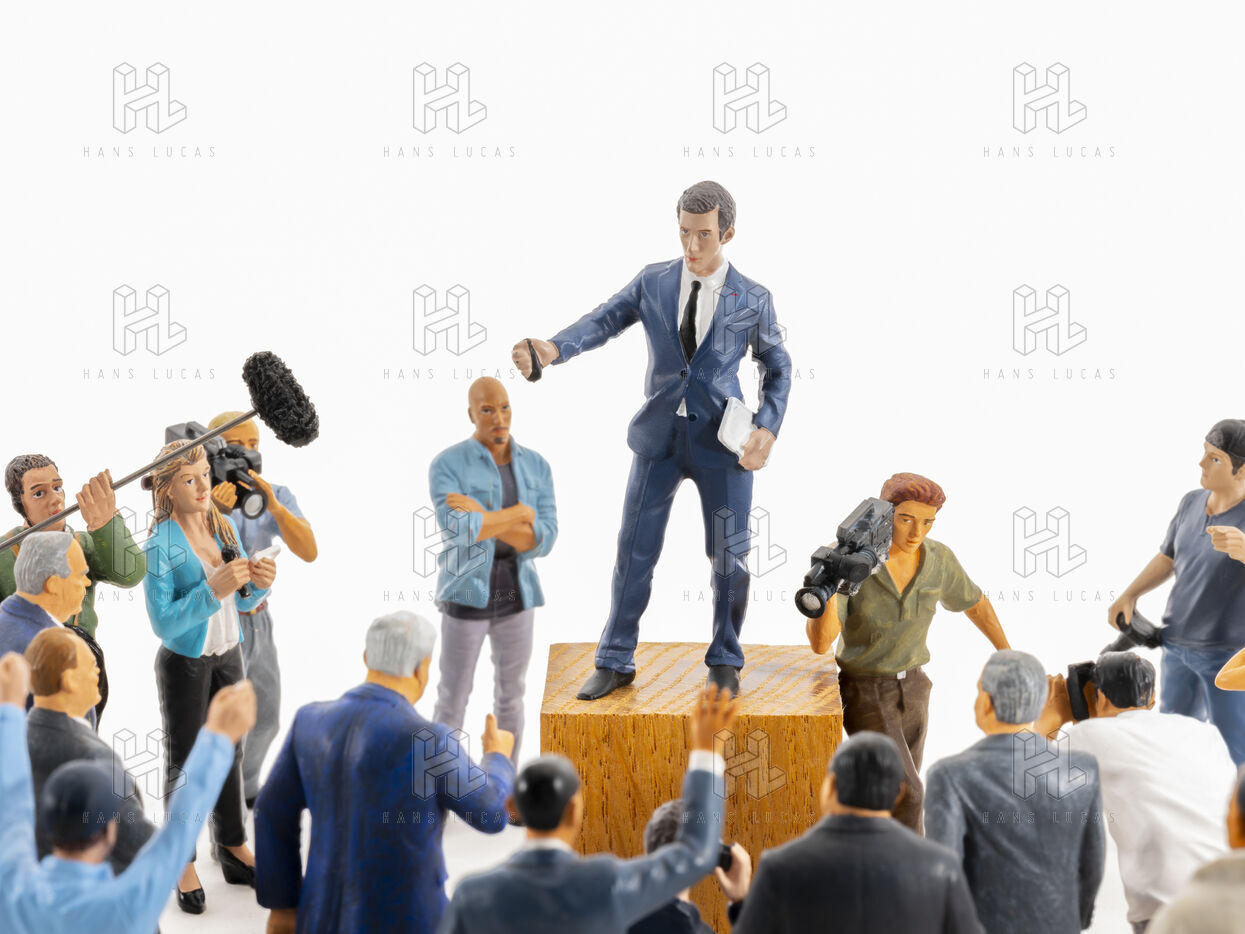 Emmanuel Macron et sa femme en figurine, représentation du couple Macron en figurine, mise en scène devant une foules de personnes et journalistes.