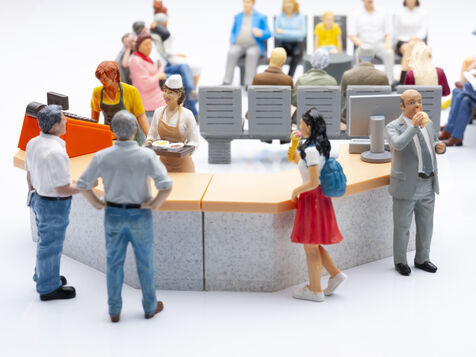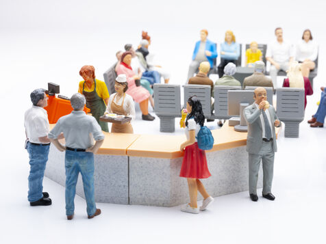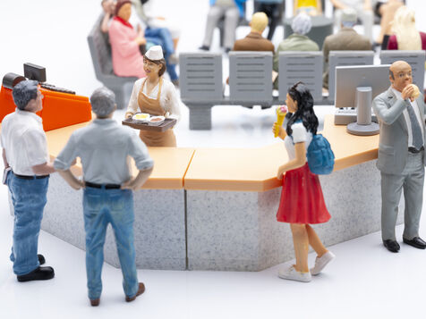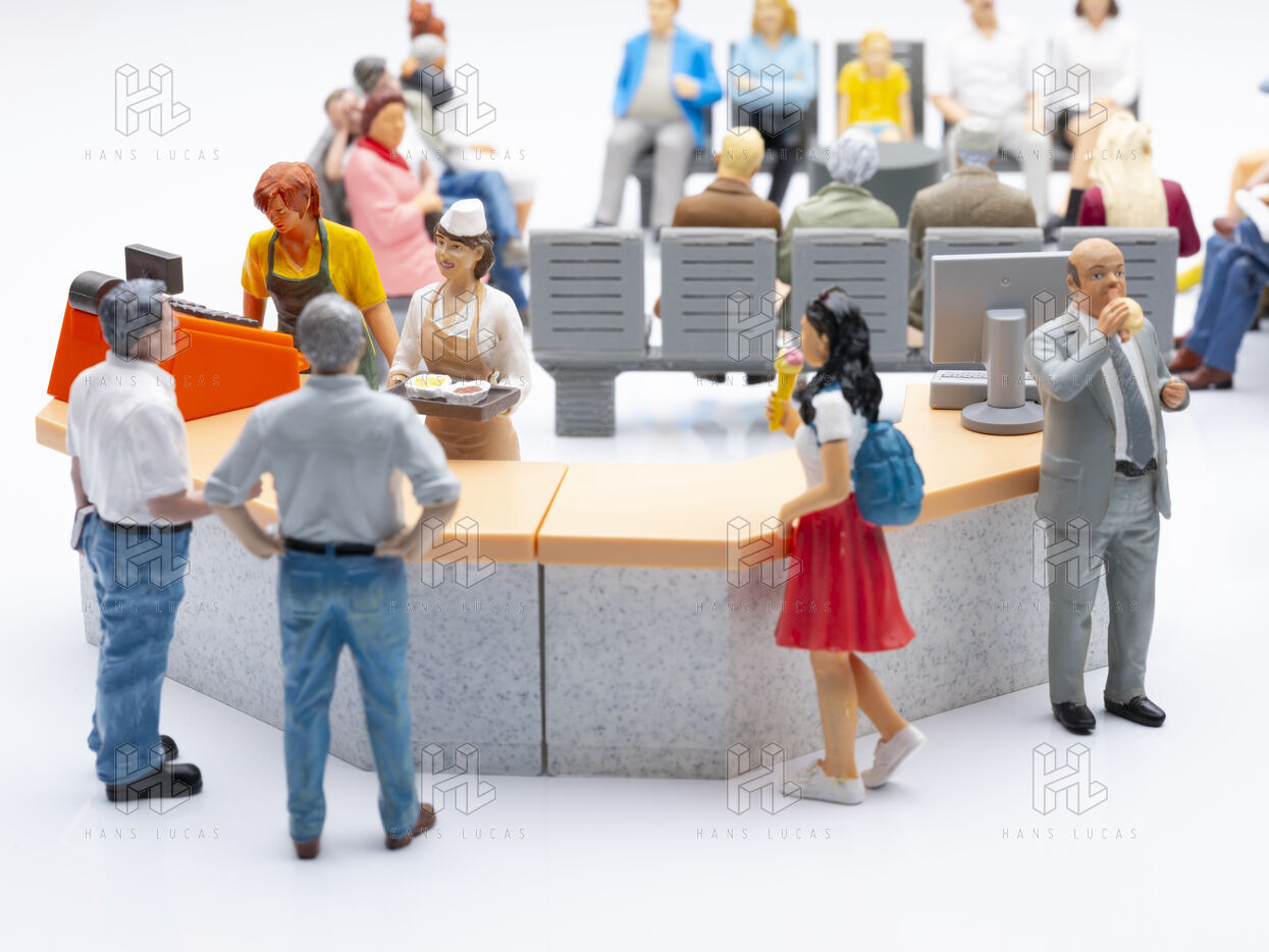 Small characters, men, women, children, are in a shopping center, with a fast food restaurant, people order food, others shop with carts, cash registers, products of all kinds.