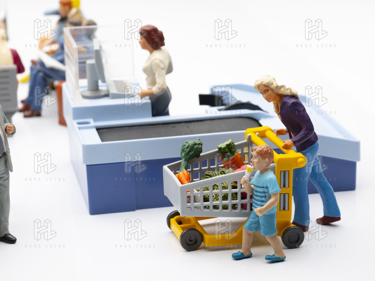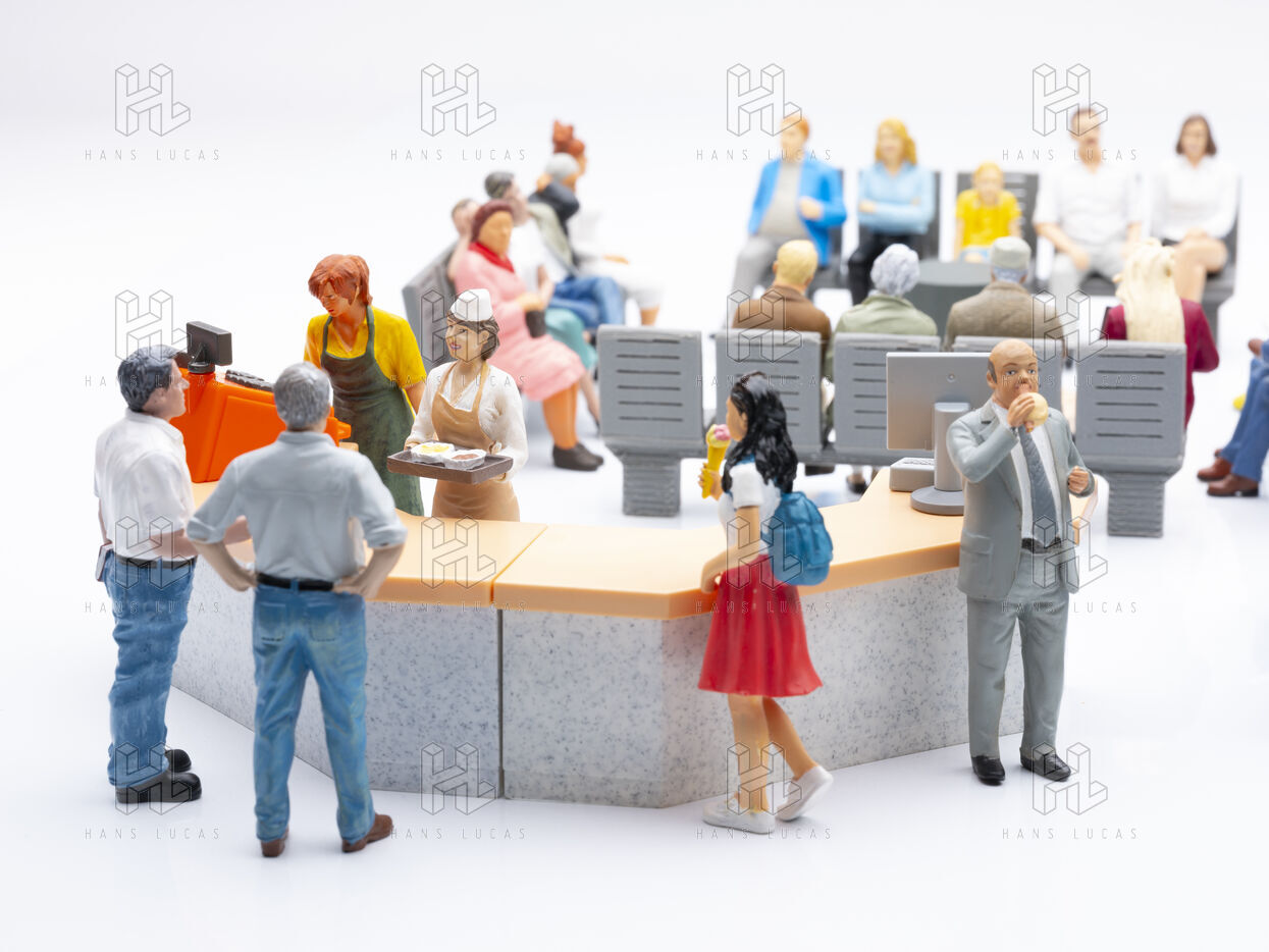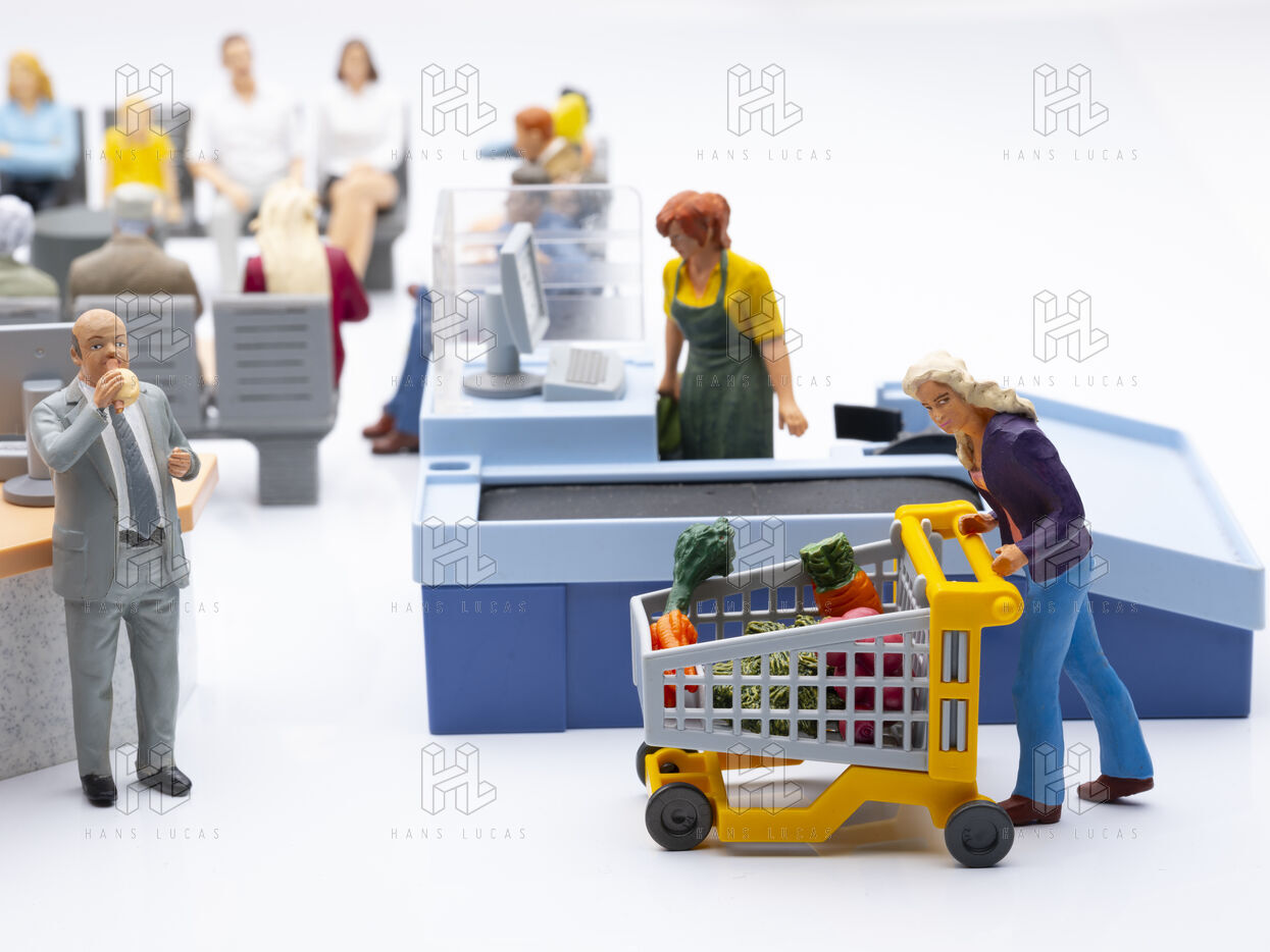 De petits personnages, des hommes, des femmes , des enfants, sont dans un centre commercial, avec un fast food, les gens commandent de la nourriture, d'autres font des courses avec des caddies, des caisses enregistreuses, des produits de toutes sortes.