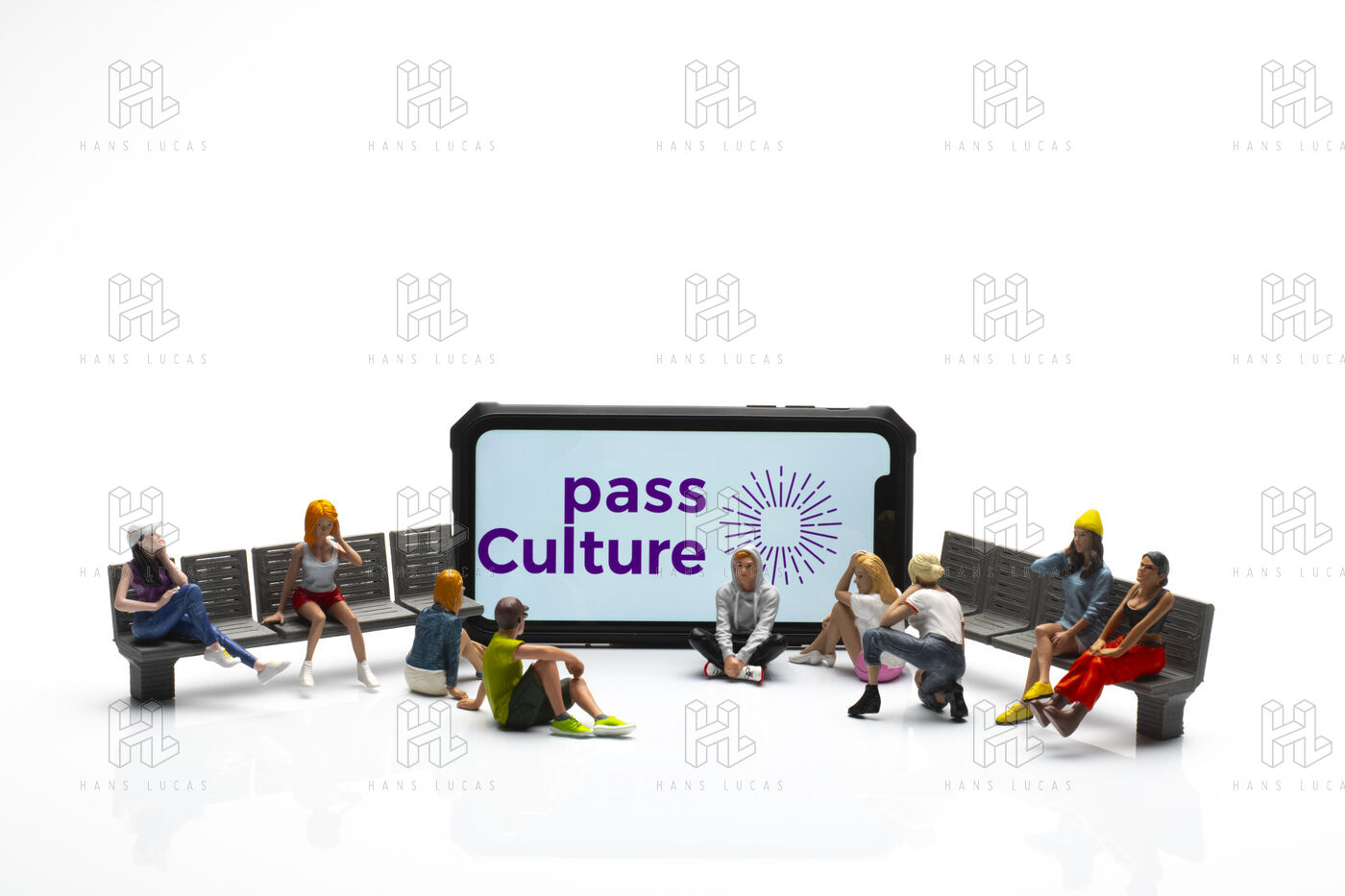 Illustration du pass culture avec des jeunes de 15 à 18 ans qui regardent un téléphone portable avec le logo et l'appli du pass culturel sur fond blanc