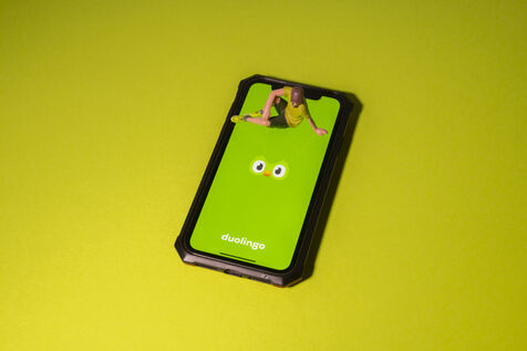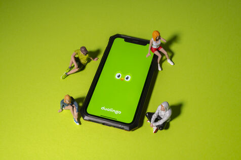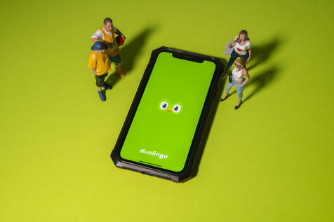 Duolingo application, un téléphone portable affiche le logo et la page d'accueil de l'application, fond vert, des petits personnages, hommes, femmes, jeunes ados, des drapeaux anglais, américain, canadien et indien également présent sur certaines vues.