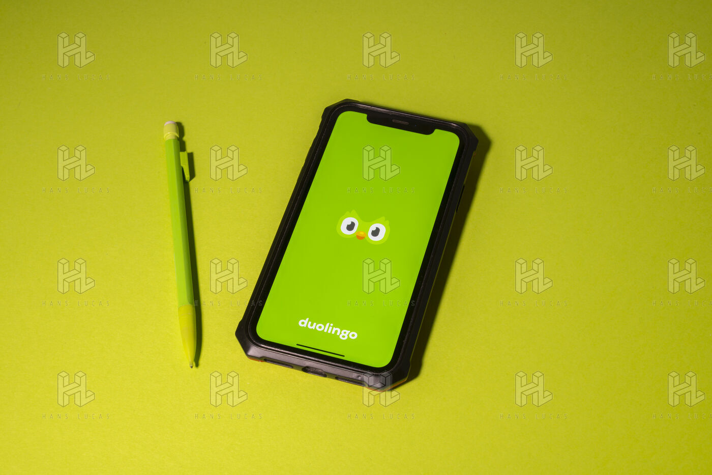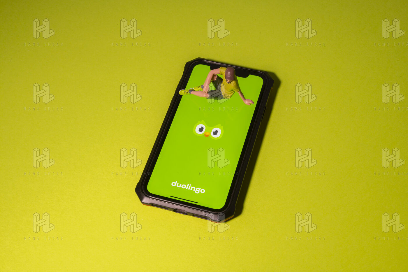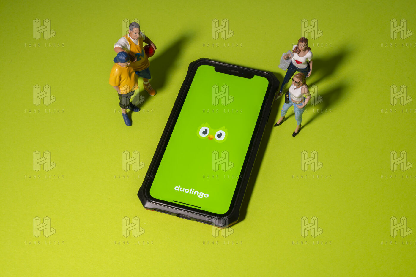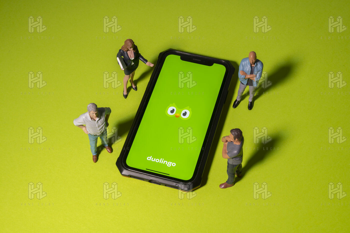 Duolingo app, a cell phone displays the app's logo and homepage, green background, small figures, men, women, young teenagers, English, American, Canadian and Indian flags also present in some views.