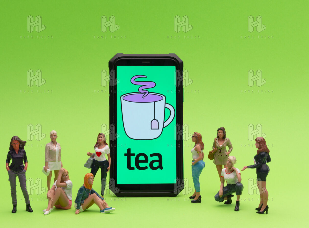 Tea est une appli qui vise à «aider les femmes à faire des rencontres en toute sécurité» en leur permettant de partager des informations sur l’homme avec qui elles sortent ou envisagent de sortir. Tout cela anonymement.Une notation avec des drapeau rouge ou vert sont appliqué pour savoir si les hommes sont recommandables. Ici ce sont de petits personnages mis en situation à coté d'un téléphone avec le logo de l'appli, des femmes et des hommes.