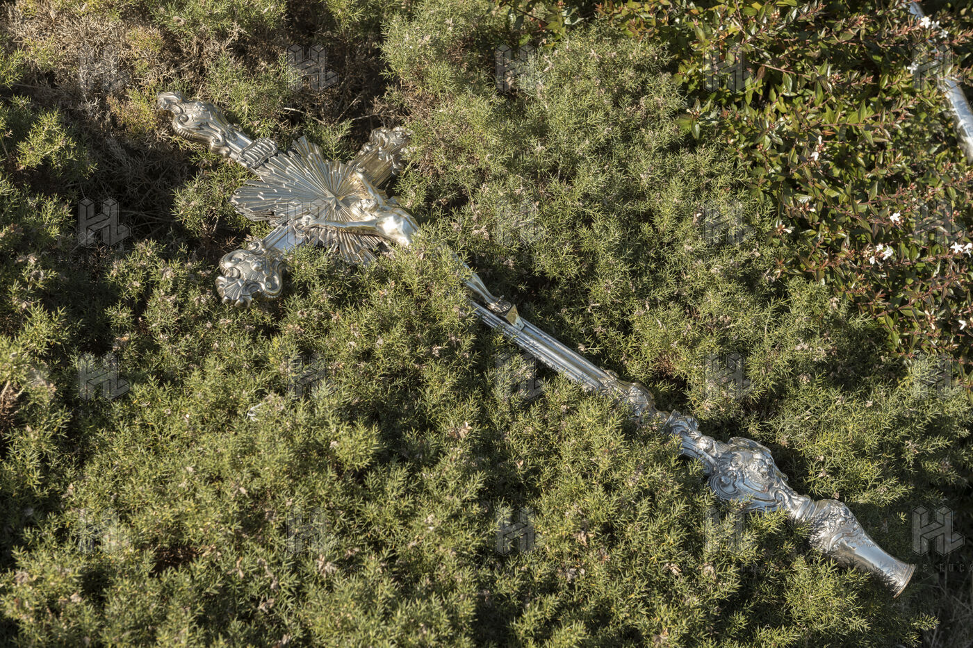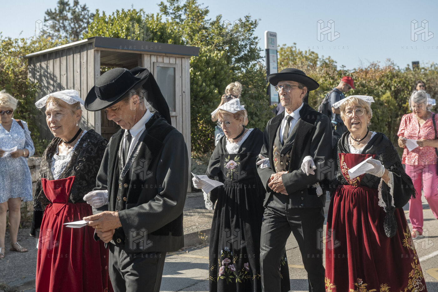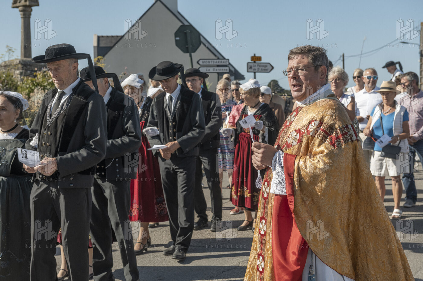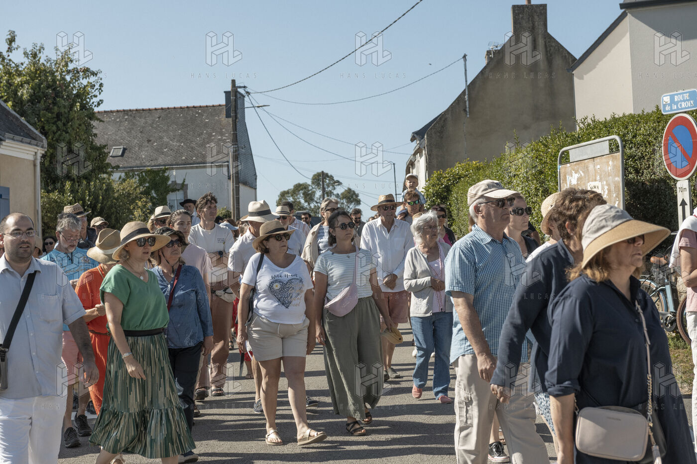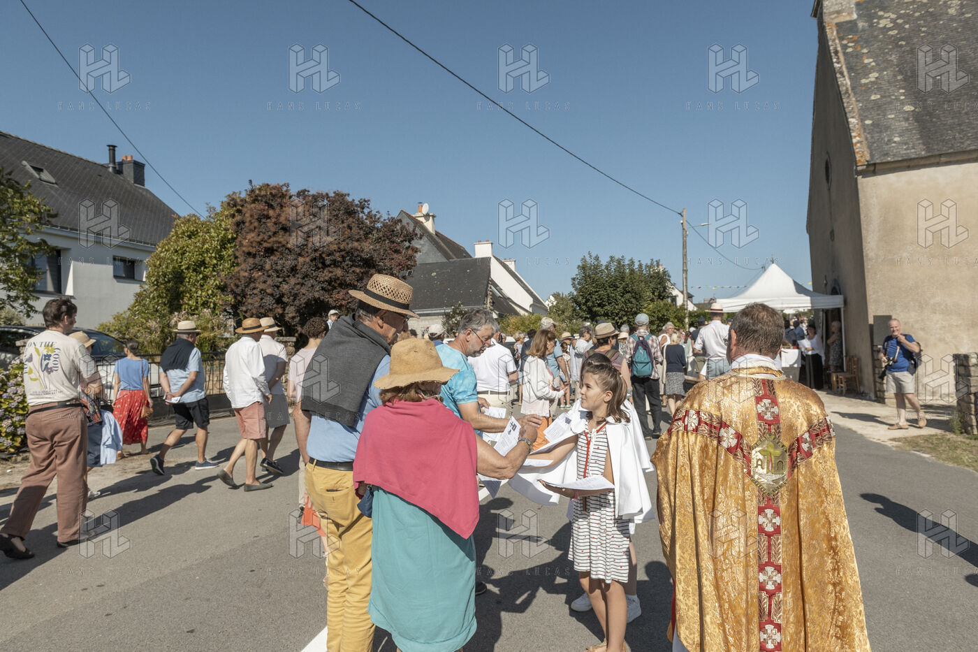 40 years of the pardon of Kerarden in the town of Séné in Morbihan, this Catholic procession from the calvert to the church of Kerarden in the center of the village, the priest as well as many faithful make this march, men, women children, a beautiful sunny day in Brittany with the Sunday mass in focus.
