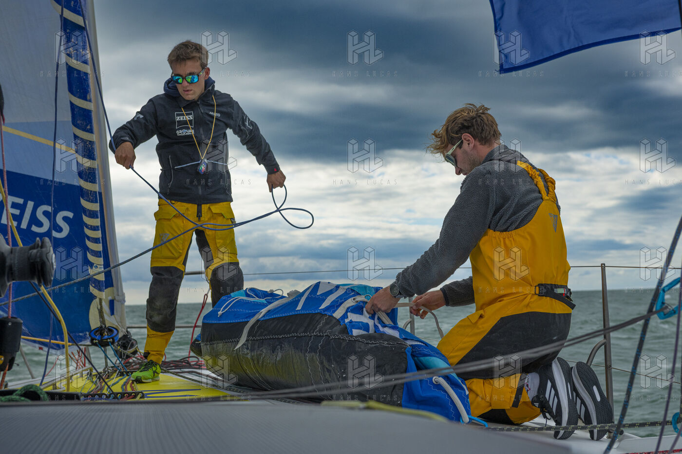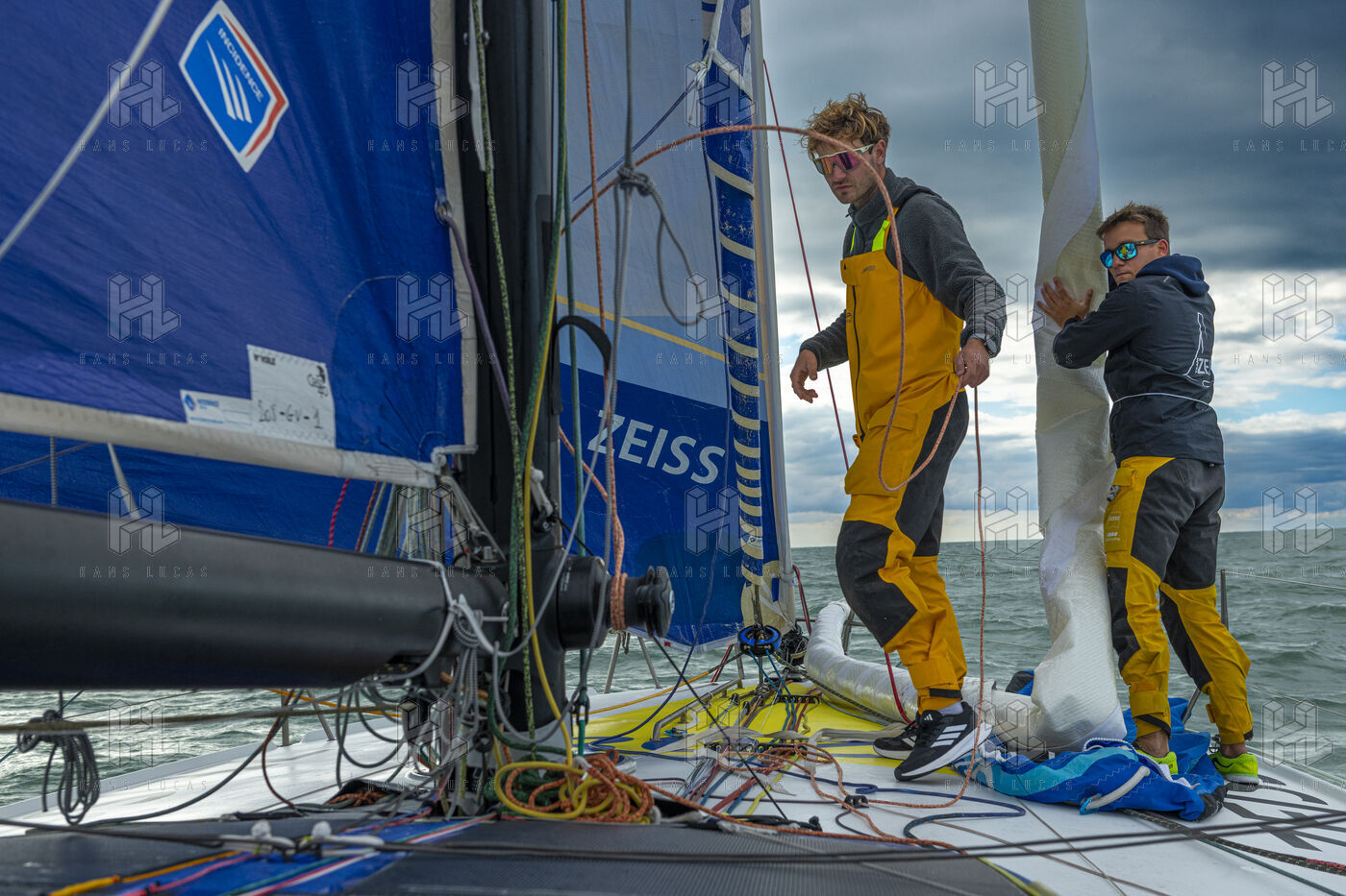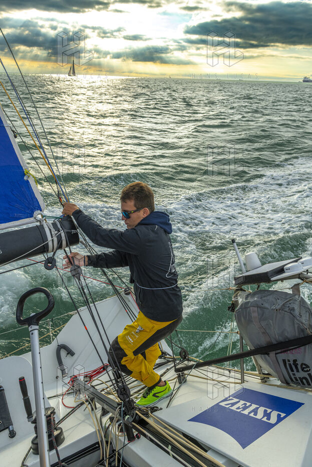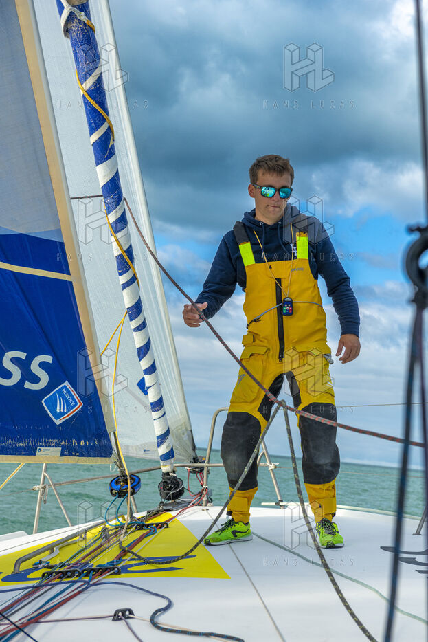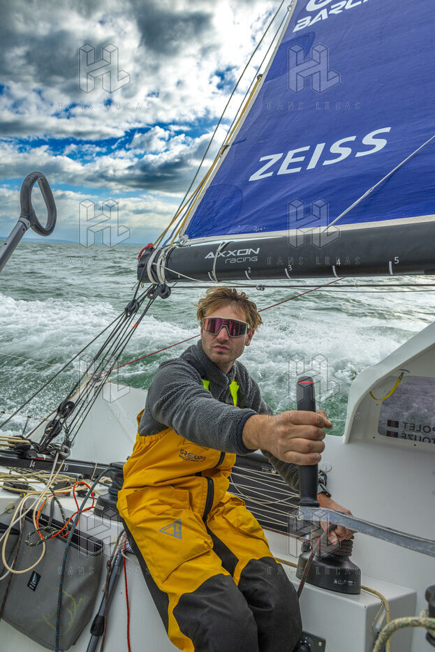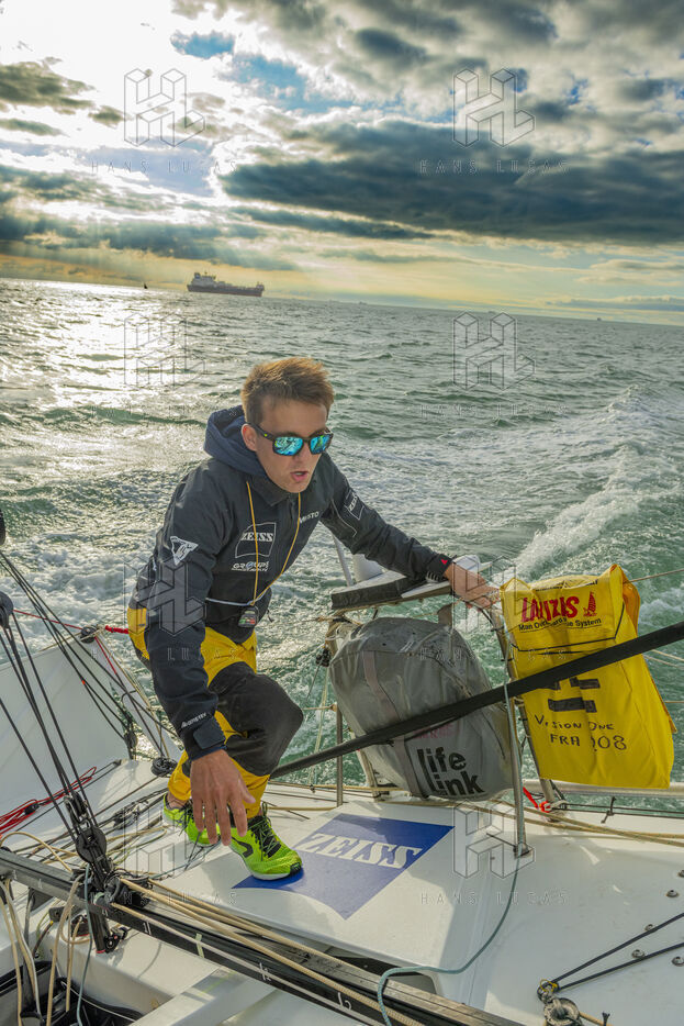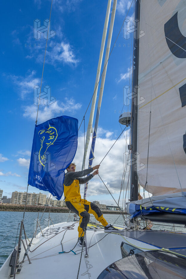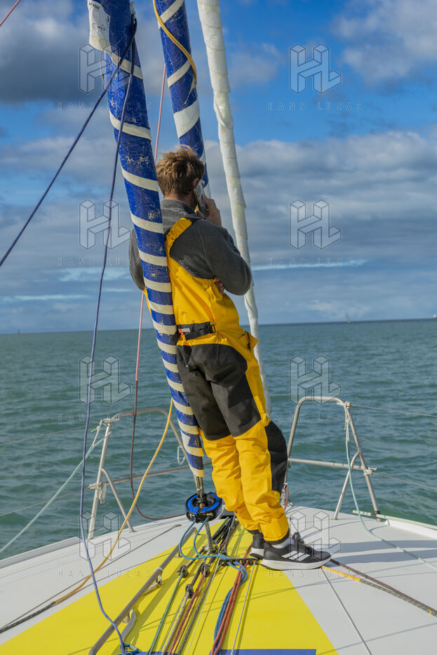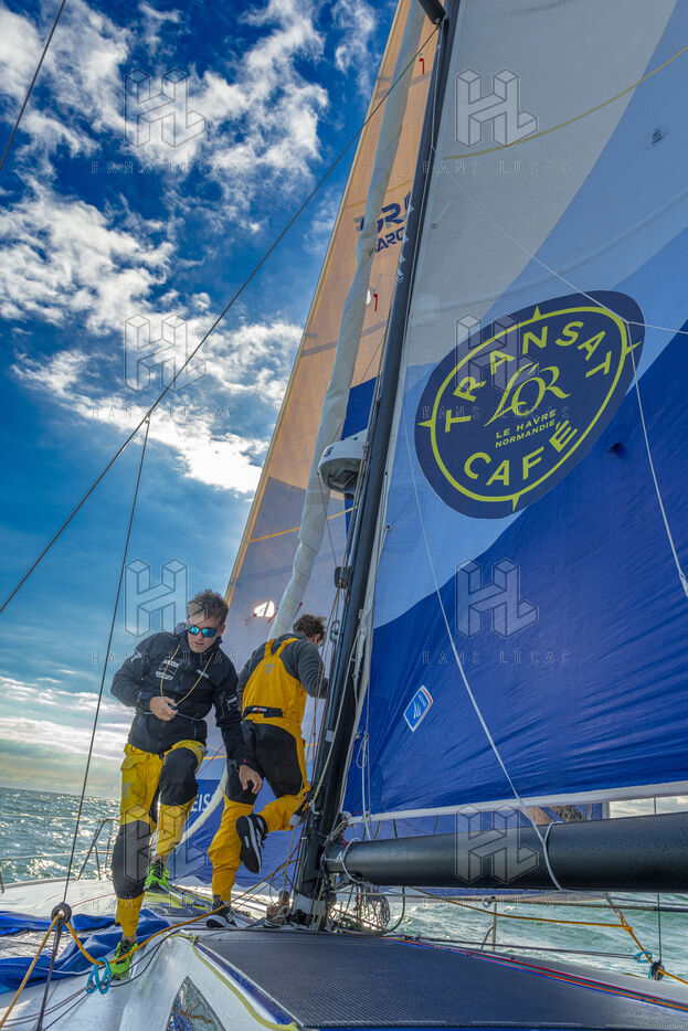 Sea trip with the crew of the Class 40 racing boat, a crew composed of Thimoté Polet, 25, a young skipper from Le Havre and student, and Pierrick Letouzé, a young skipper from Cherbourg, both form a dynamic duo, courageous, valiant, and efficient. This last trip before the start of the Transat café l'or race, 2025 edition. Off the coast of Le Havre, the Zeiss team, named after their main sponsor, is taking advantage of the beautiful sunny weather to test several sails on their boat. Departure from the marina of Le Havre on Wednesday, October 15, 2025, offshore racing and then heading to the transat village basin.
