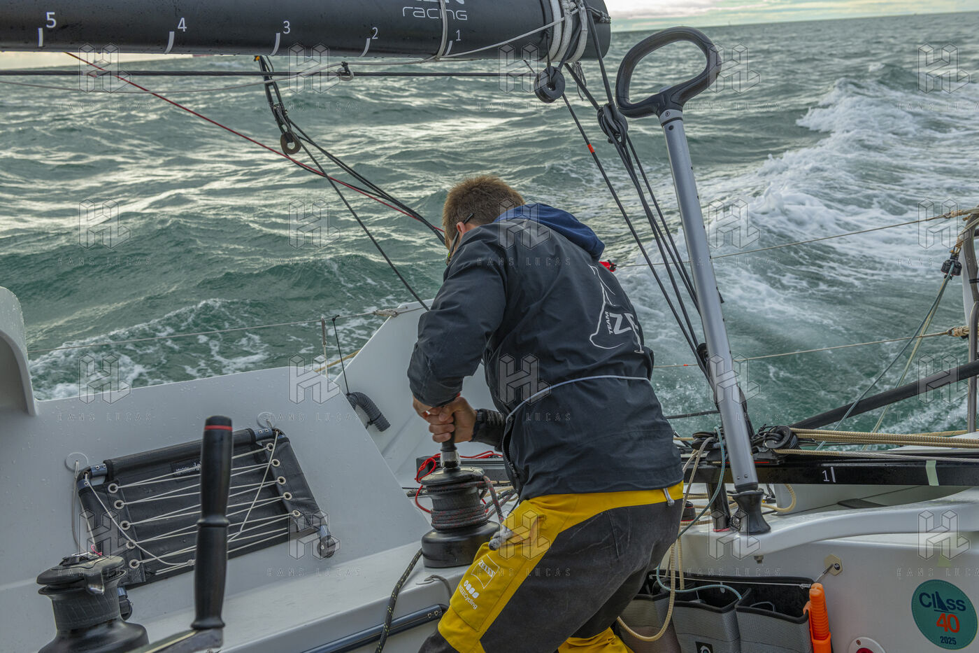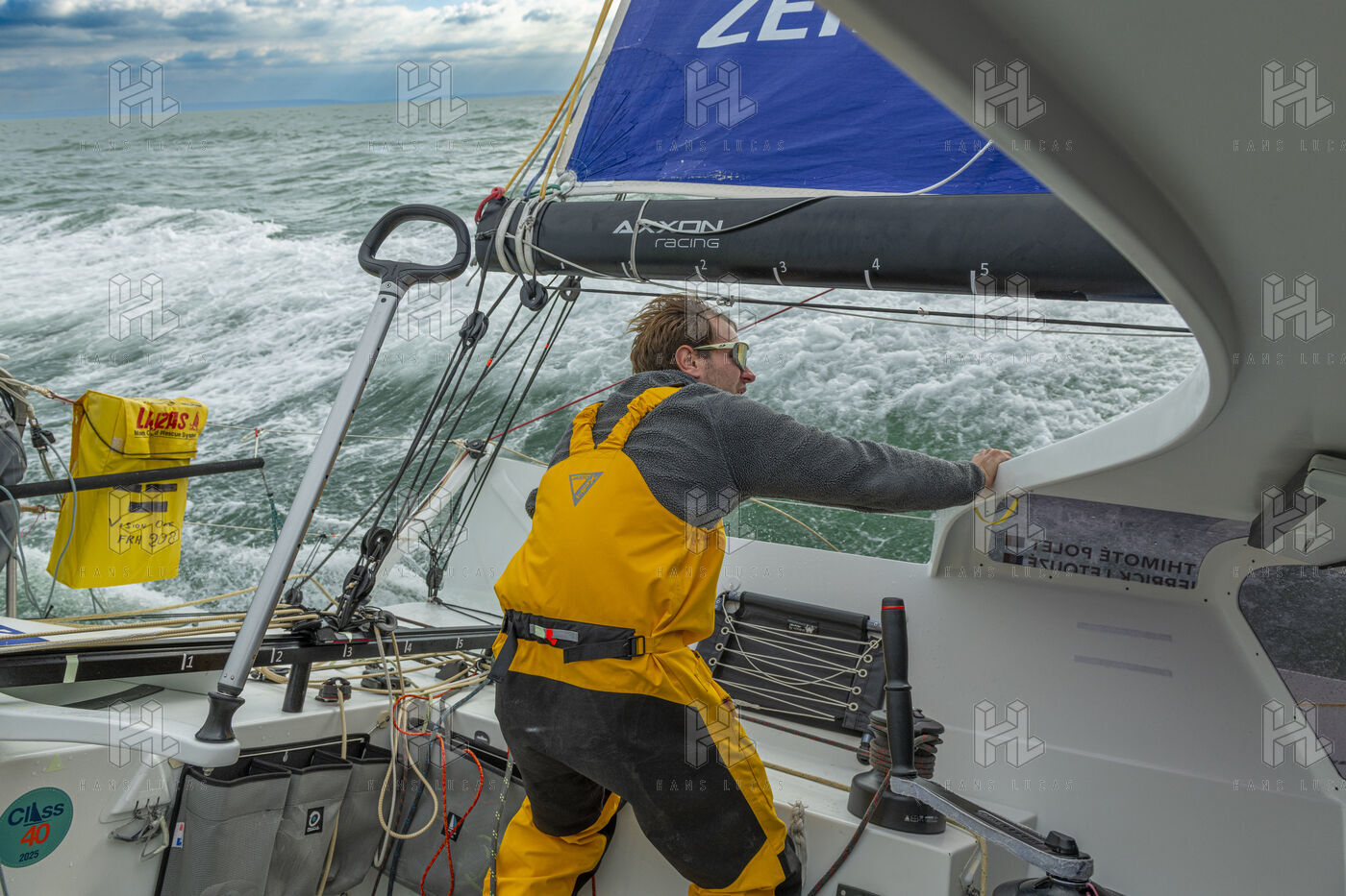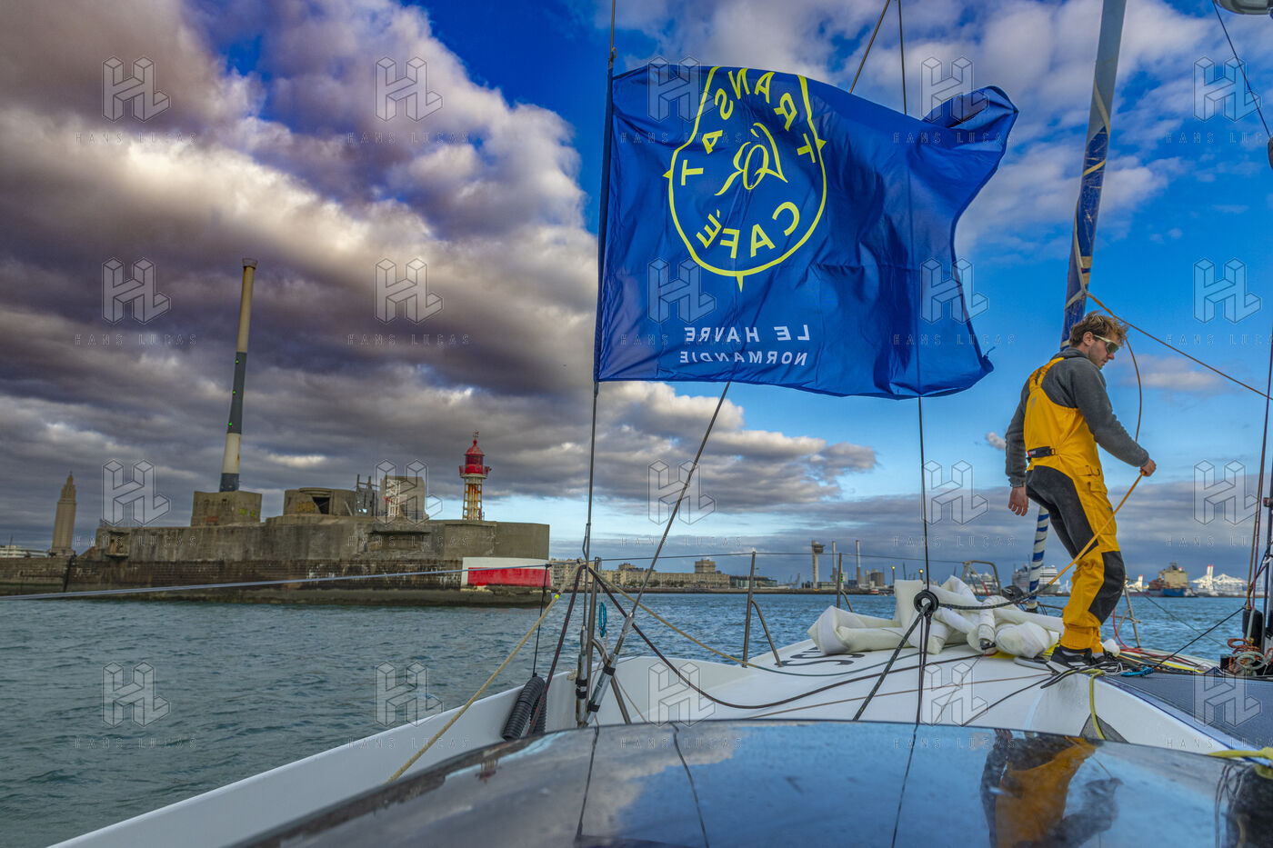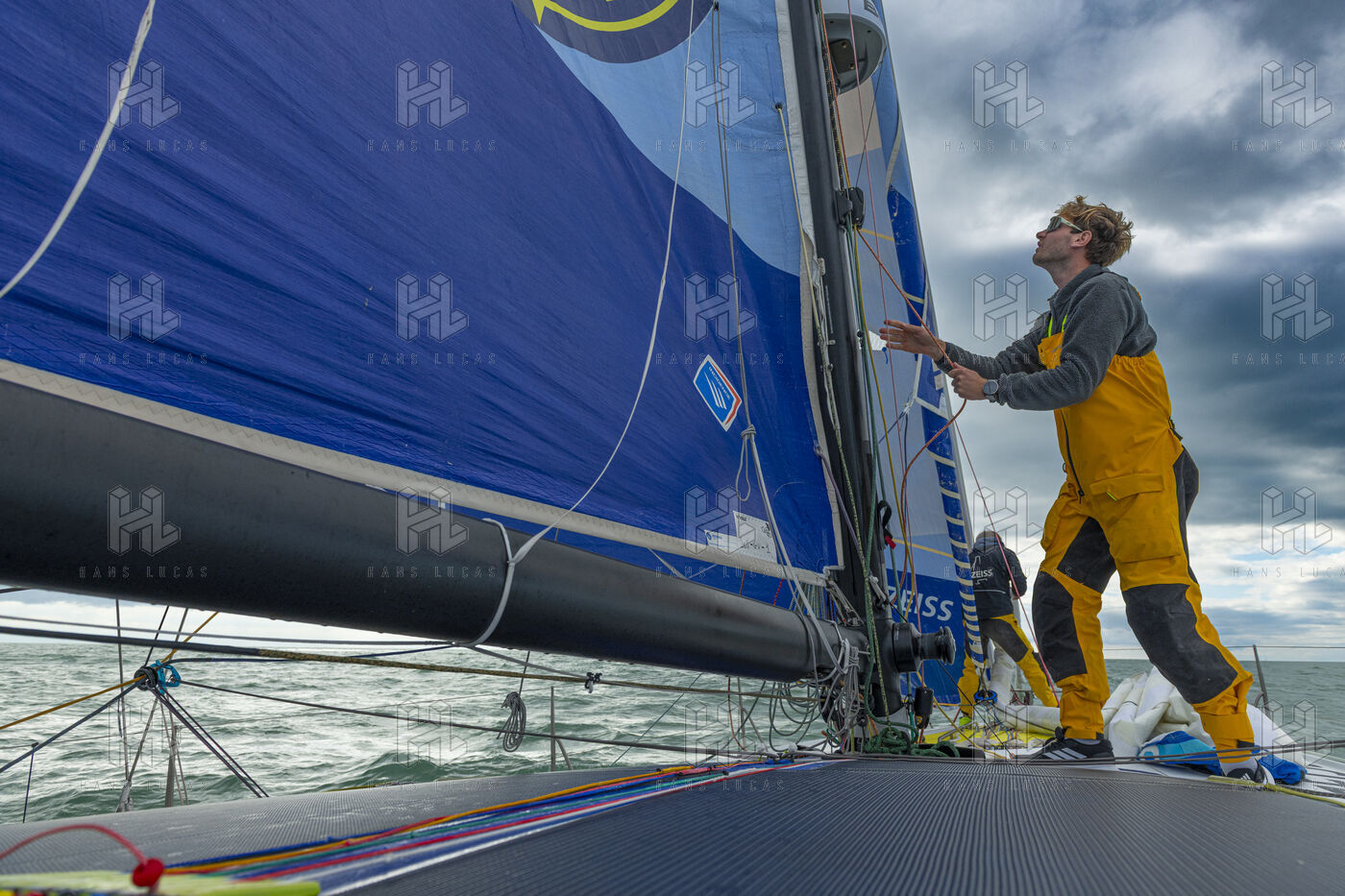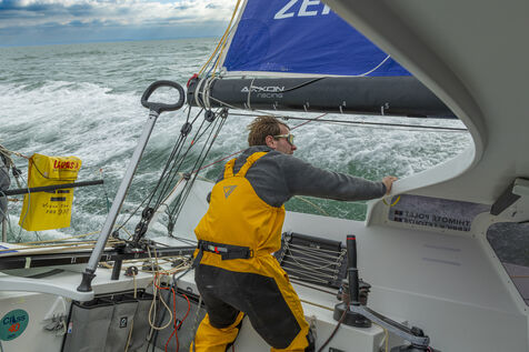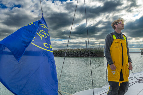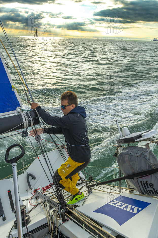 Sea trip with the crew of the Class 40 racing boat, a crew composed of Thimoté Polet, 25, a young skipper from Le Havre and student, and Pierrick Letouzé, a young skipper from Cherbourg, both form a dynamic duo, courageous, valiant, and efficient. This last trip before the start of the Transat café l'or race, 2025 edition. Off the coast of Le Havre, the Zeiss team, named after their main sponsor, is taking advantage of the beautiful sunny weather to test several sails on their boat. Departure from the marina of Le Havre on Wednesday, October 15, 2025, offshore racing and then heading to the transat village basin.