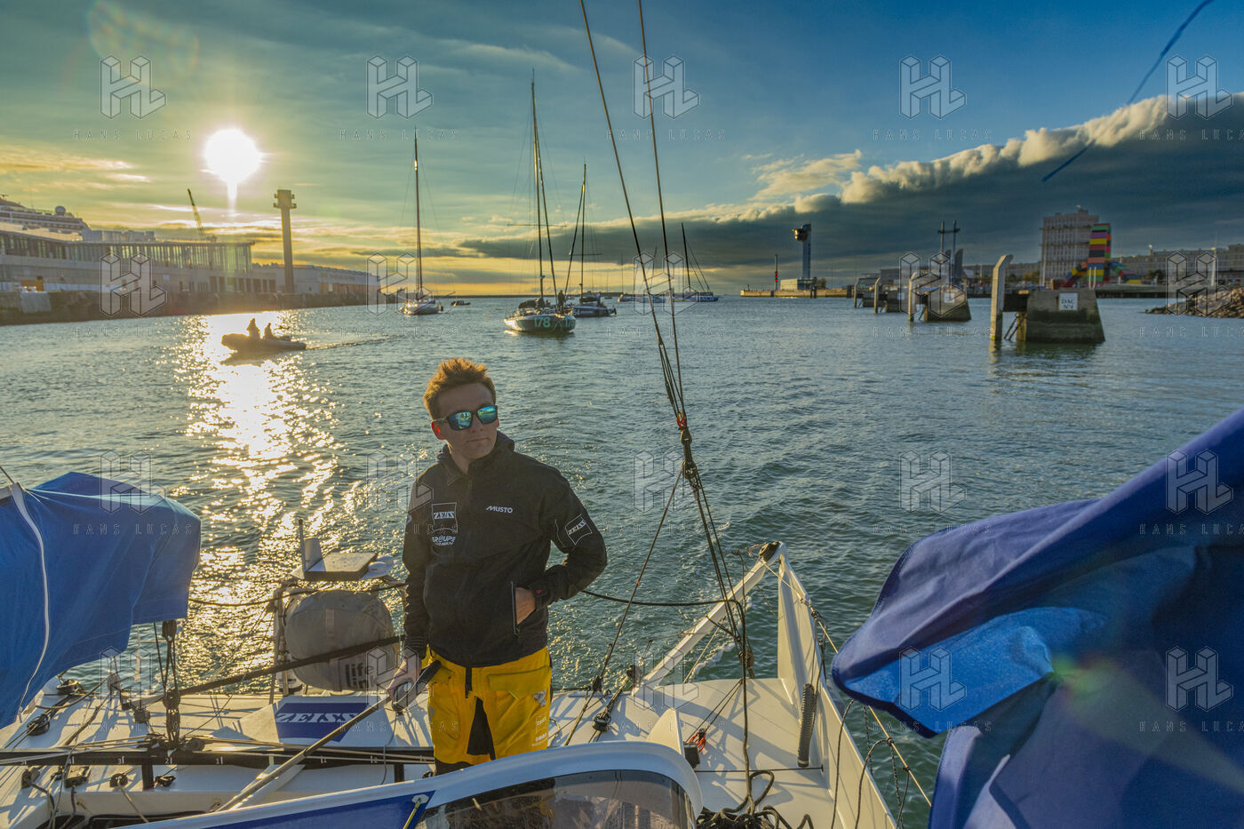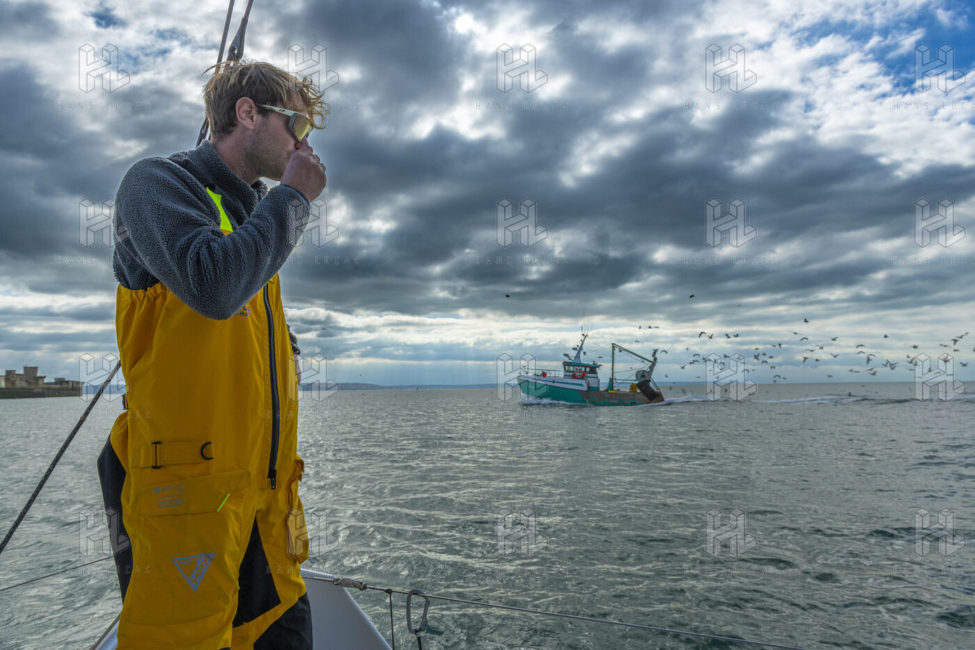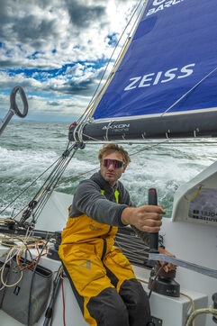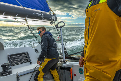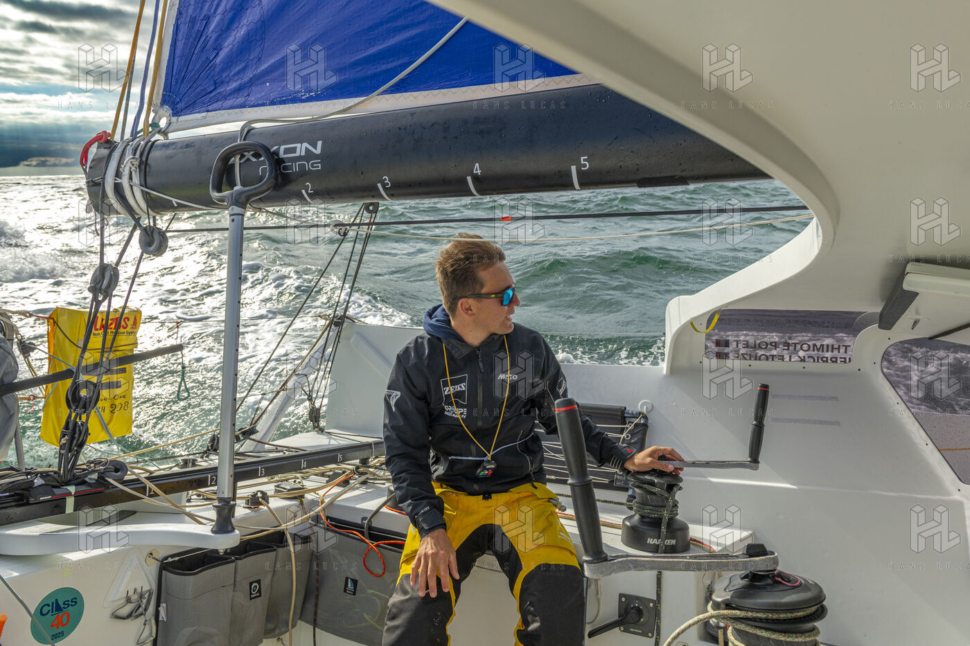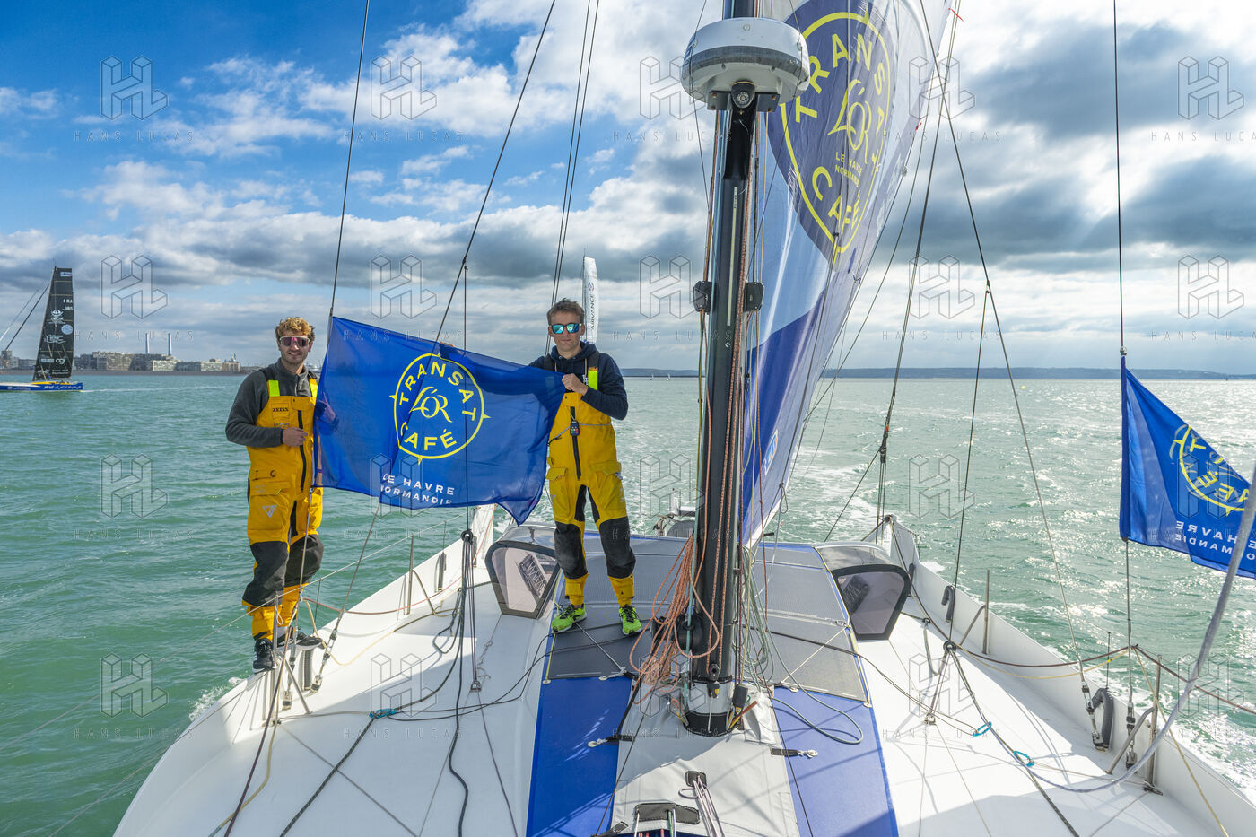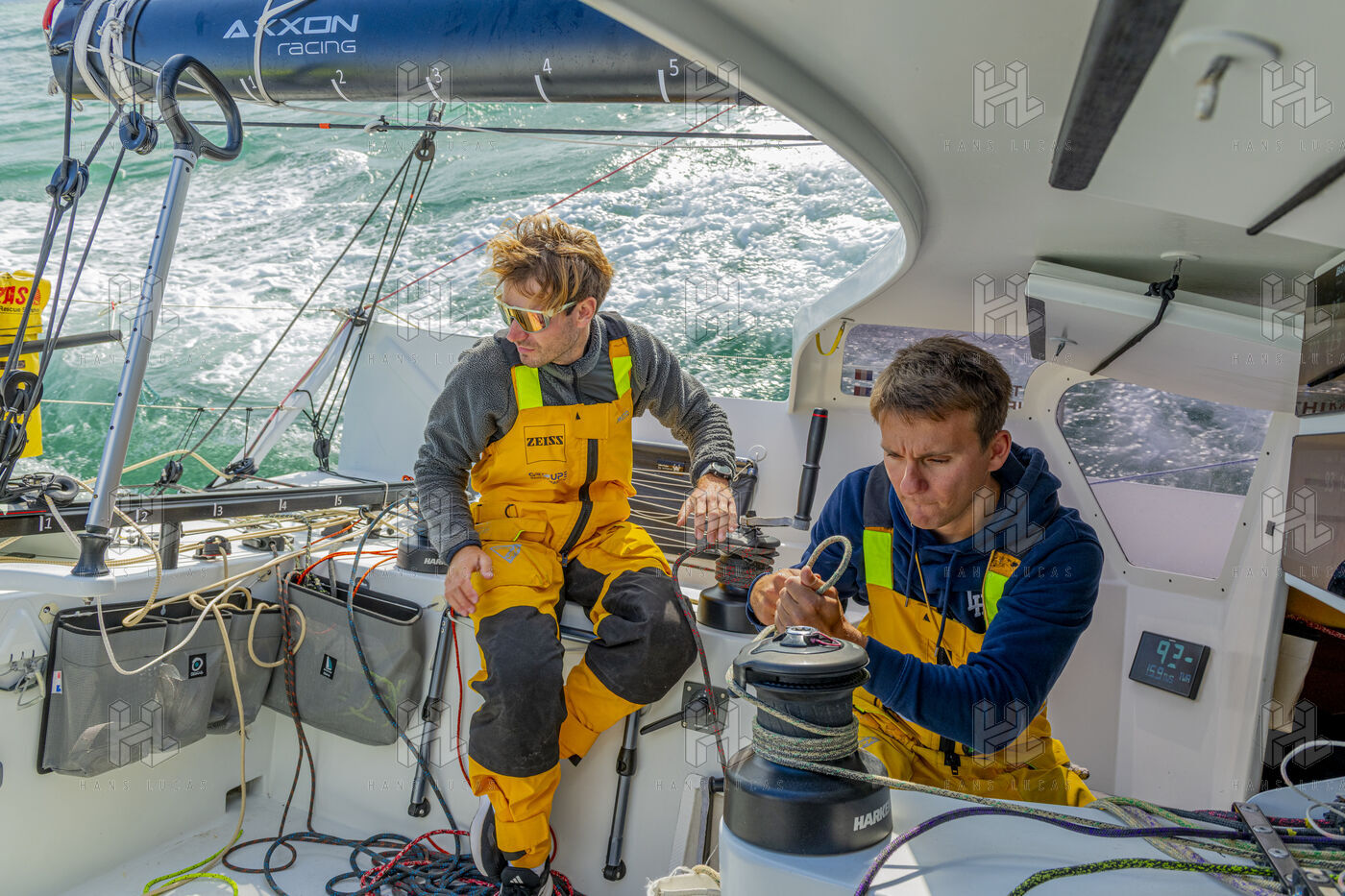 Sea trip with the crew of the Class 40 racing boat, a crew composed of Thimoté Polet, 25, a young skipper from Le Havre and student, and Pierrick Letouzé, a young skipper from Cherbourg, both form a dynamic duo, courageous, valiant, and efficient. This last trip before the start of the Transat café l'or race, 2025 edition. Off the coast of Le Havre, the Zeiss team, named after their main sponsor, is taking advantage of the beautiful sunny weather to test several sails on their boat. Departure from the marina of Le Havre on Wednesday, October 15, 2025, offshore racing and then heading to the transat village basin.