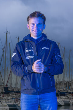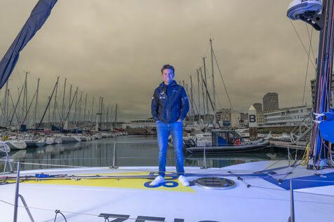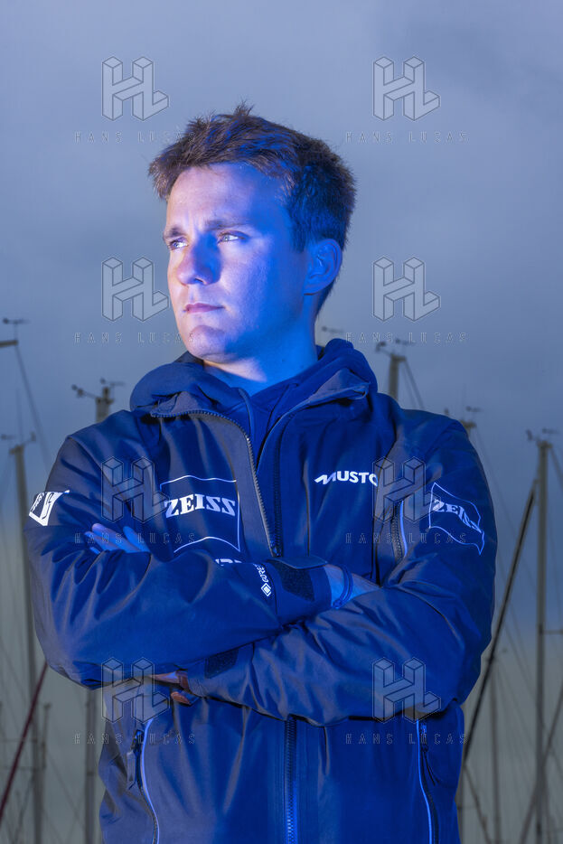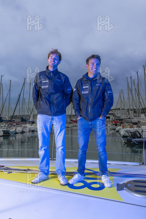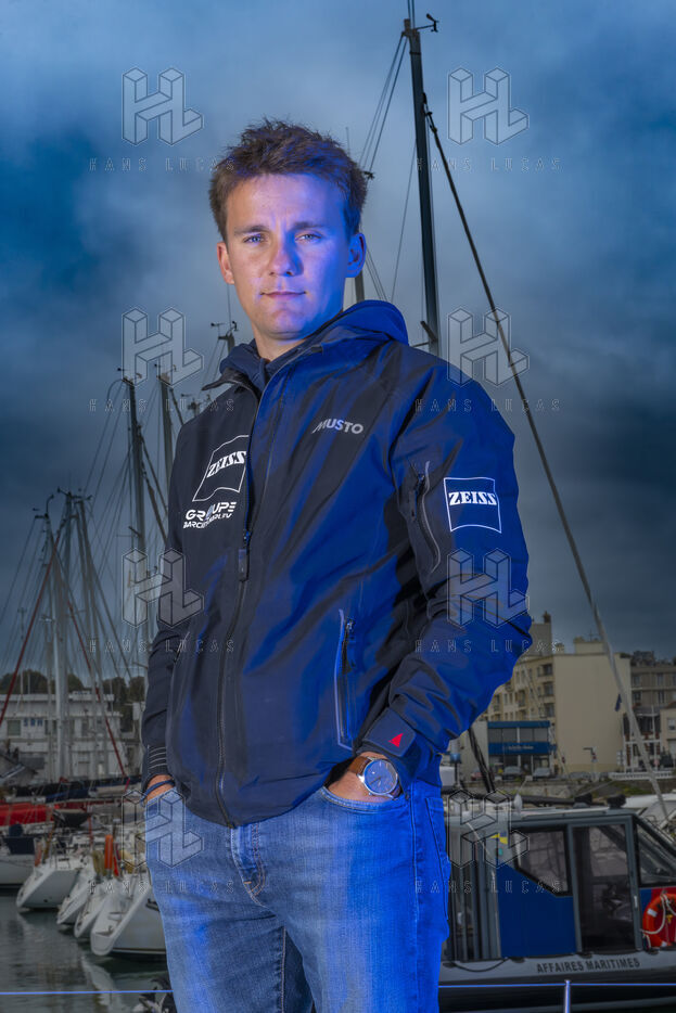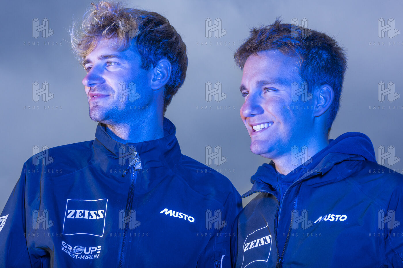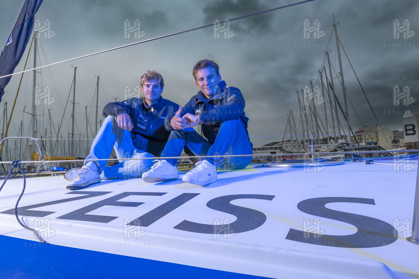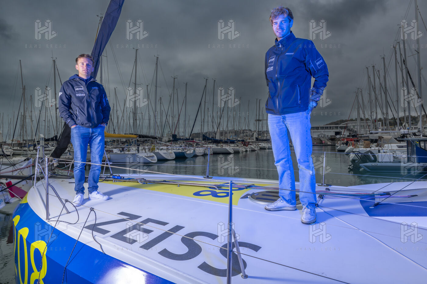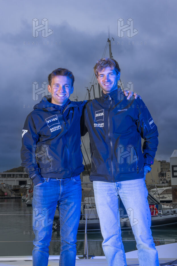Portraits of skippers Thimoté Polet and Pierrick Letouzé, on their boat of the ZEISS team, in the marina of Le Havre as part of the Café L'or Normandie transatlantic race. Thimoté Polet is from Le Havre, he is 25 years old and a student, Pierrick is from Cherbourg he is 27 years old. This is their third participation in this race and they are both professionals.