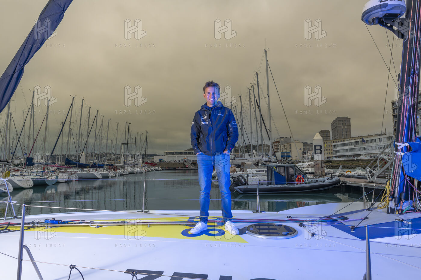 Portraits des Skippers Thimoté Polet et Pierrick Letouzé, sur leur bateau de la team ZEISS, dans le port de plaisance du Havre dans le cadre de la transat Café L'or Normandie. Thimoté Polet est originaire du Havre, il à 25 ans et est étudiant, Pierrick est originaire de Cherbourg il à 27 ans. c'est leur troisième participation à cette course et sont tout les deux professionnels.