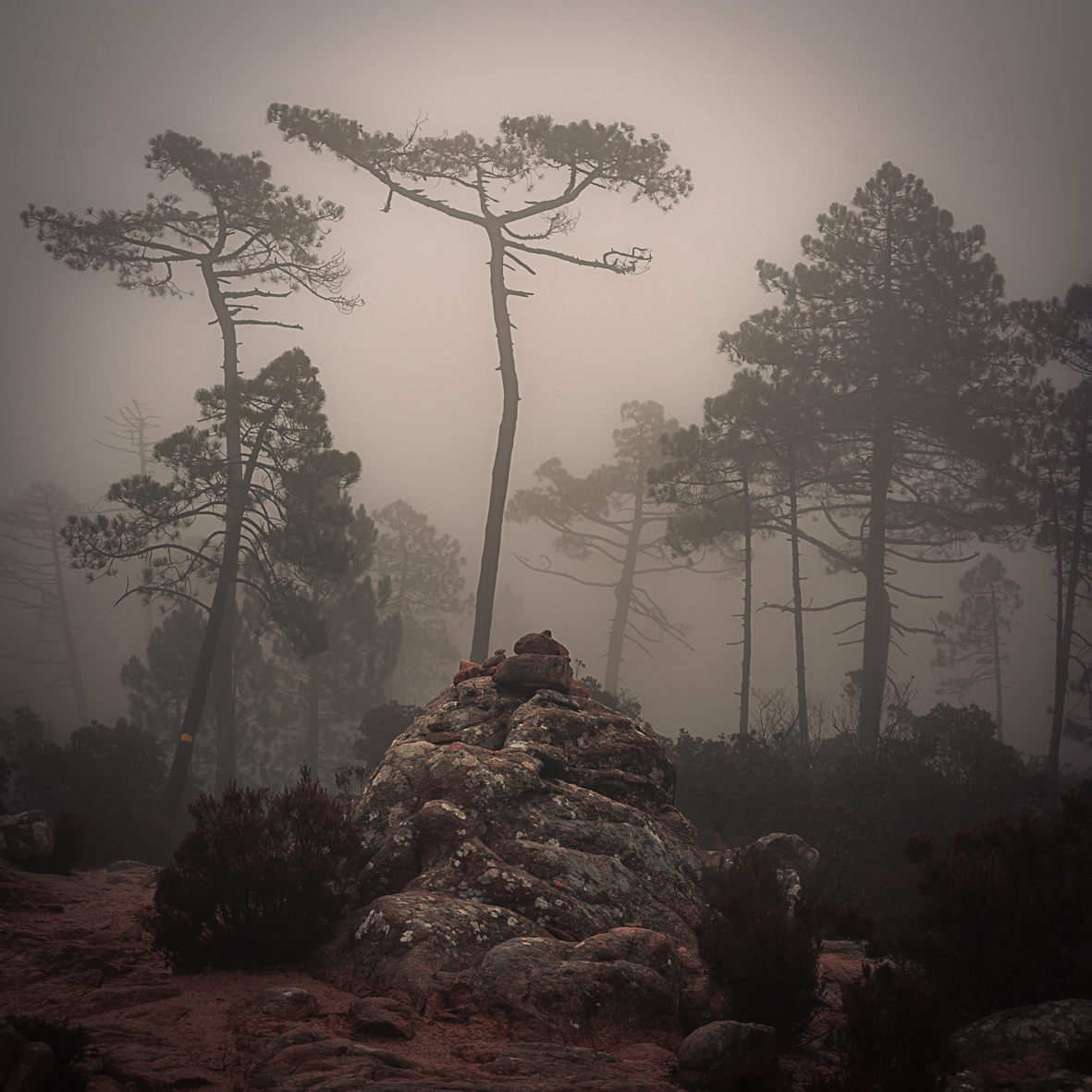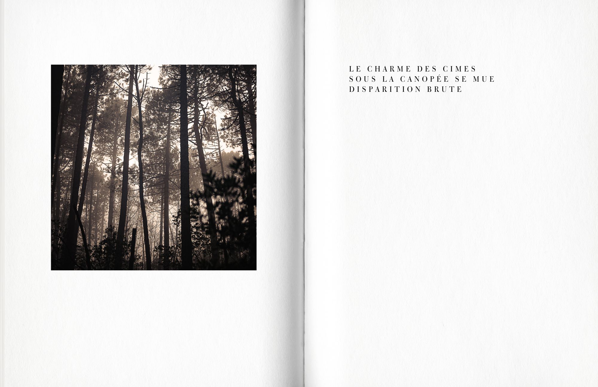 En mêlant photographies d'une nature ouatée au format carré et haïkus délicats, (l'autrice) évoque l'expérience d'un sentiment de déperdition après s'être égarée au milieu d'une forêt embrumée.