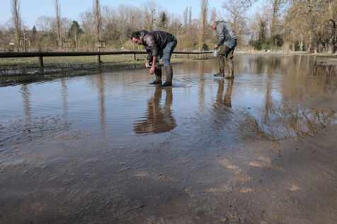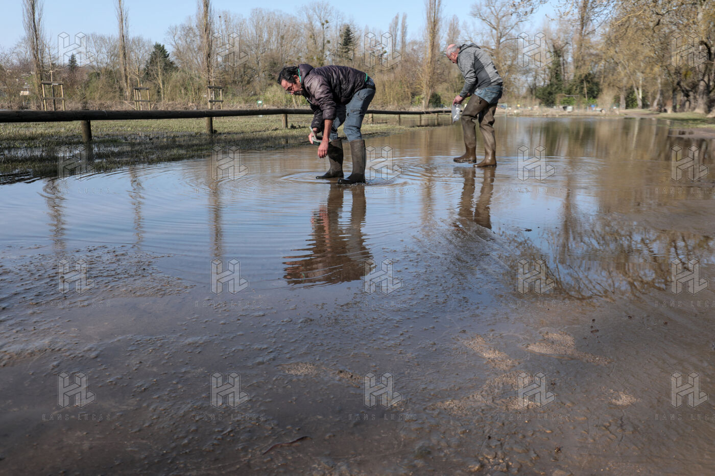 Local fishermen have returned to the riverbanks to search for worms in the silty floodwaters for their fishing work. High-water marks remain visible on fences and gates, contrasted against the tranquil reflection of the sun through willow trees as the river levels decrease, particularly in the Saint-Cybard district, the Île de la Bourgine, and the square in front of Chez Magelis.