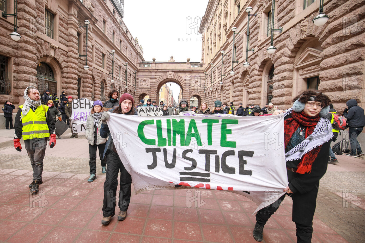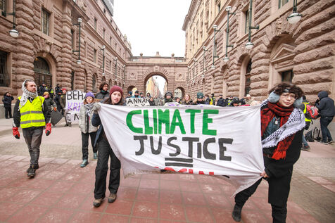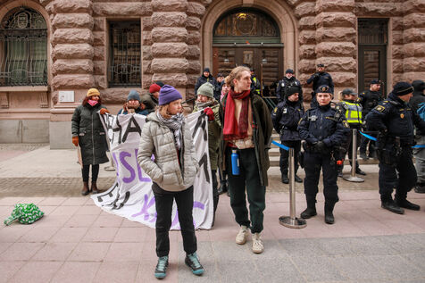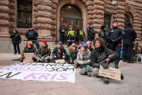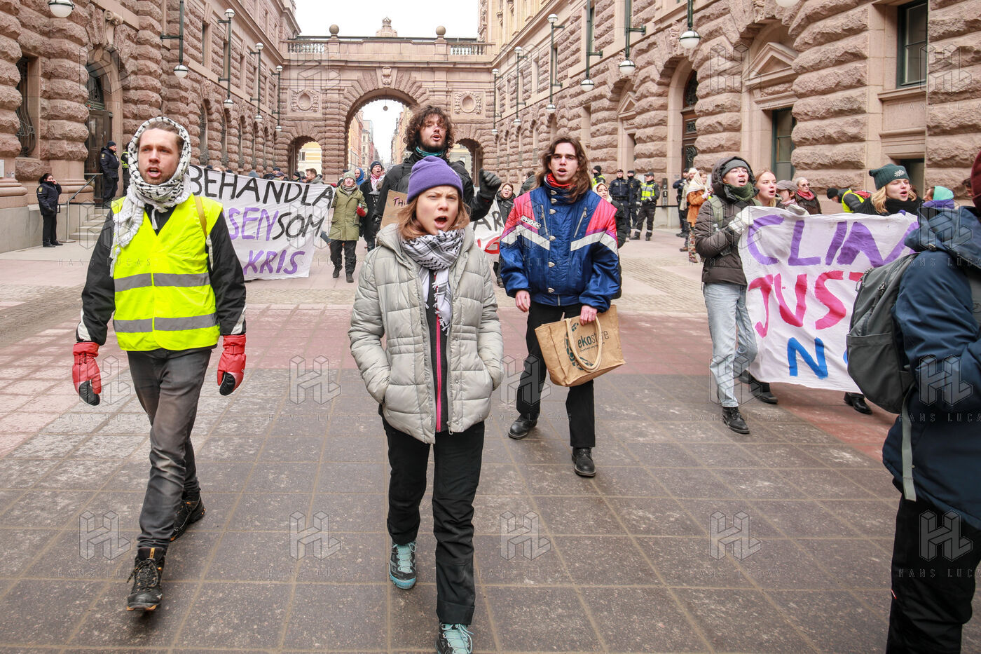 On March 13, 2024, a group of climate activists, including Greta Thunberg, protests against climate change outside the Swedish parliament, the Riksdag, in Stockholm, Sweden. Amid a police presence, the group displays banners demanding immediate political action, featuring slogans like "Treat the crisis like a crisis," "Climate Justice Now," and "THIS IS WHAT DEMOCRACY LOOKS LIKE."