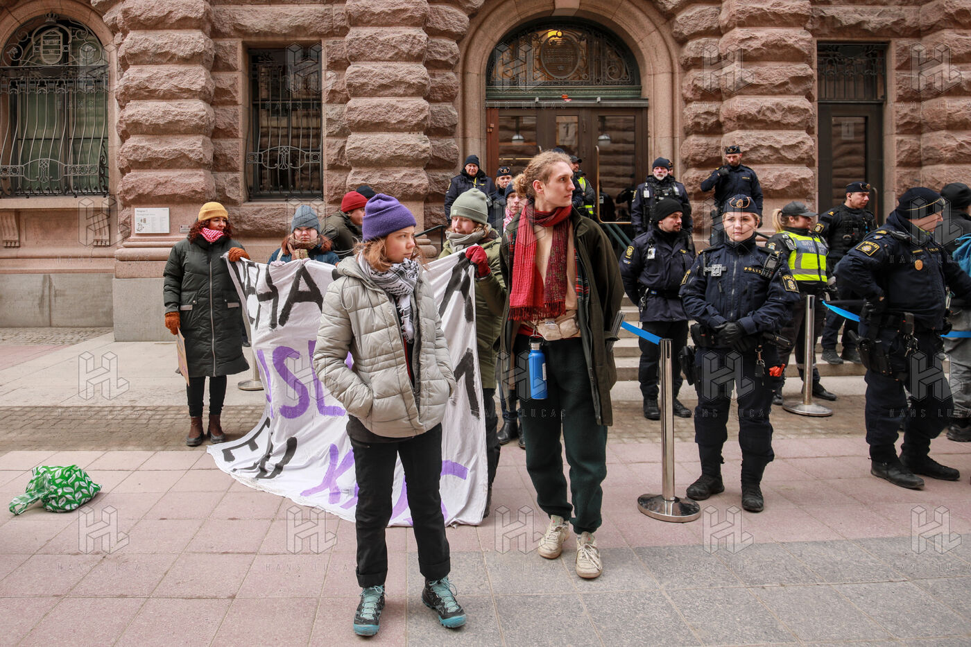 Le 13 mars 2024, un groupe de militants pour le climat, dont Greta Thunberg, manifeste contre le changement climatique devant le Riksdag, le parlement suédois, à Stockholm, en Suède. Sous surveillance policière, le groupe déploie des banderoles exigeant une action politique immédiate, arborant des slogans tels que « Traitez la crise comme une crise », « Climate Justice Now » et « THIS IS WHAT DEMOCRACY LOOKS LIKE ».