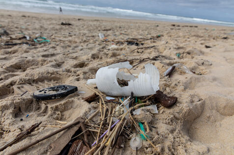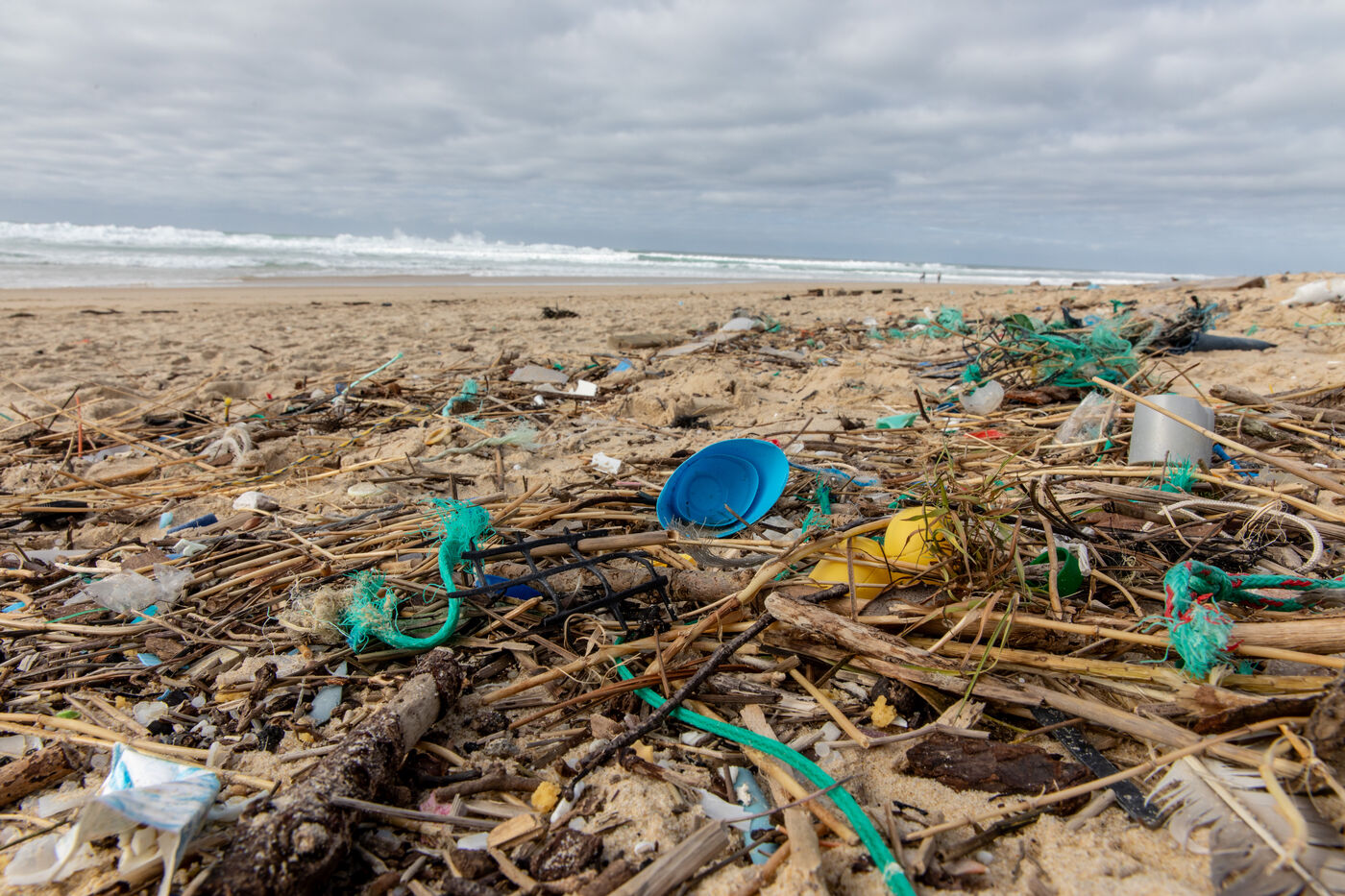 Mimizan plage, France, 2024-02-19. Dozens of pieces of plastic waste washed up by the ocean on a beach at Mimizan Plage. Plastic pollution from human waste affects the entire marine ecosystem and oceans. Photography by Sebastien Lapeyrere.