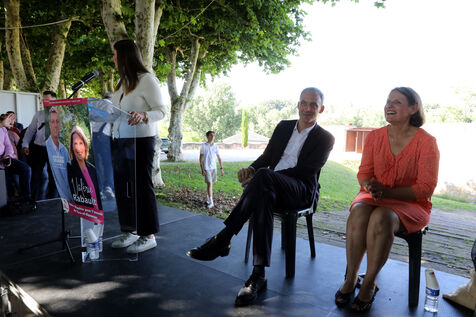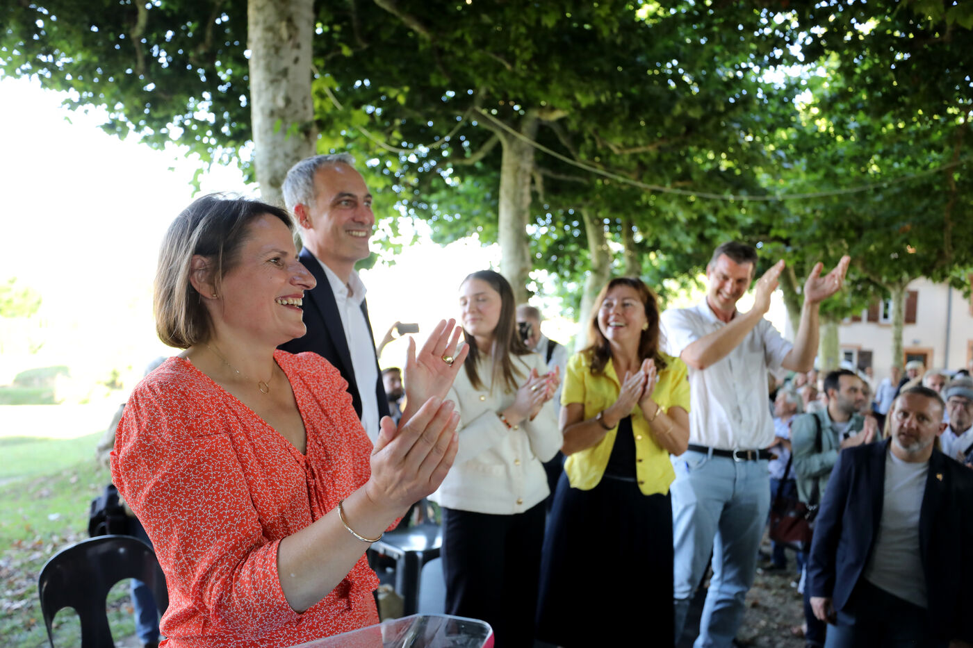 Negreplisse, France, 2024-06-24. Valerie Rabault ( Pink dress ) outgoing deputy (PS - Nouveau Front de Gauche) for the 1st constituency of Tarn-et-Garonne accompanied by Raphael Glucksmann European deputy at a meeting of Valerie Rabault in her constituency for the 2024 early legislative elections in Negreplisse . Photography by Sebastien Lapeyrere.