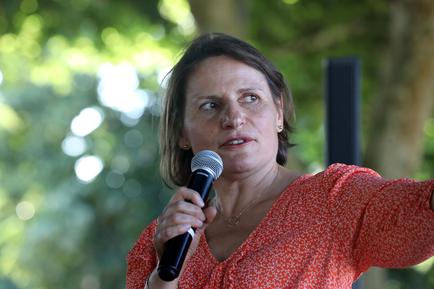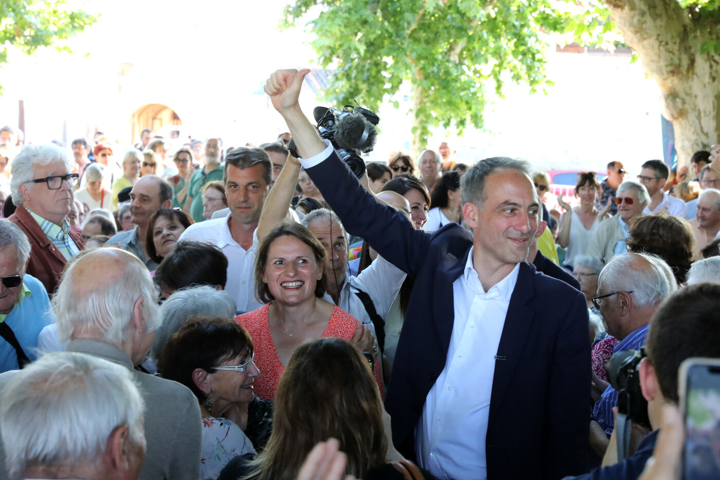 Negreplisse, France, 2024-06-24. Valérie Rabault député sortante (PS - Nouveau Front de Gauche) de la 1ere circonscription du Tarn-et-Garonne accompagné par Raphael Glucksmann député europeen lors d'un meeting de Valérie Rabault dans sa circonscription pour les élections législatives anticipée de 2024 à Negreplisse . Photographie par Sébastien Lapeyrère.
