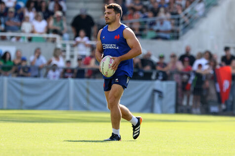 Pau, France, 2024-07-11. Séance d'entraînement au stade du Hameau à Pau pour les joueurs de l' équipe de France de rugby à 7 lors du stage de préparation avant les Jeux olympiques de Paris 2024 .Photographie par Sebastien Lapeyrere.