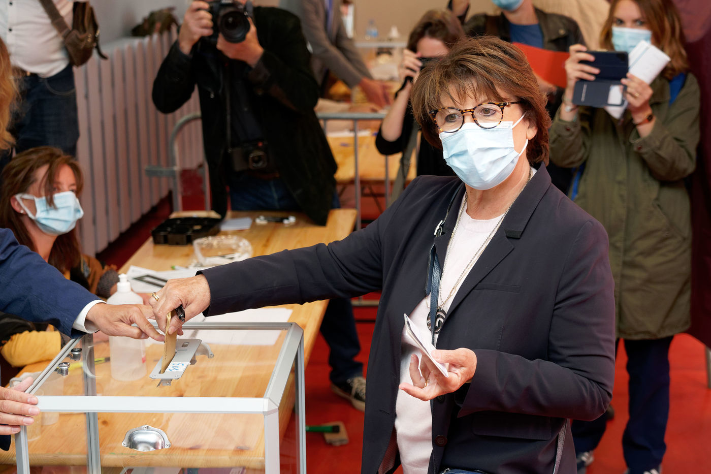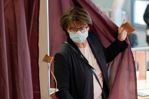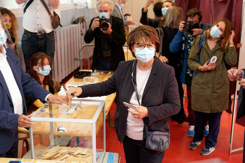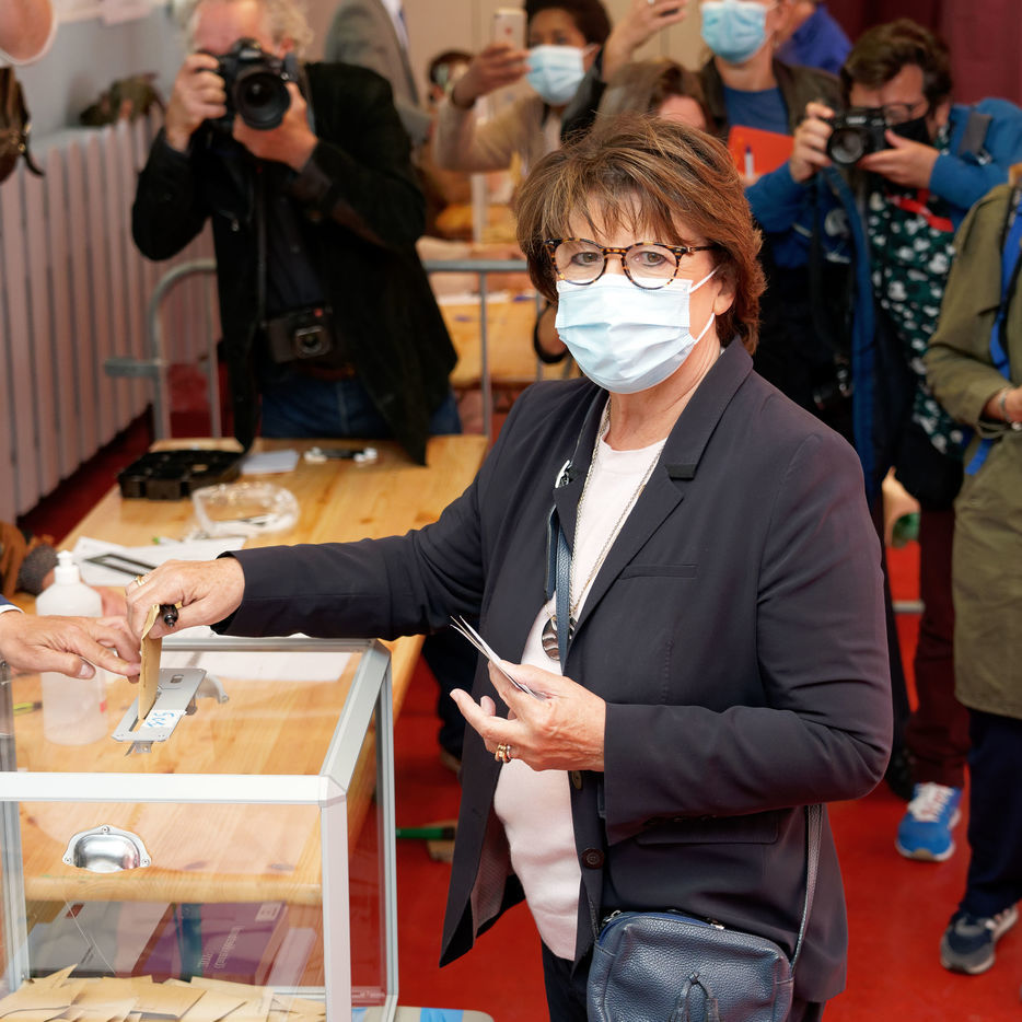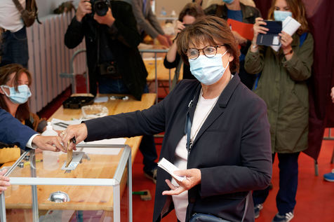 Socialist Party (PS) mayor of Lille Martine Aubry casts her ballot to vote for the second round of the French mayoral elections at a polling station on June 28, 2020 in Lille, France.