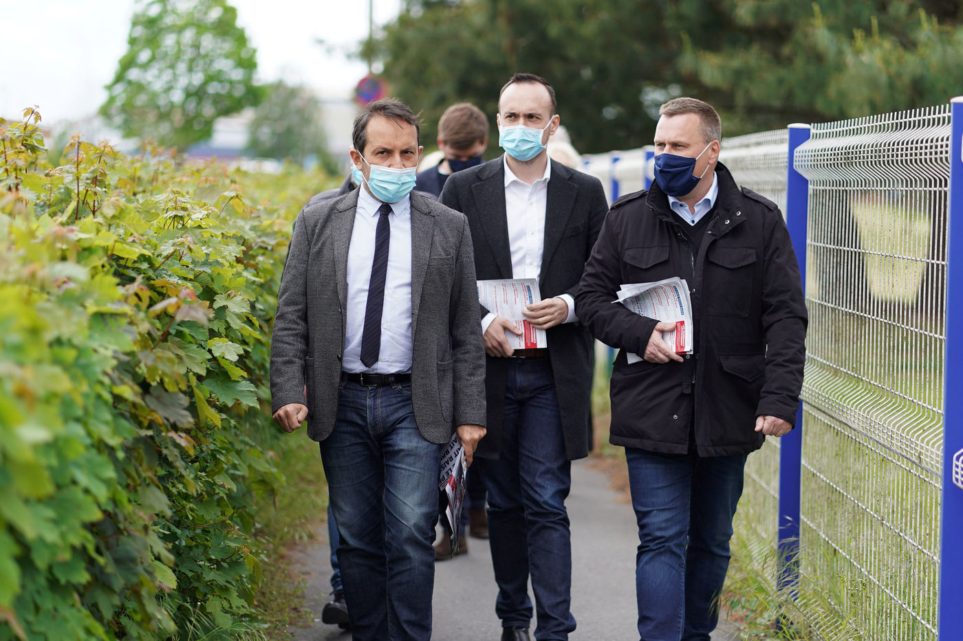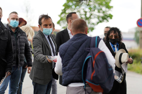 Far right party Rassemblement National (National Rally) candidate for upcoming regional election in northern France, Sebastien Chenu, campaigns in Henon-Beaumont, France, on May 21, 2021.