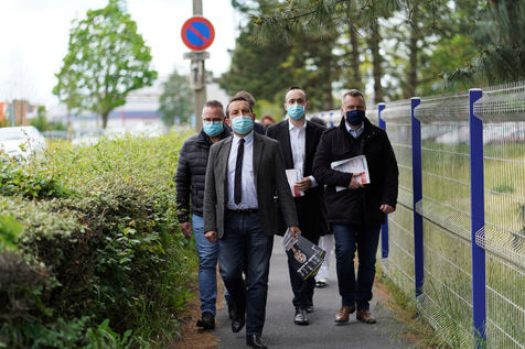 Sebastien Chenu (RN) en campagne pour les elections regionales tracte a la sortie d'une usine a Henon-Beaumont, France, le 21 Mai 2021