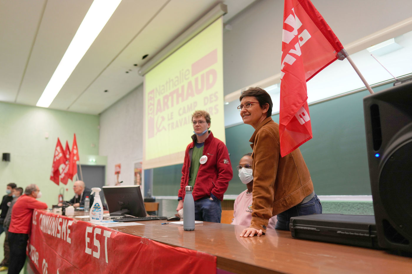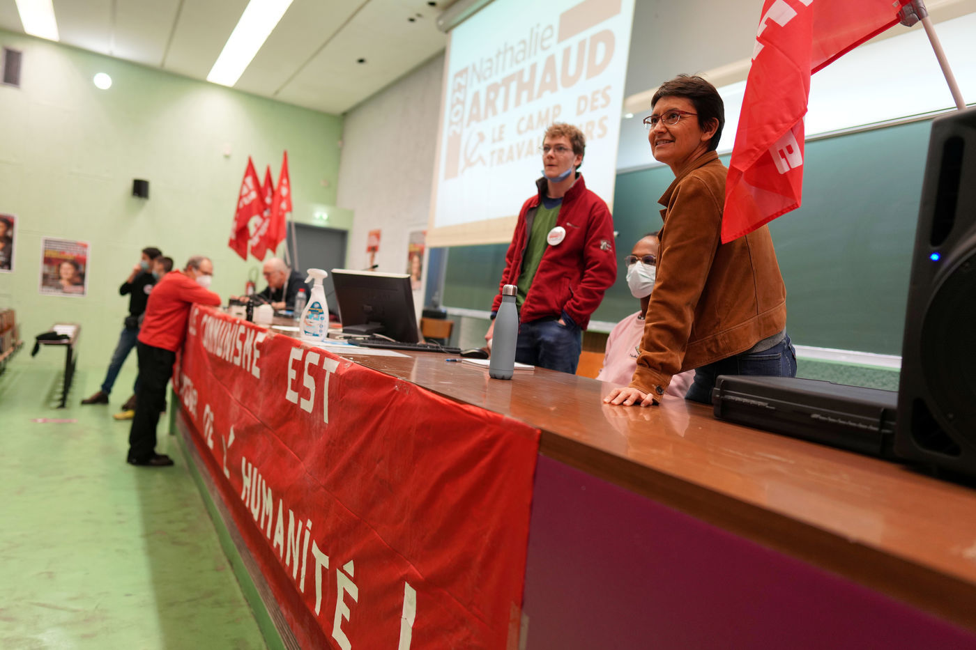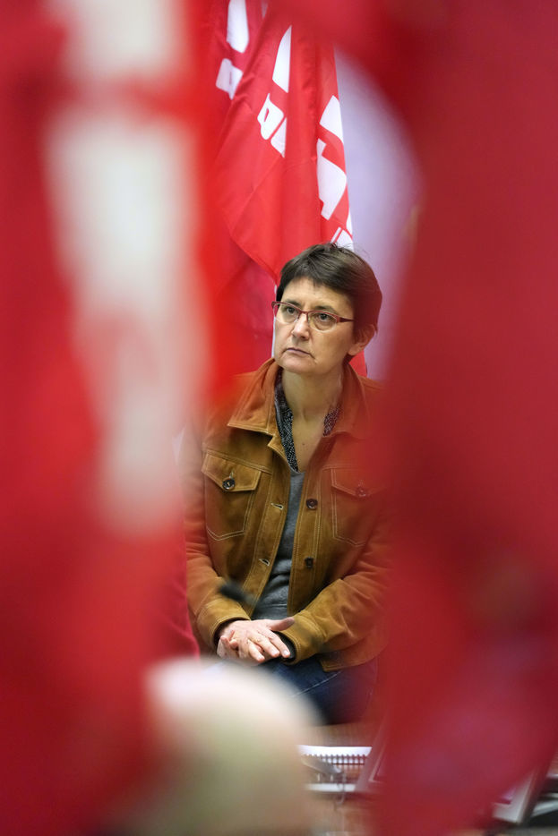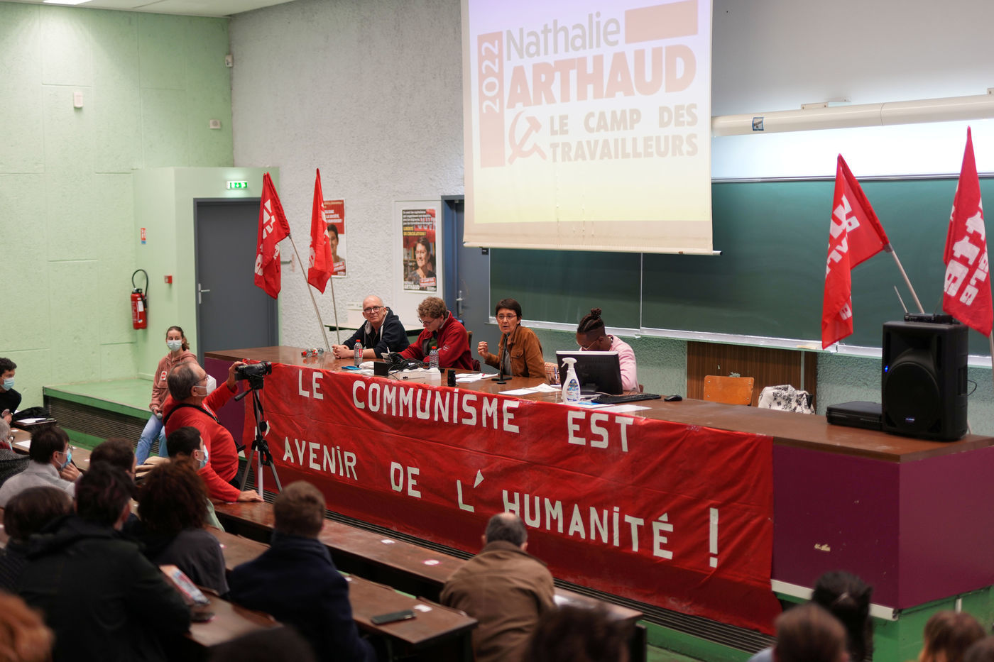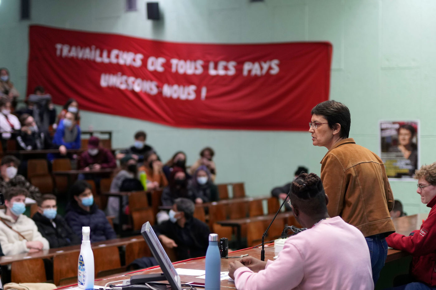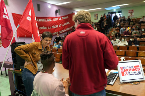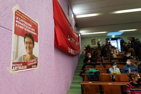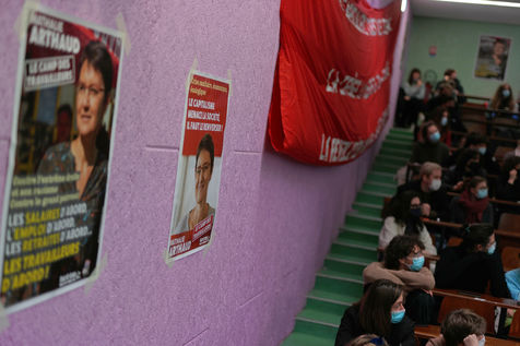 French far-left party's leader Lutte Ouvriere and candidate for the 2022 presidential election, Nathalie Arthaud, holds a meeting at Lille's University, in Villeneuve d'Ascq, northern France, on February 07, 2022.