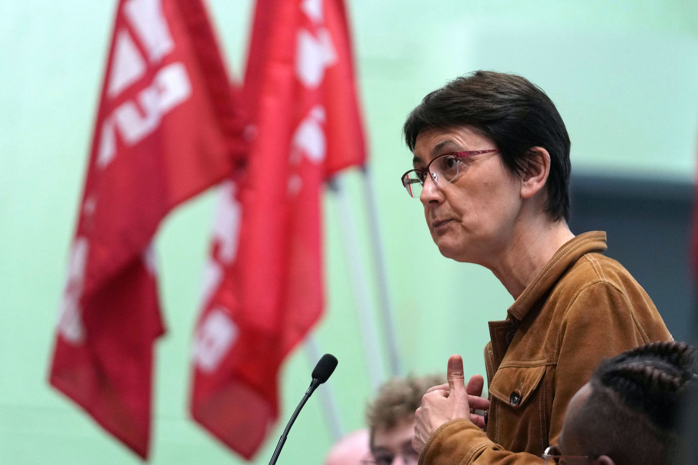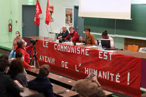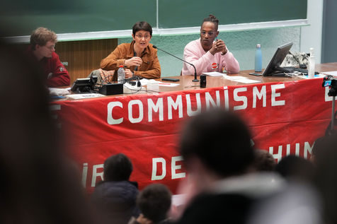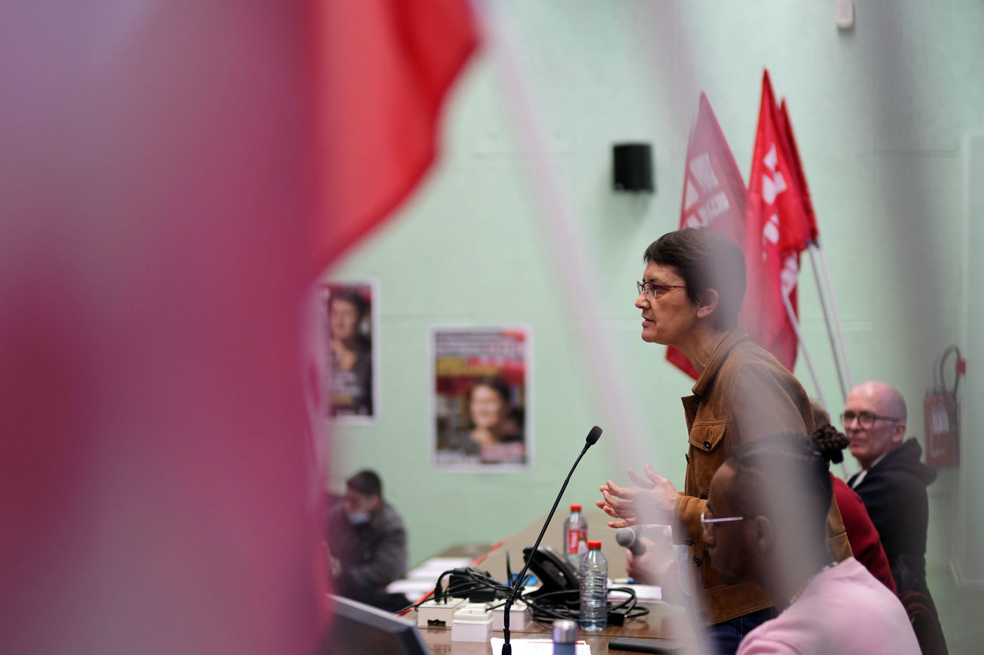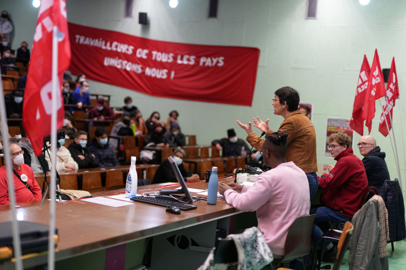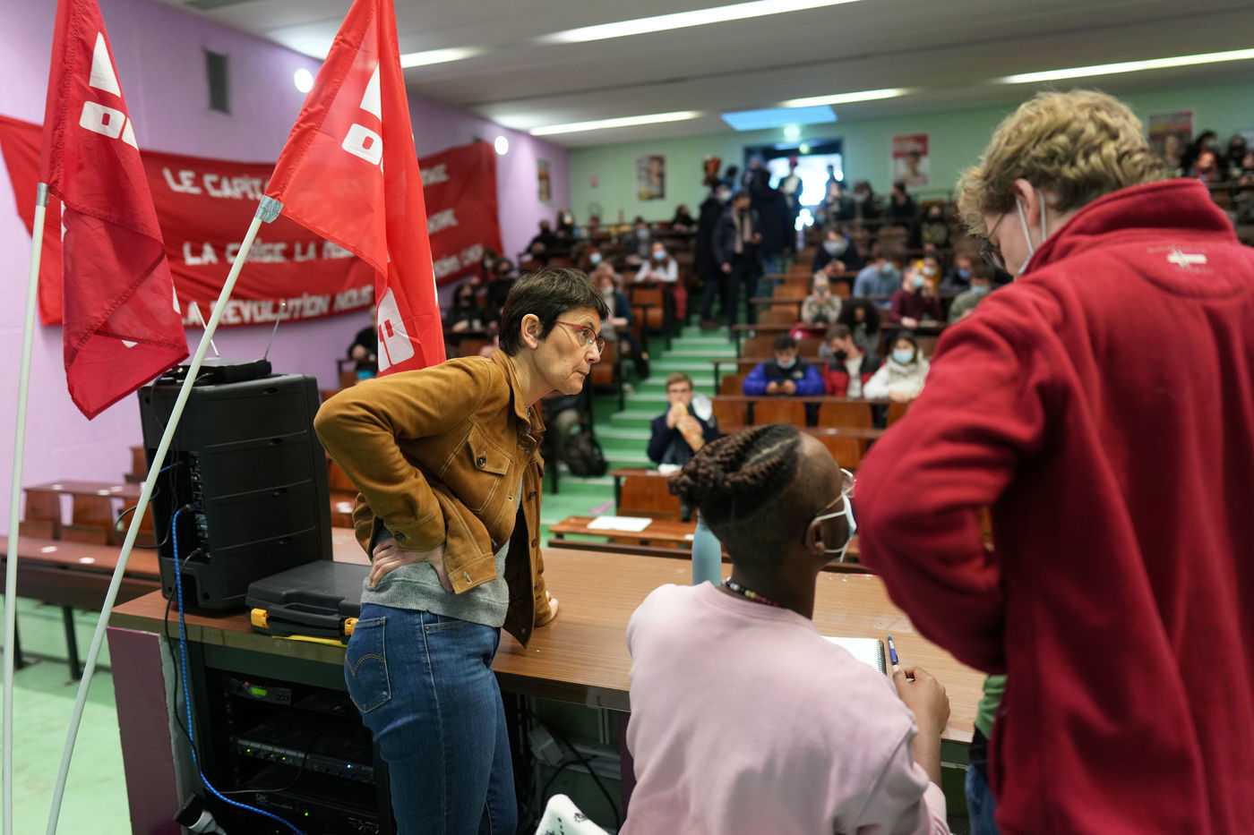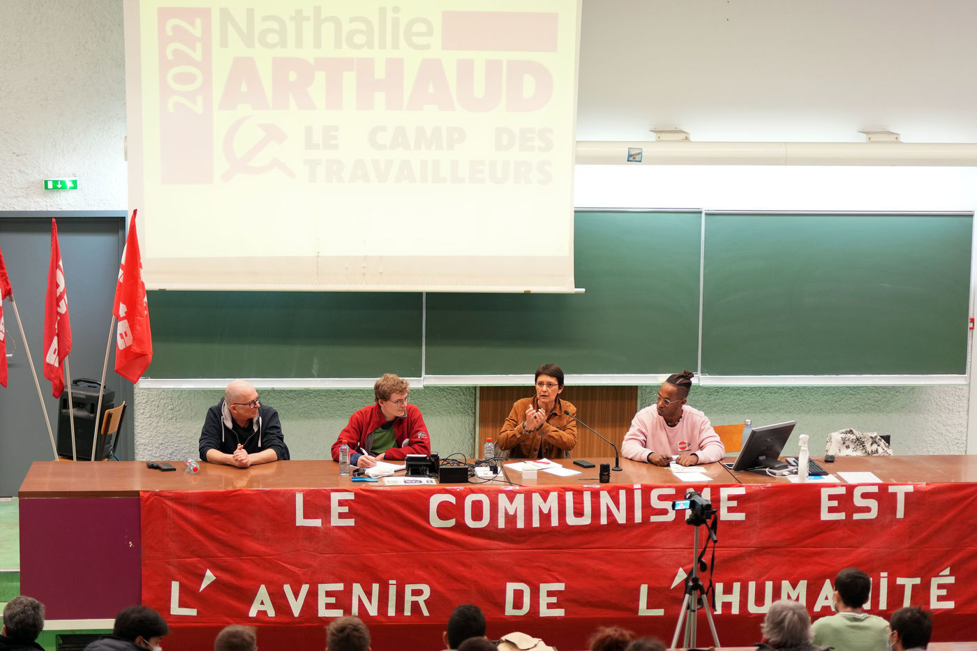 French far-left party's leader Lutte Ouvriere and candidate for the 2022 presidential election, Nathalie Arthaud, holds a meeting at Lille's University, in Villeneuve d'Ascq, northern France, on February 07, 2022.