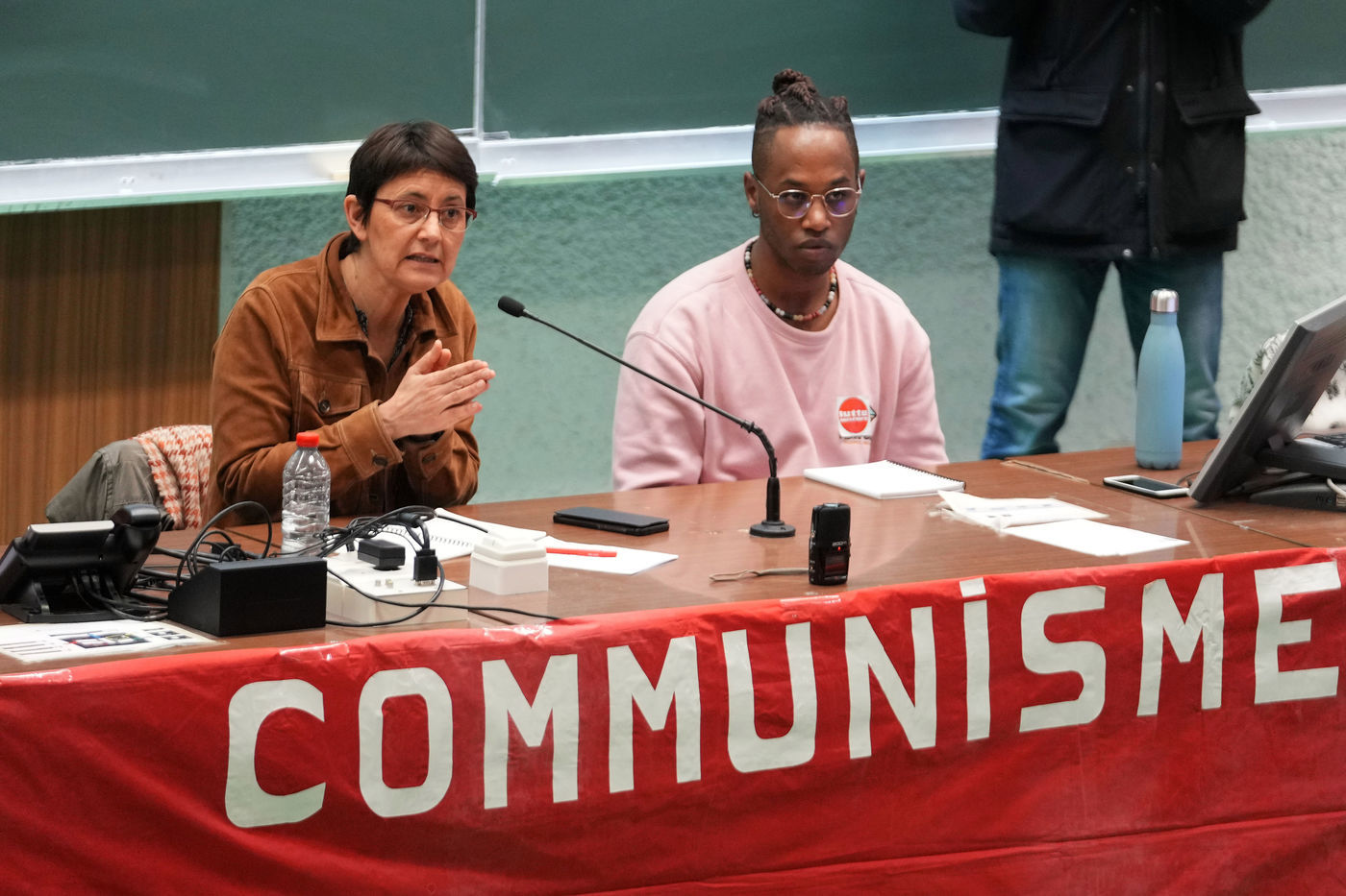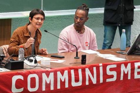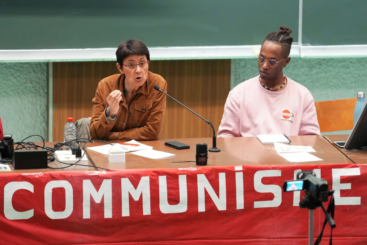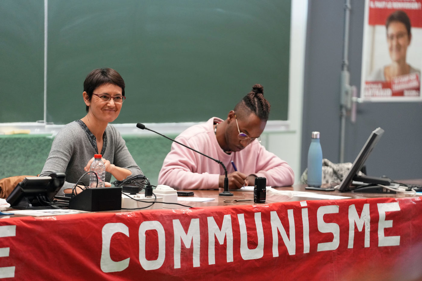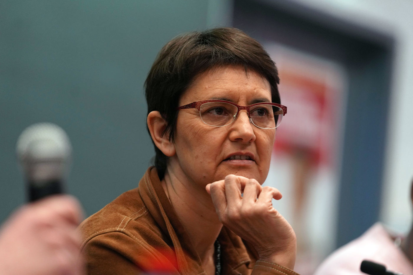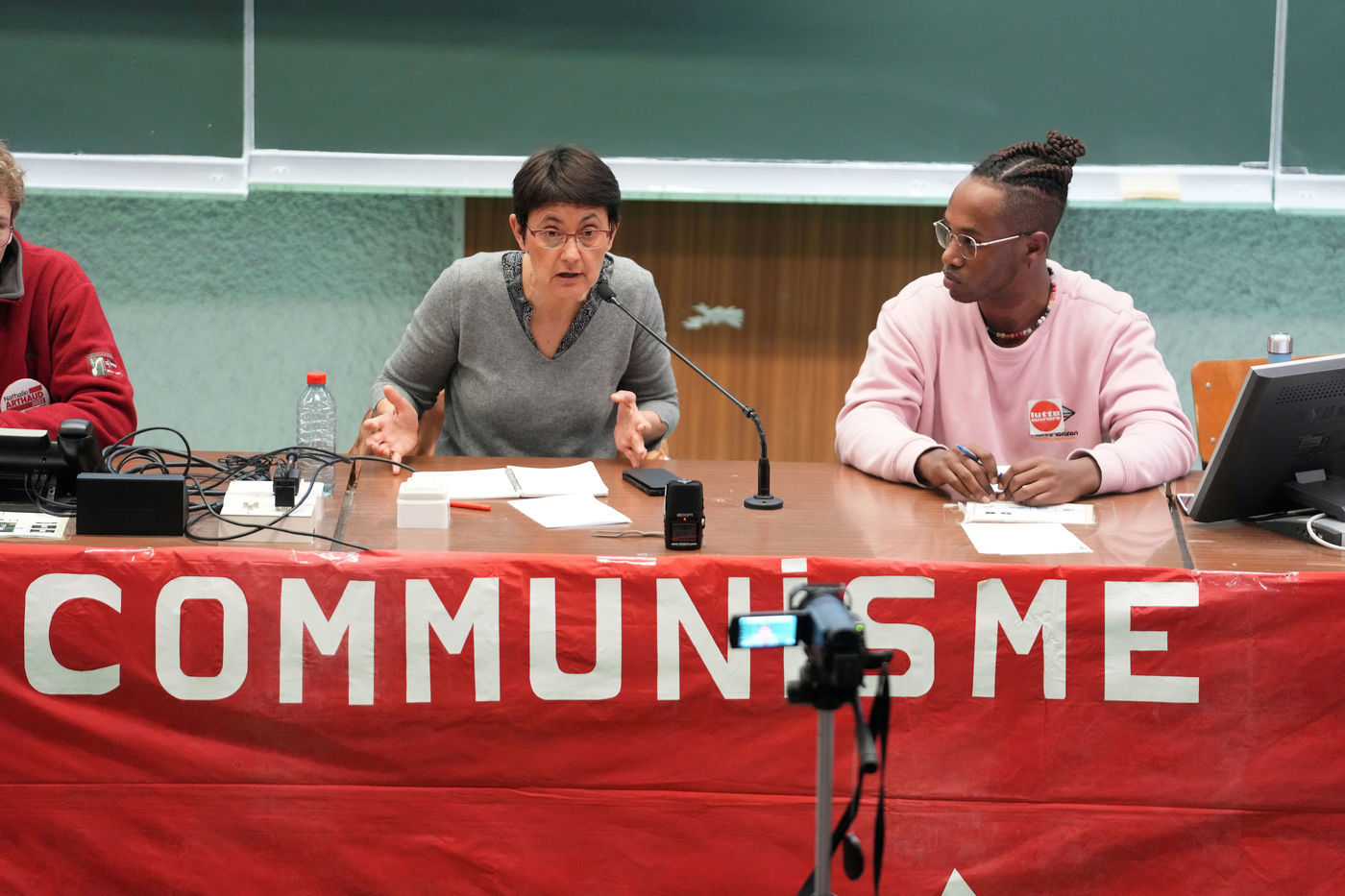 French far-left party's leader Lutte Ouvriere and candidate for the 2022 presidential election, Nathalie Arthaud, holds a meeting at Lille's University, in Villeneuve d'Ascq, northern France, on February 07, 2022.