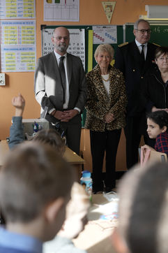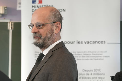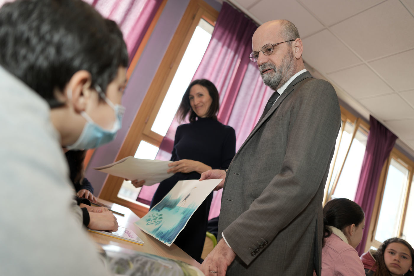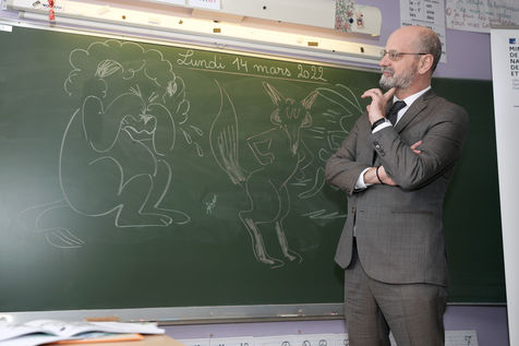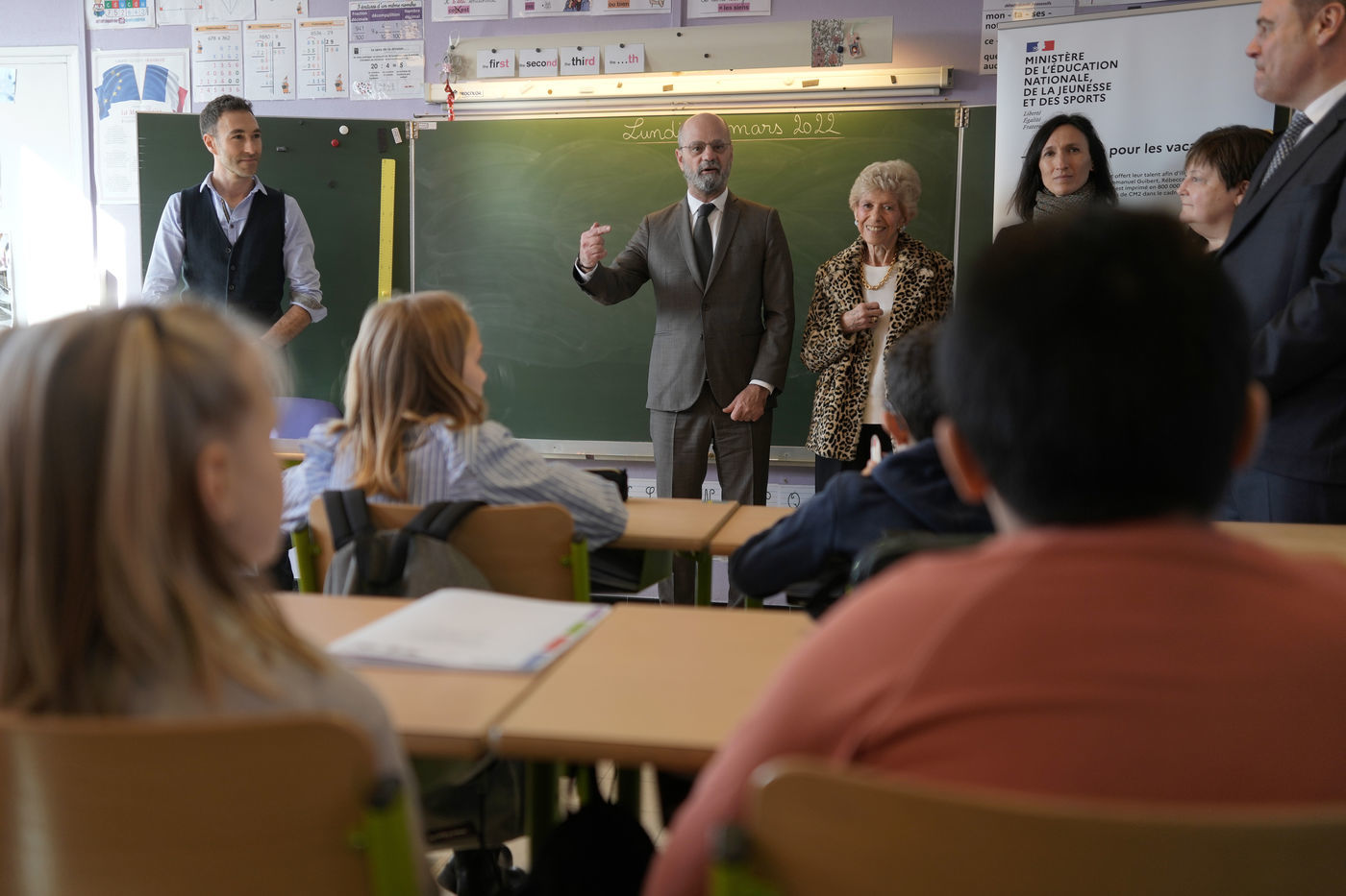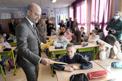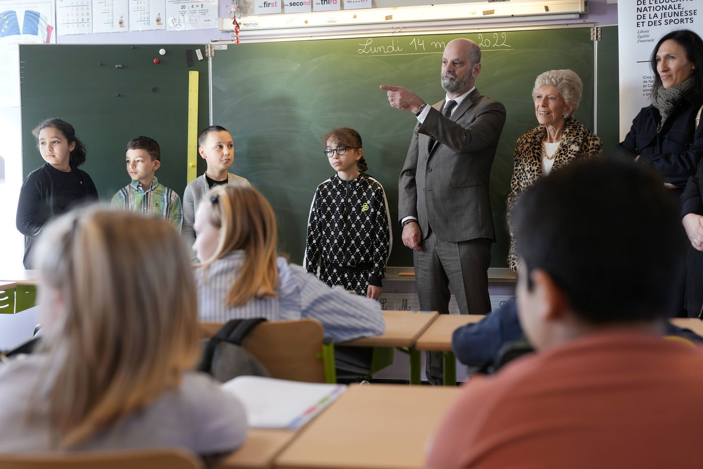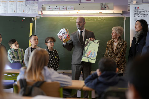 France's Education, Youth and Sports Minister Jean-Michel Blanquer, permanent Secretary to the Academie Francaise French historian Helene Carrere d'Encausse and Catherine Meurisse visit a primary school in Valenciennes, northern France, on March 14, 2022 for the launching of "Fables de La Fontaine". On the same day, the French government lifted the restrictions linked to the Covid pandemic, including the wearing of masks, which is no longer compulsory in schools.