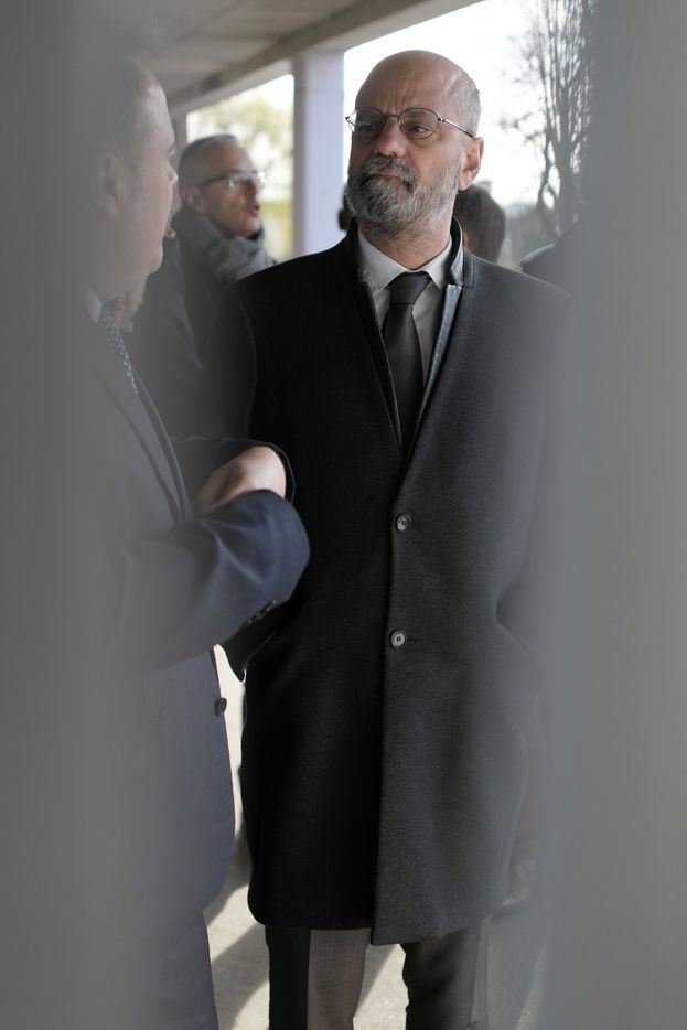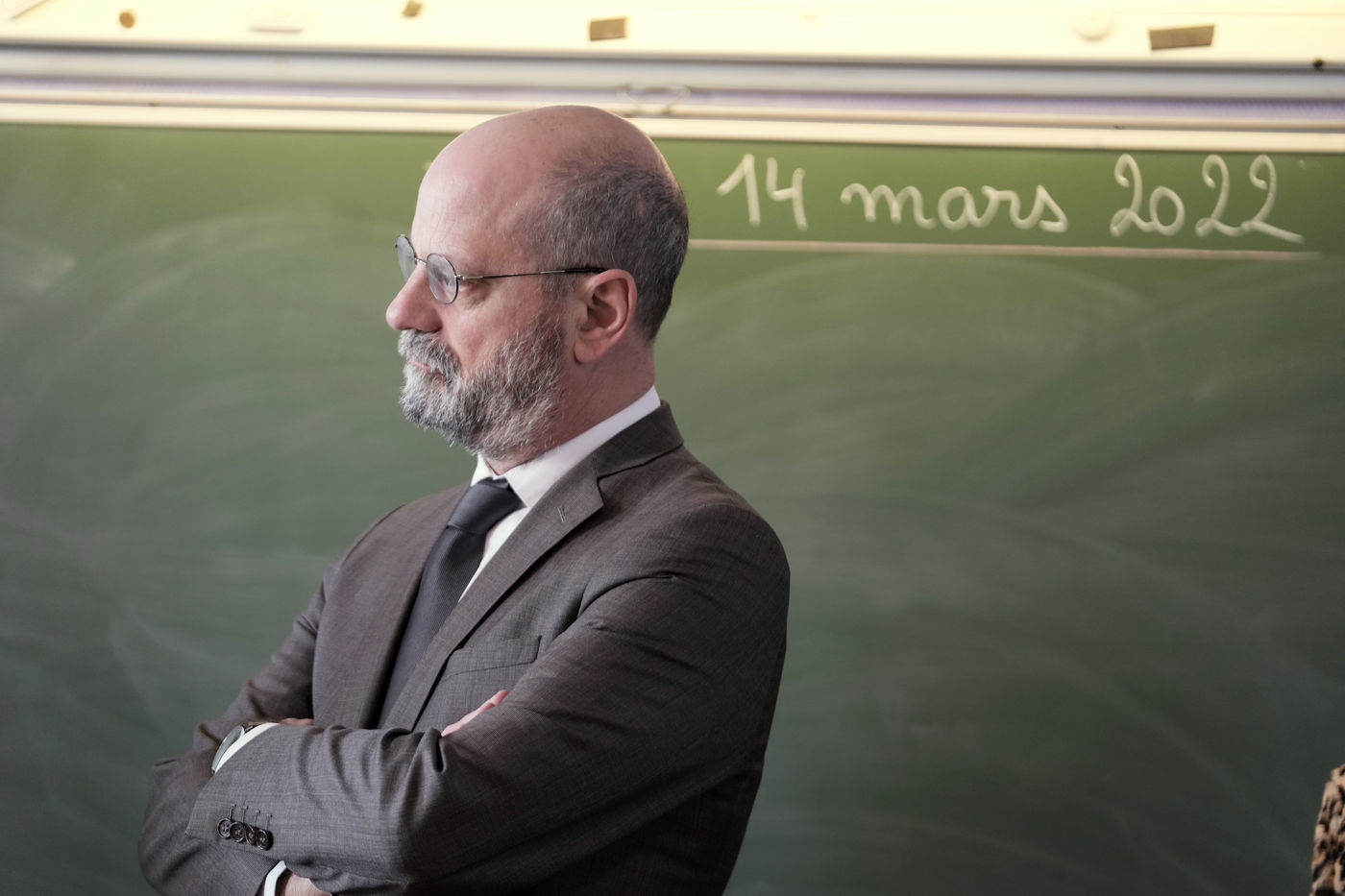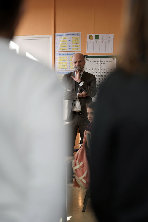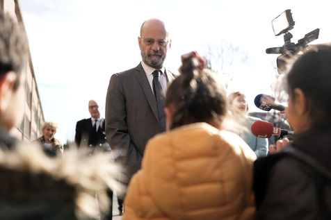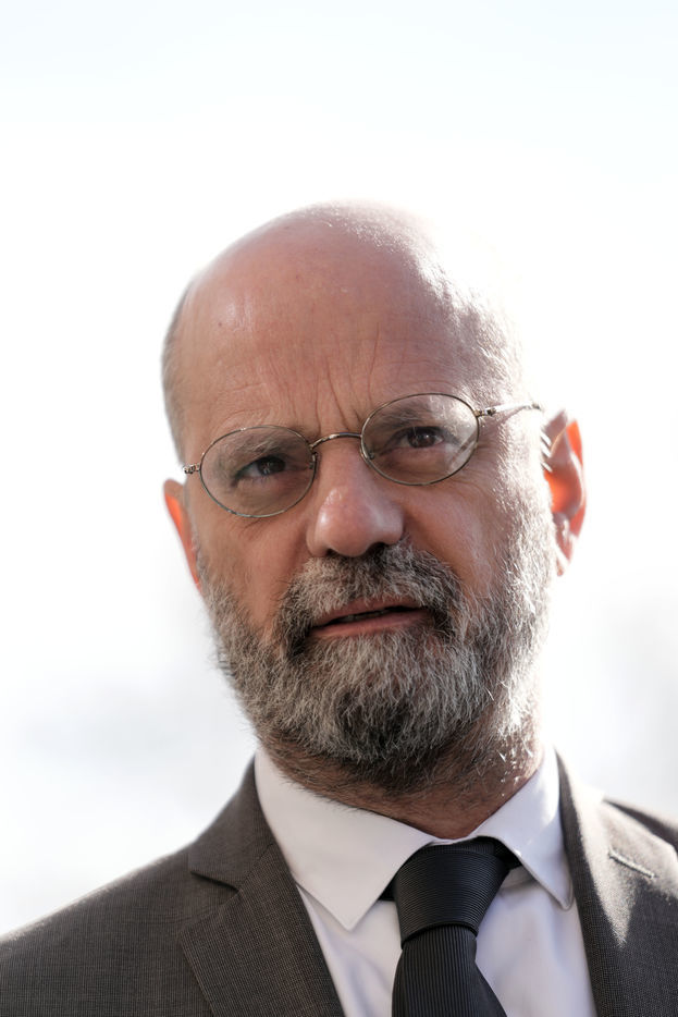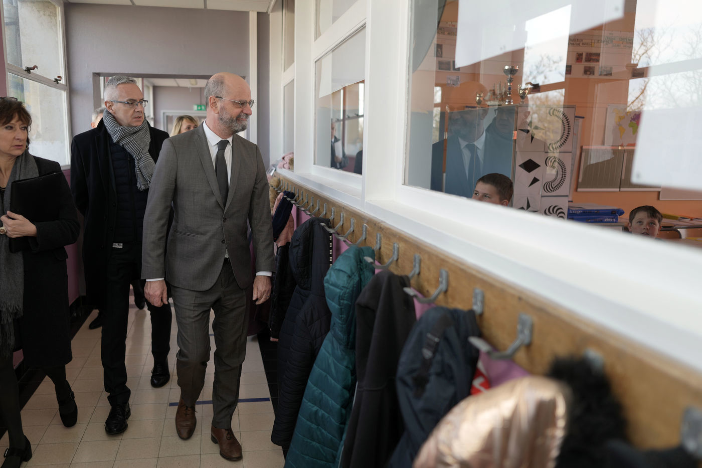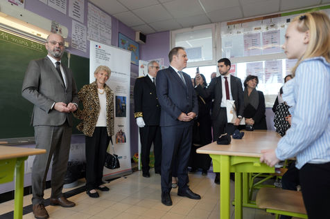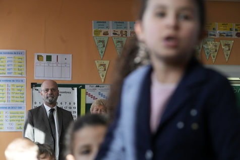 France's Education, Youth and Sports Minister Jean-Michel Blanquer, permanent Secretary to the Academie Francaise French historian Helene Carrere d'Encausse and Catherine Meurisse visit a primary school in Valenciennes, northern France, on March 14, 2022 for the launching of "Fables de La Fontaine". On the same day, the French government lifted the restrictions linked to the Covid pandemic, including the wearing of masks, which is no longer compulsory in schools.