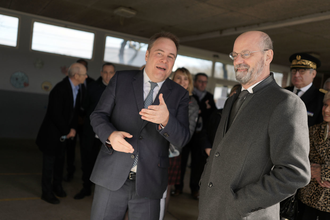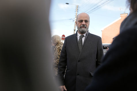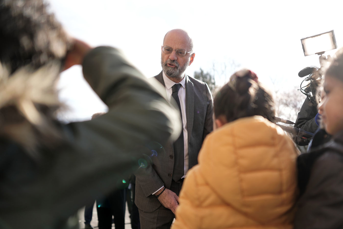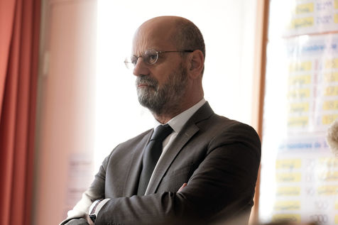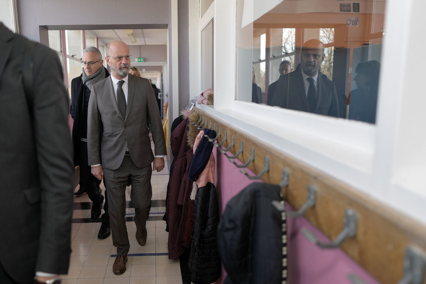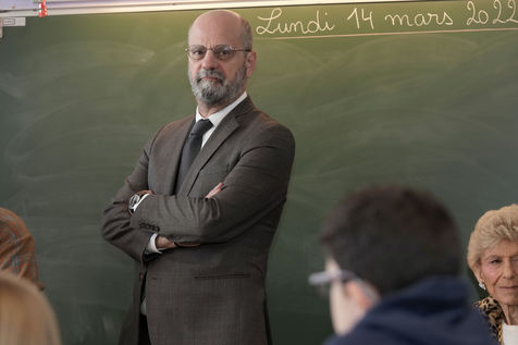France's Education, Youth and Sports Minister Jean-Michel Blanquer, permanent Secretary to the Academie Francaise French historian Helene Carrere d'Encausse and Catherine Meurisse visit a primary school in Valenciennes, northern France, on March 14, 2022 for the launching of "Fables de La Fontaine". On the same day, the French government lifted the restrictions linked to the Covid pandemic, including the wearing of masks, which is no longer compulsory in schools.