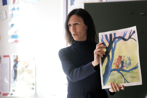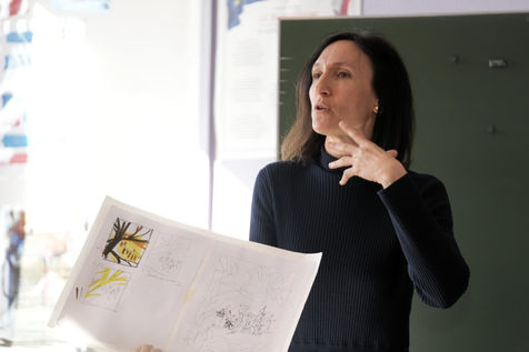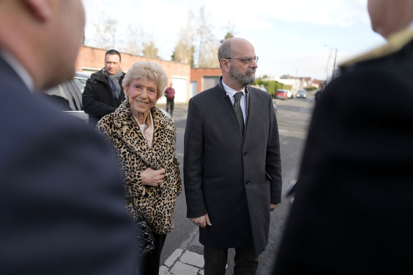 Le ministre français de l'éducation, de la jeunesse et des sports, Jean-Michel Blanquer, le secrétaire perpétuel de l'Académie française, l'historienne Helene Carrere d'Encausse et Catherine Meurisse visitent une école primaire de Valenciennes, dans le nord de la France, le 14 mars 2022, à l'occasion du lancement des "Fables de La Fontaine". Le même jour, le gouvernement français lève les restrictions liées à la pandémie de Covid, dont le port du masque, qui n'est plus obligatoire dans les écoles.