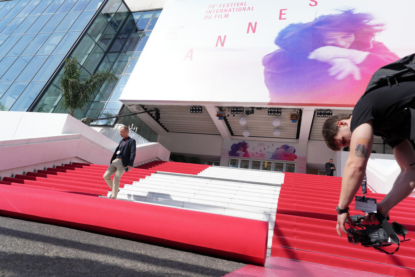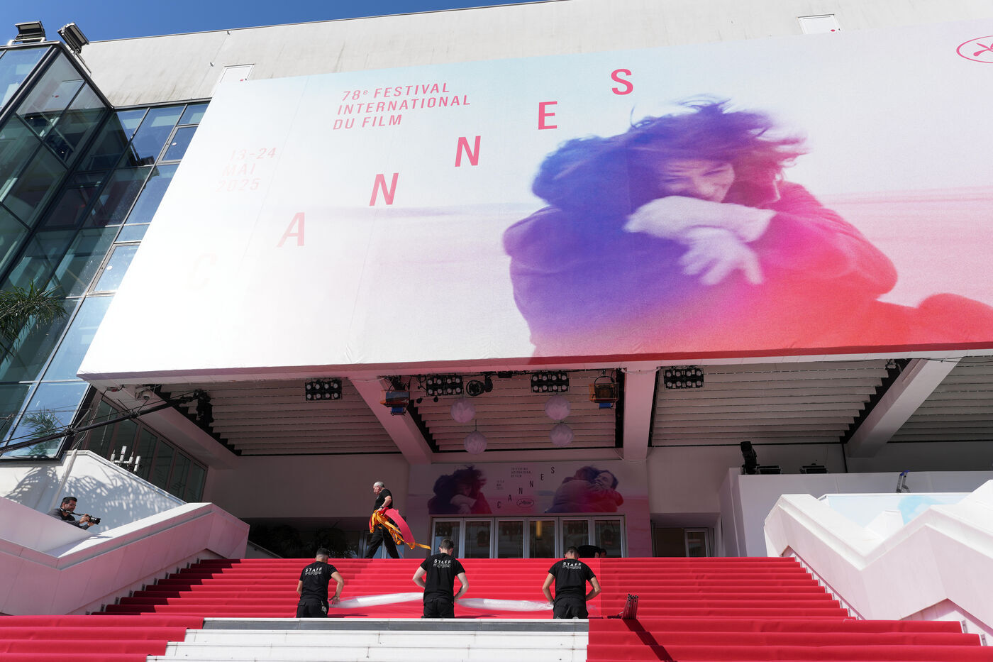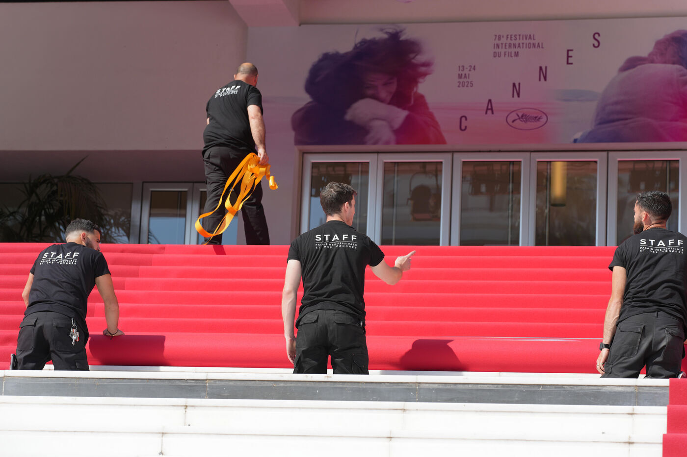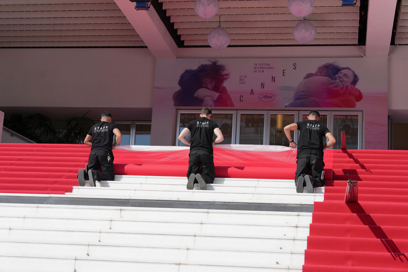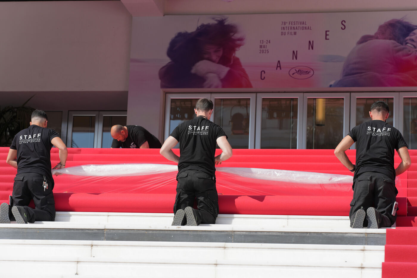 Workers prepare the red carpet to be rolled out ahead of the 78th annual Cannes film festival at Palais des Festivals on May , 2025 in Cannes, France.