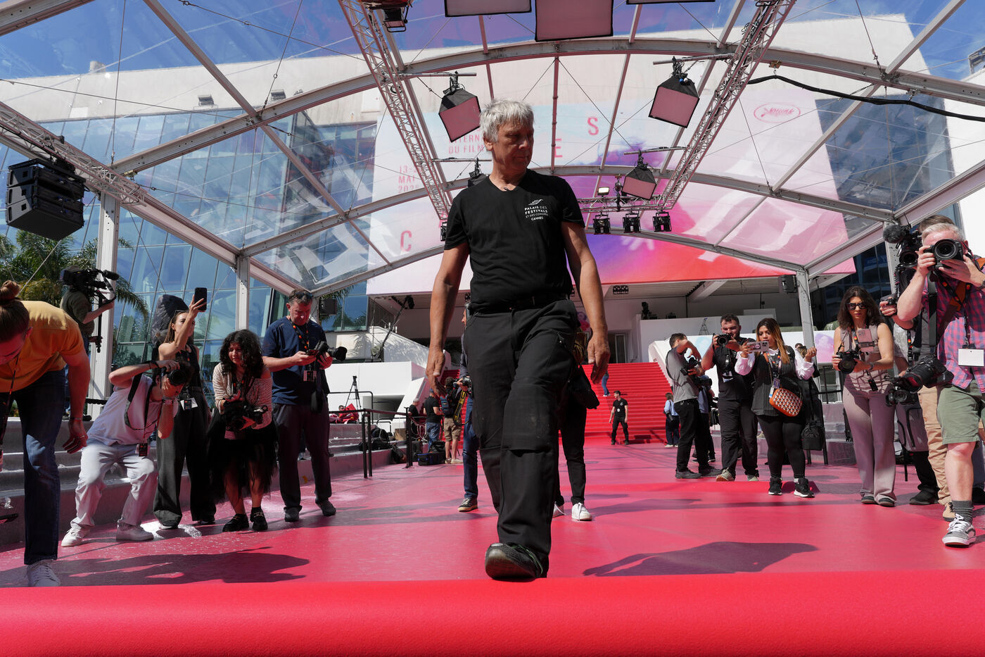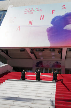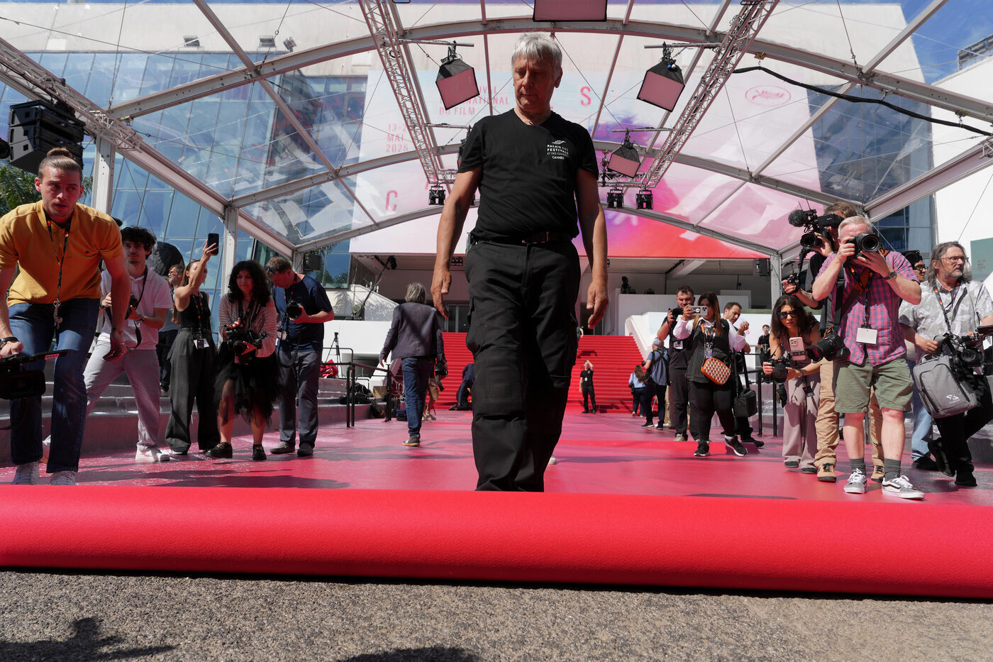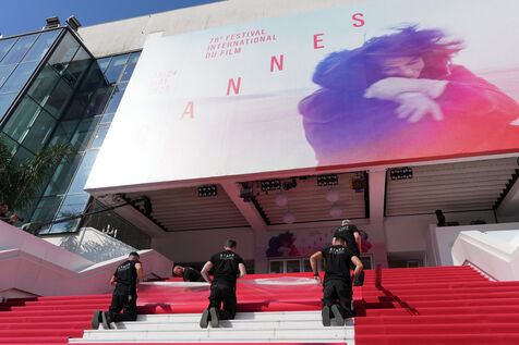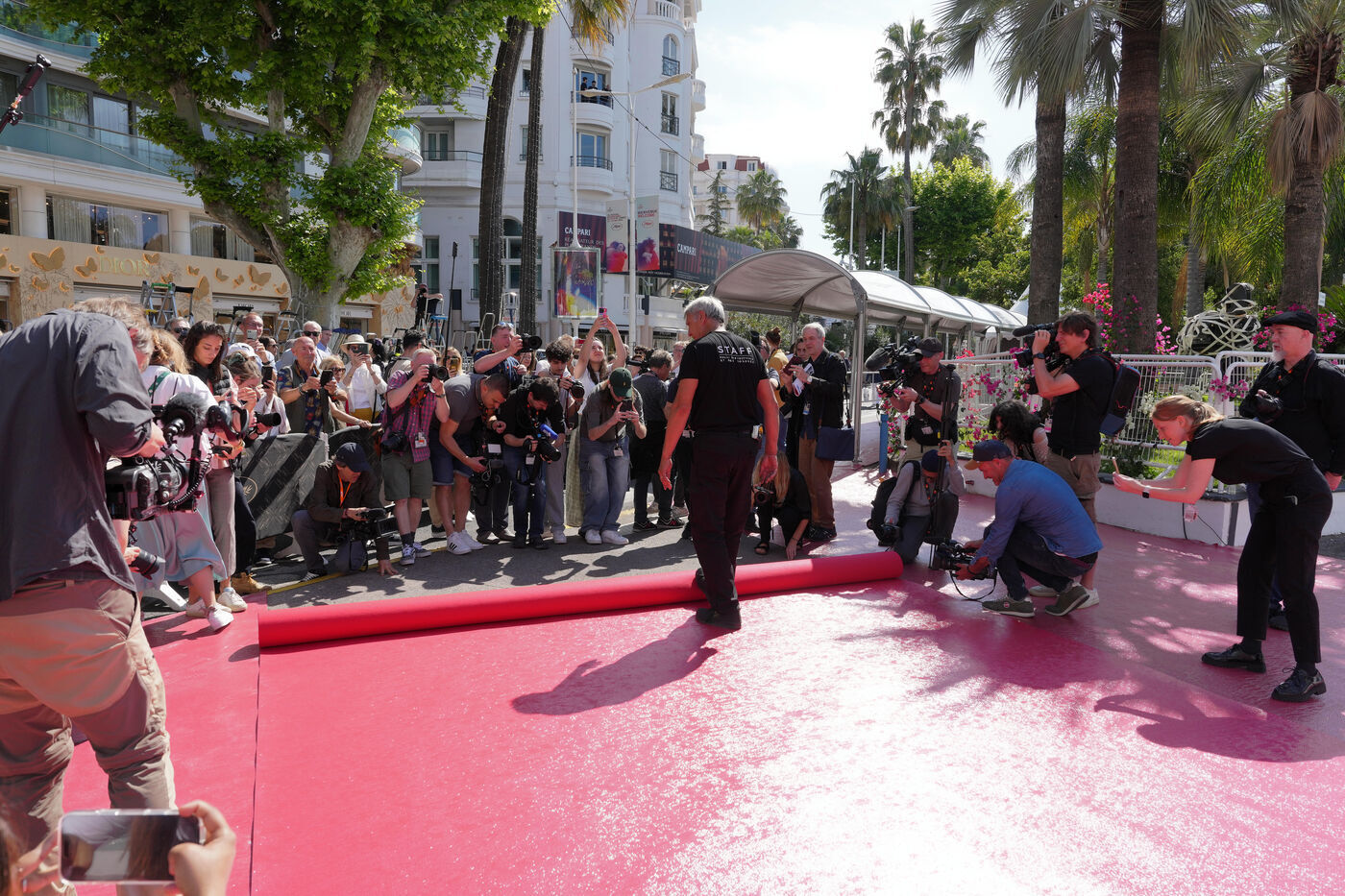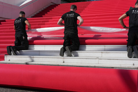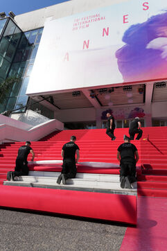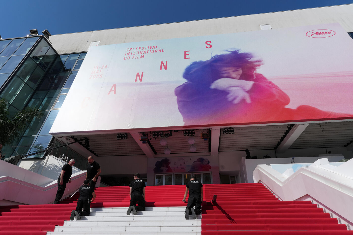 Workers prepare the red carpet to be rolled out ahead of the 78th annual Cannes film festival at Palais des Festivals on May , 2025 in Cannes, France.