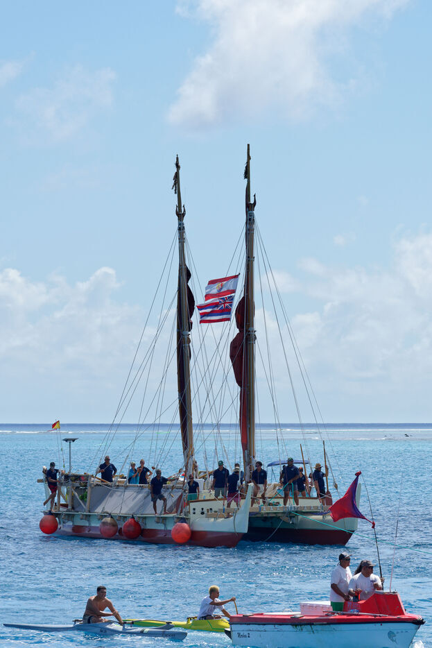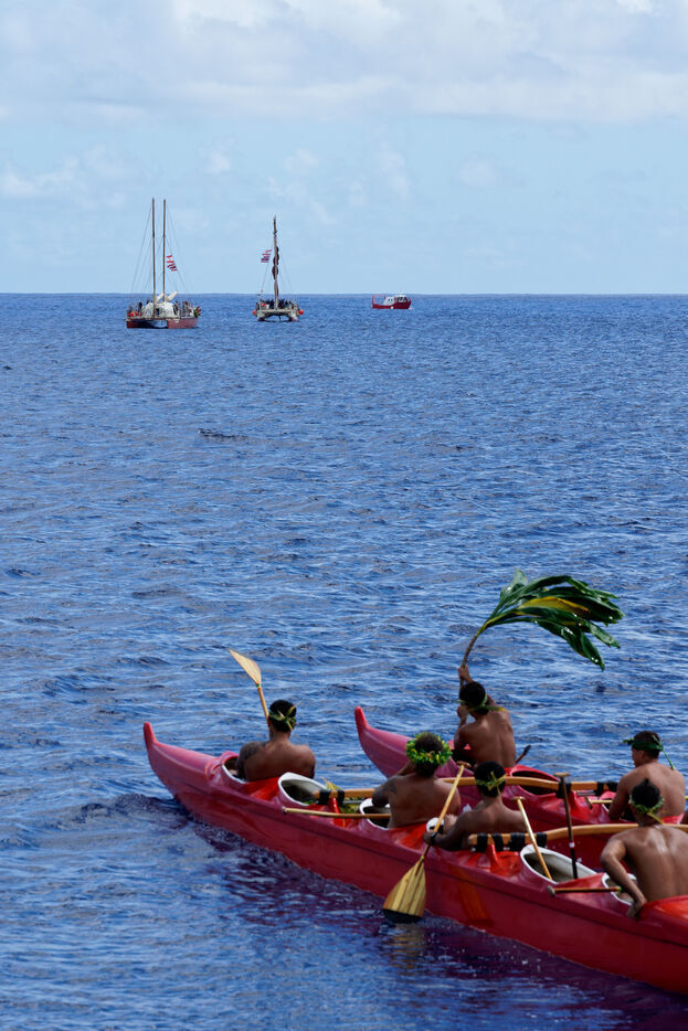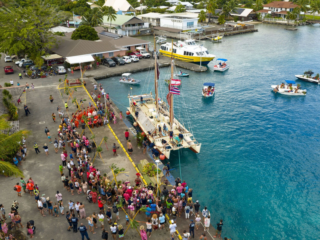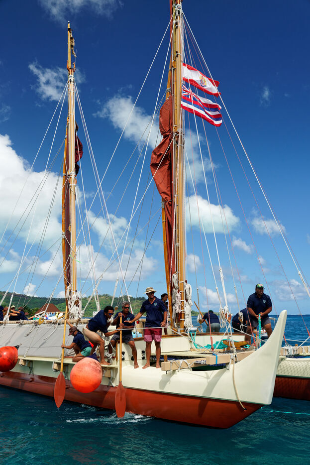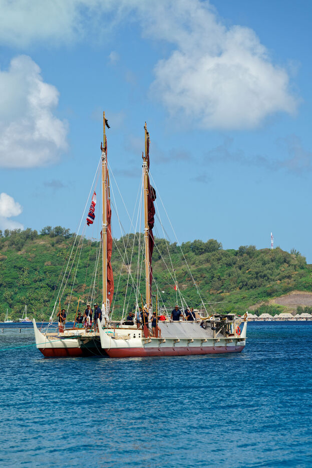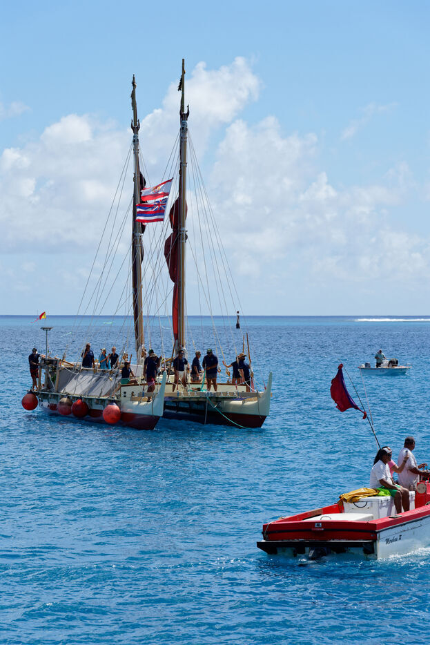 Cérémonie d'accueil des pirogues double traditionnelles polynésiennes Hokule'a - pirogue sans moteur - et Hikianalia - pirogue d'assistance - sur l'île de Bora Bora. Bora Bora est leur dernière étape en Polynésie Française dans le cadre du voyage Moananuiākea, 09 Aout 2025, Bora Bora, Polynésie Française