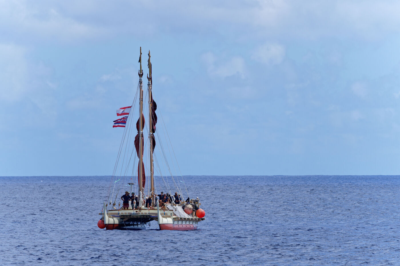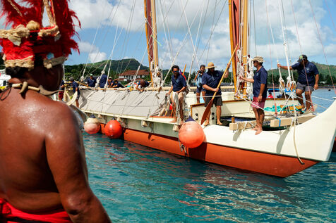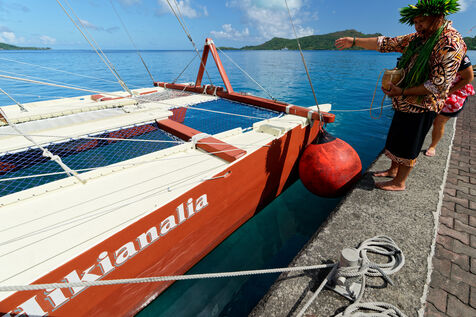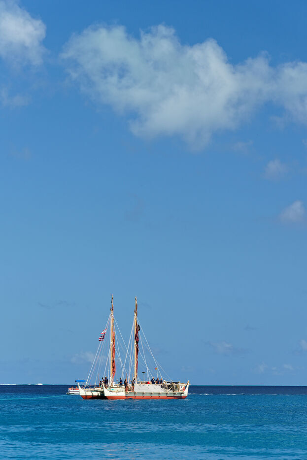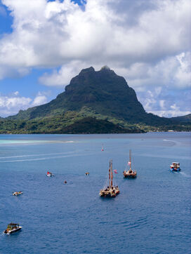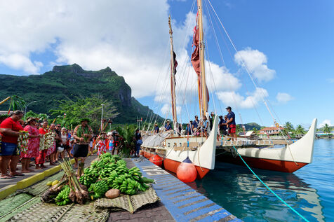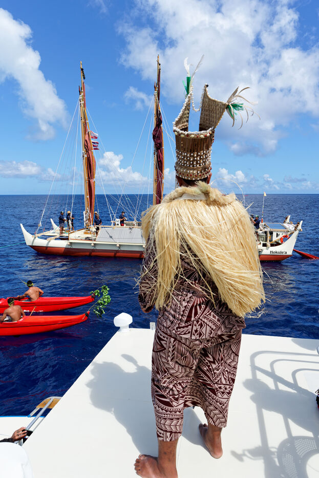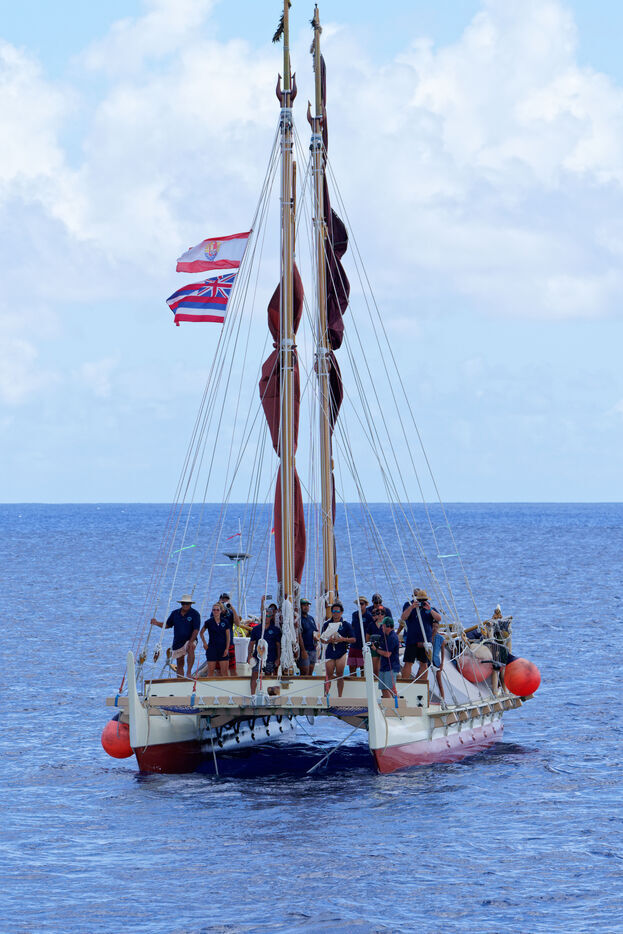 Cérémonie d'accueil des pirogues double traditionnelles polynésiennes Hokule'a - pirogue sans moteur - et Hikianalia - pirogue d'assistance - sur l'île de Bora Bora. Bora Bora est leur dernière étape en Polynésie Française dans le cadre du voyage Moananuiākea, 09 Aout 2025, Bora Bora, Polynésie Française