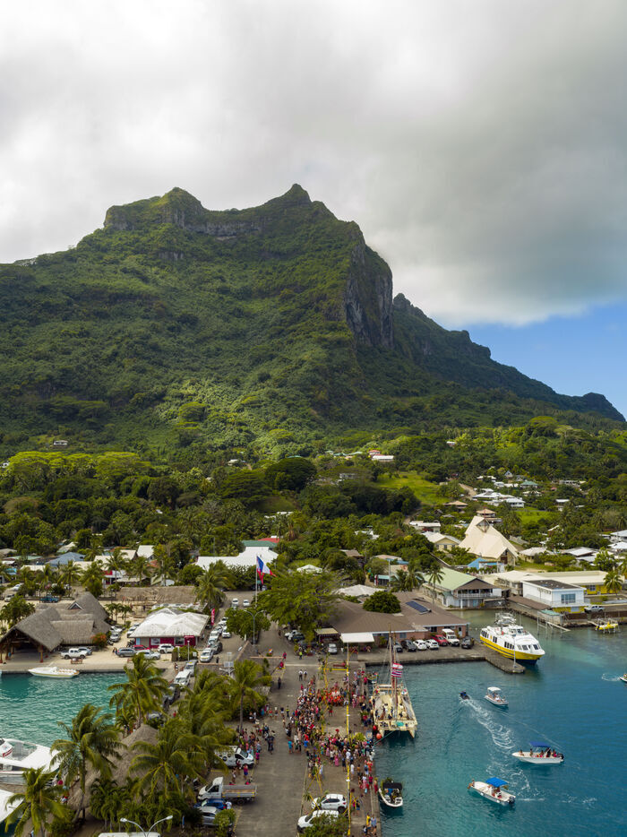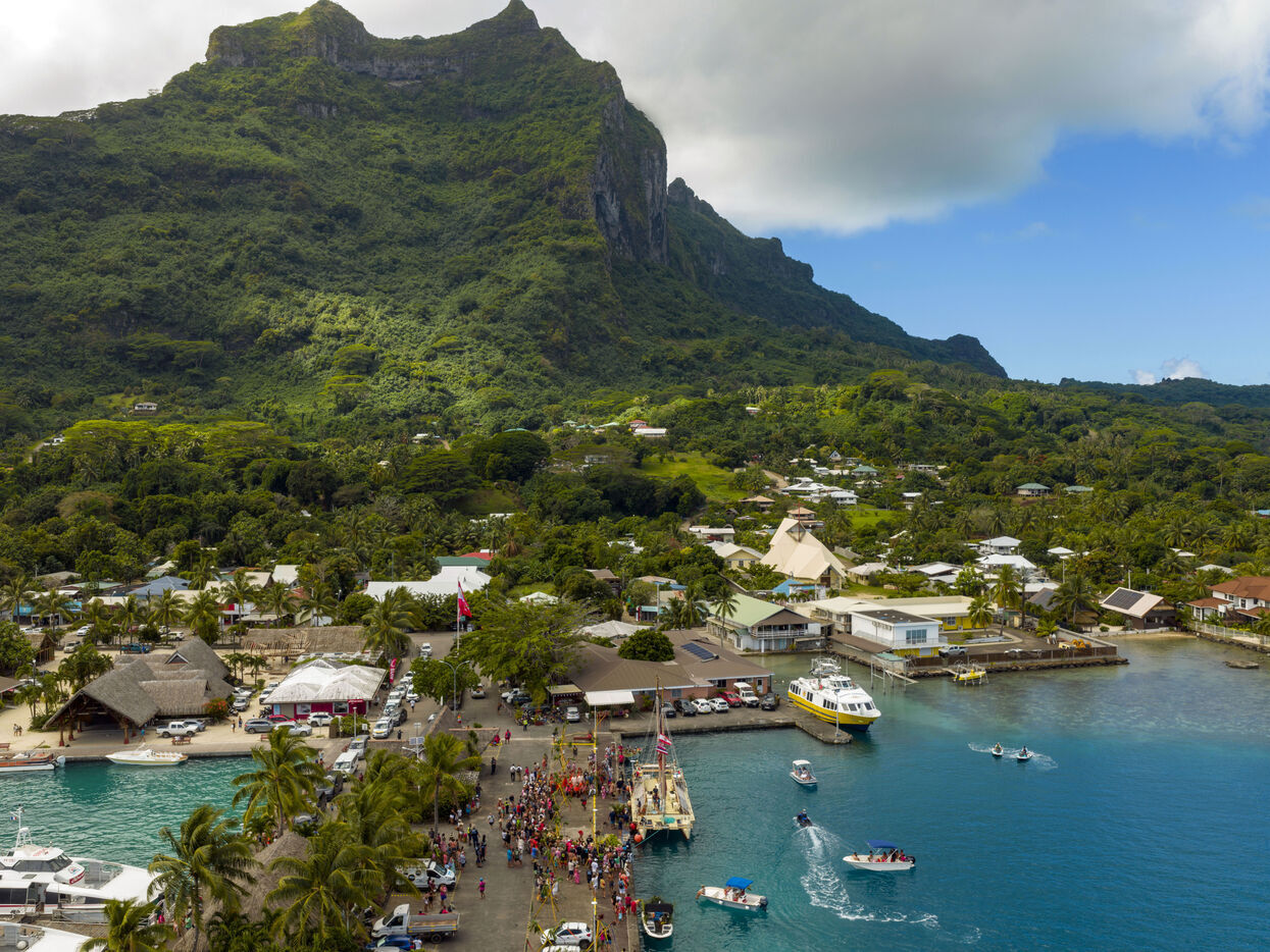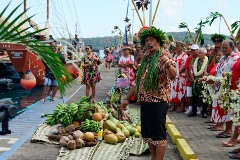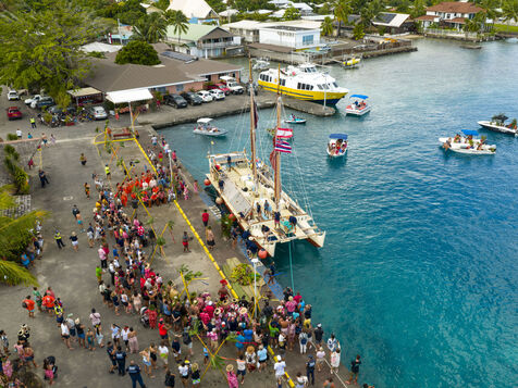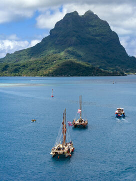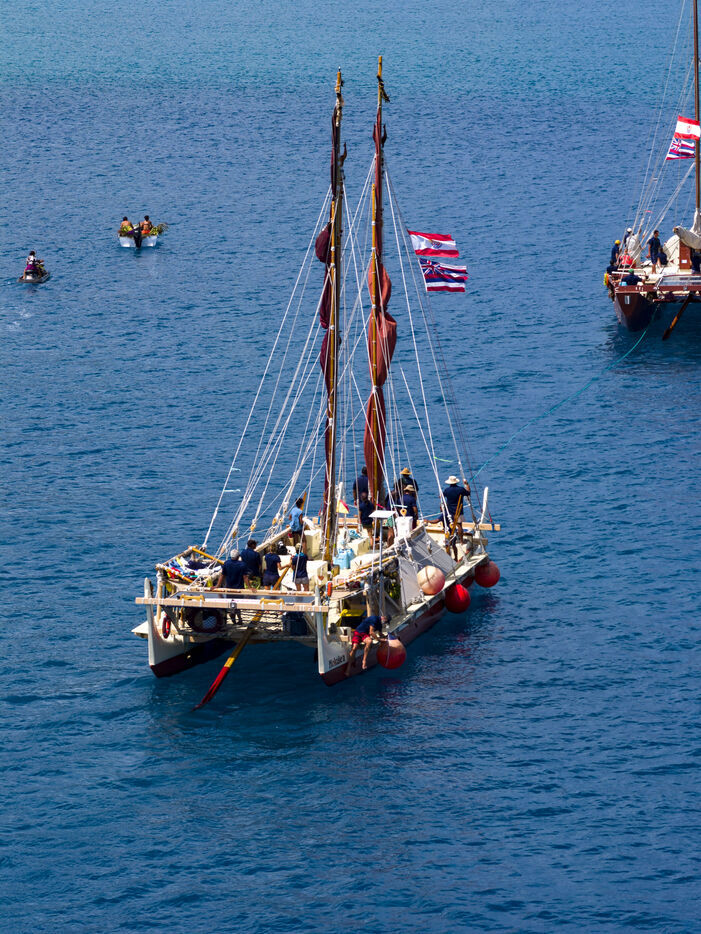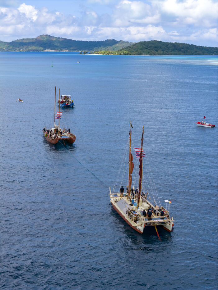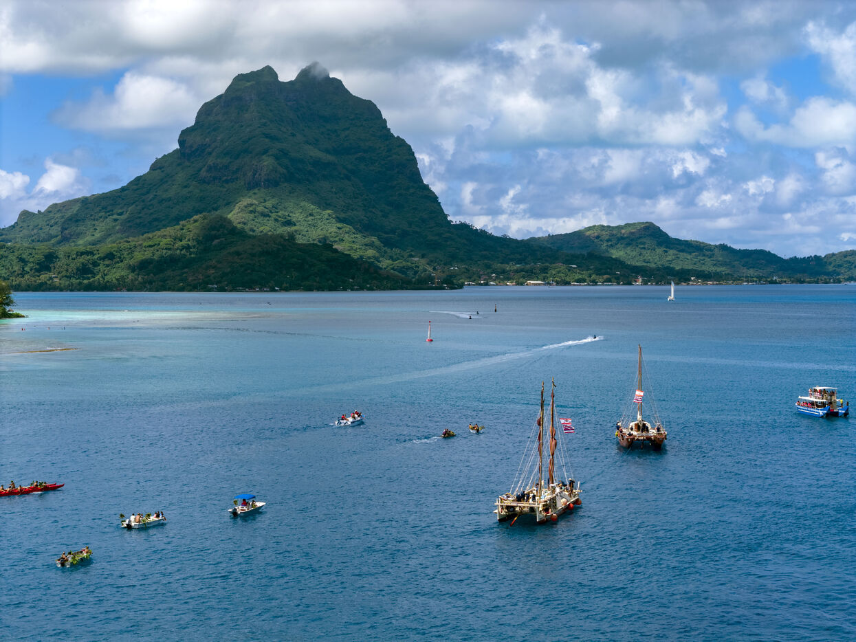 Welcome ceremony for the traditional Polynesian double-hulled canoes Hokule'a - a motorless canoe - and Hikianalia - a support canoe - on the island of Bora Bora. Bora Bora is their final stop in French Polynesia as part of the Moananuiākea voyage, on August 09, 2025 in BORA BORA, French Polynesia.
