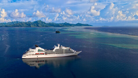 Aerial view taken by drone of the Seabourn Quest cruise ship maneuvering in the lagoon between Raiatea and Tahaa, opposite the Uturoa cruise terminal on the island of Raiatea on March 17, 2026 in French Polynesia.