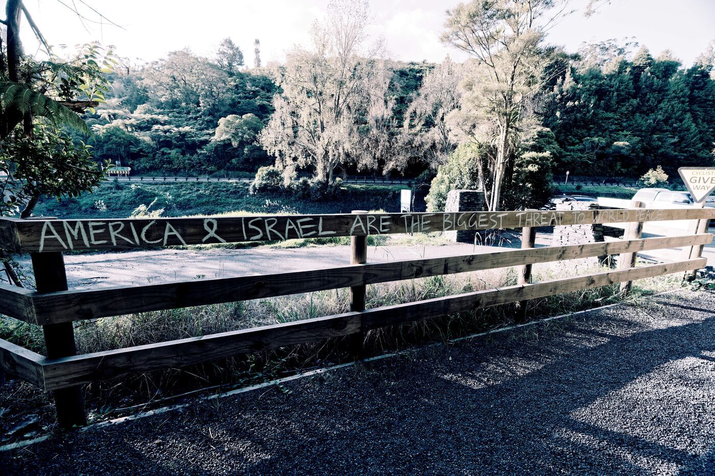 “America and Israel are the biggest threat to world peace”: a distorted version of a quote by Noam Chomsky, visible on a fence near the Owharoa Falls, located in the Karangahake Gorge, near Waihi, in the Bay of Plenty region of New Zealand, on April 3, 2026