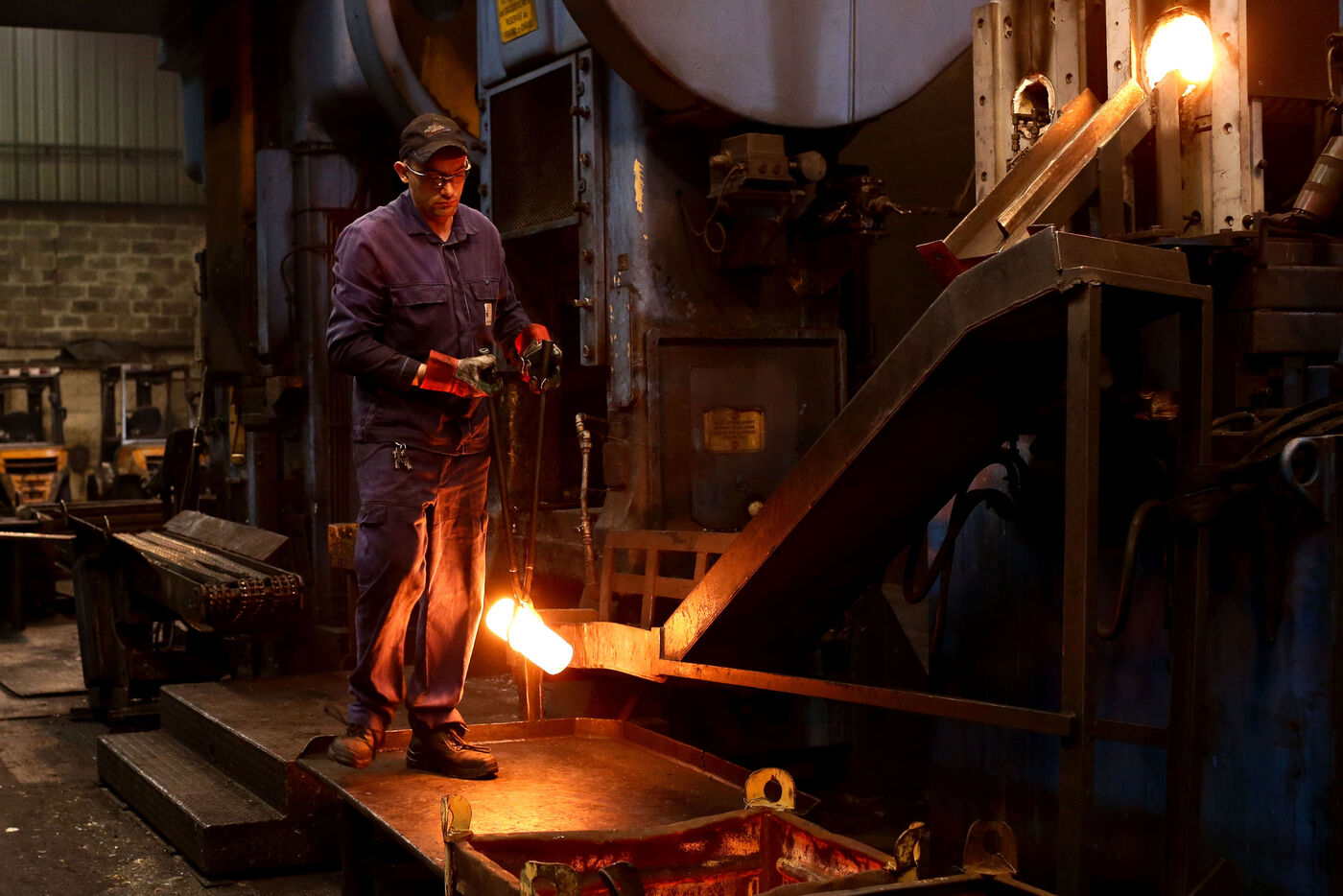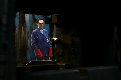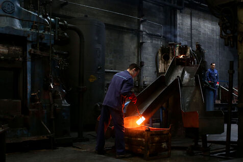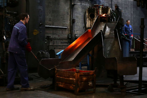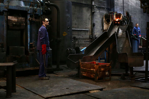Employees works in the enterprise Lebronze Alloys forges in Trie-Chateau northern France on April 3 2015. Lebronze alloys is an industrial group specialising in the production of semi-finished and finished products in high-performance technical copper and nickel alloys.
